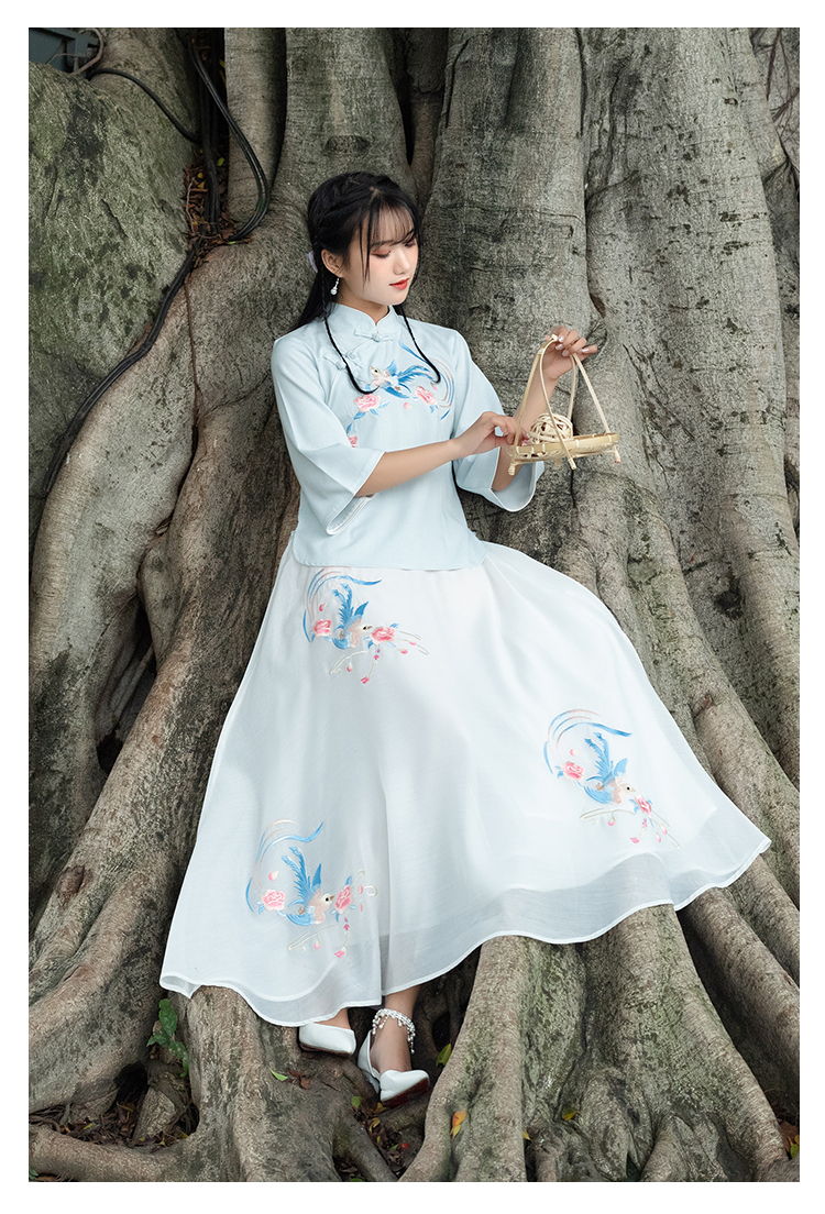 2020春夏新款小清新民族風復古繡花高腰雙層大擺裙半身裙仙女長裙1入
