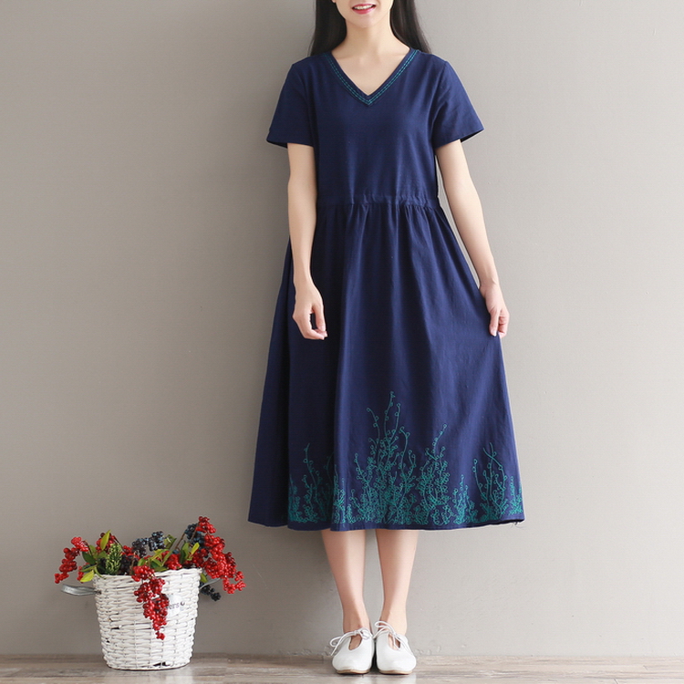 2020夏季新款學生復古文藝繡花森女文藝V領中長款大擺連衣裙百搭1入