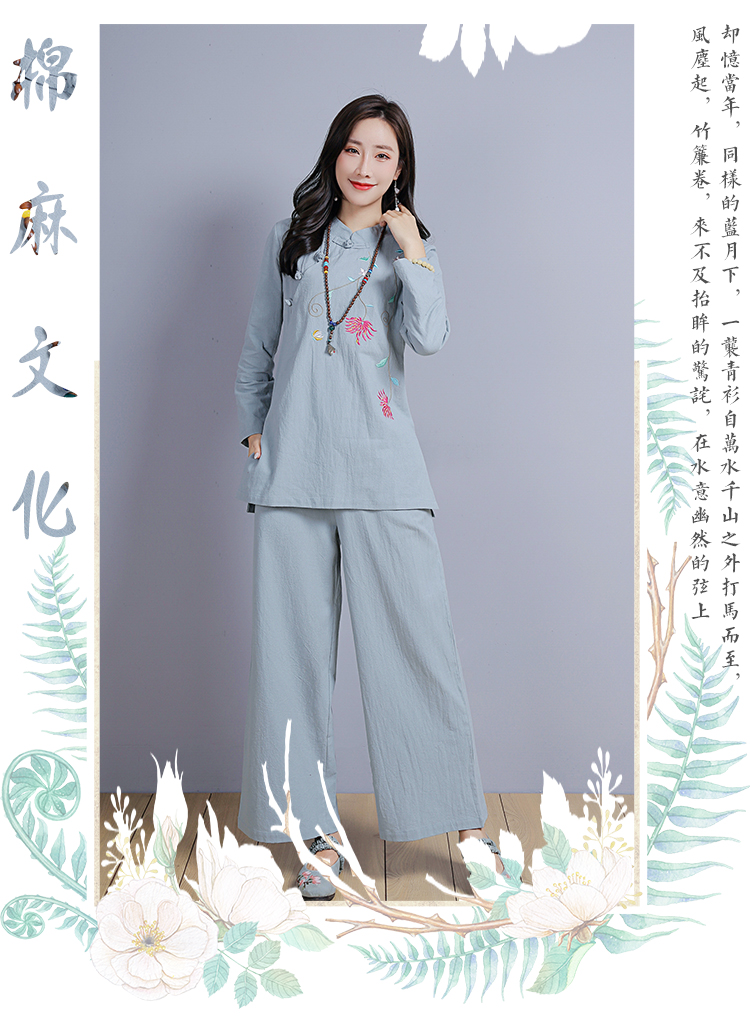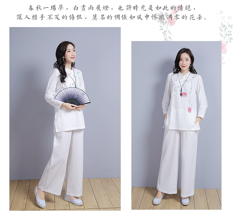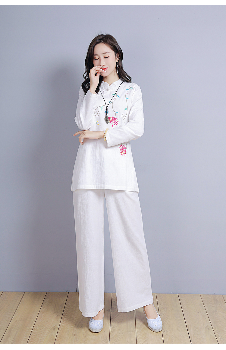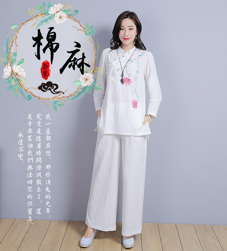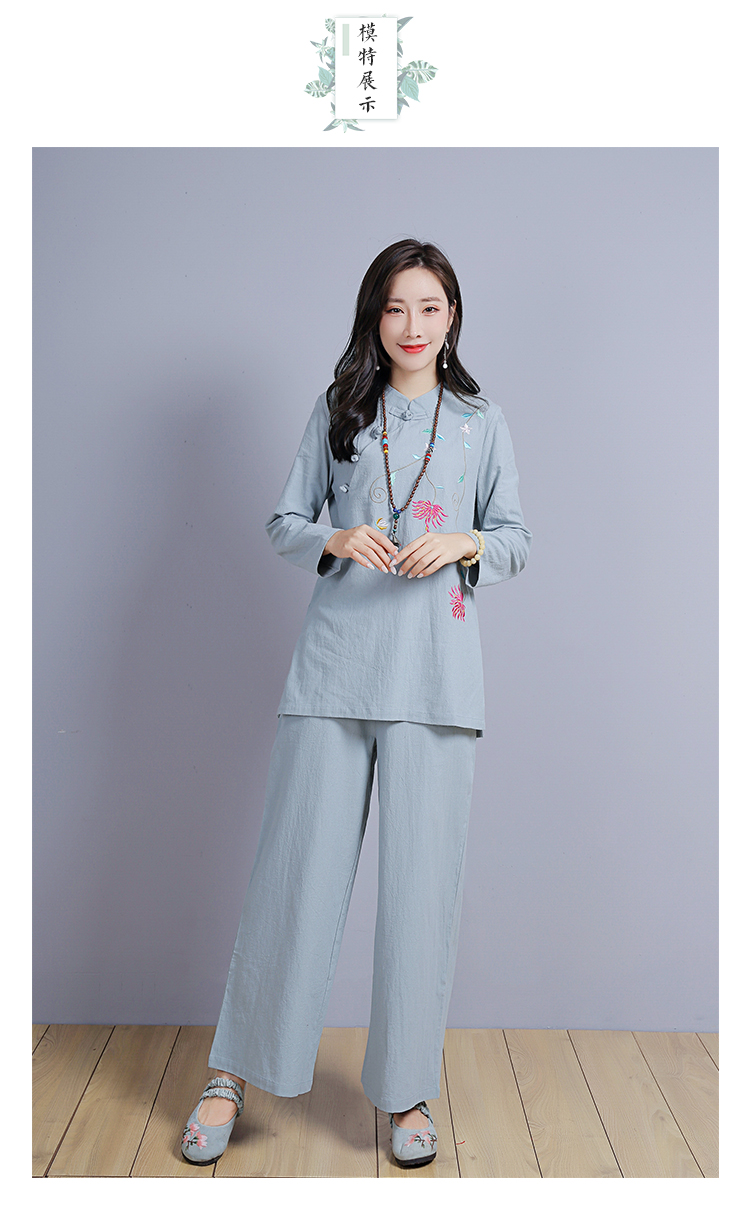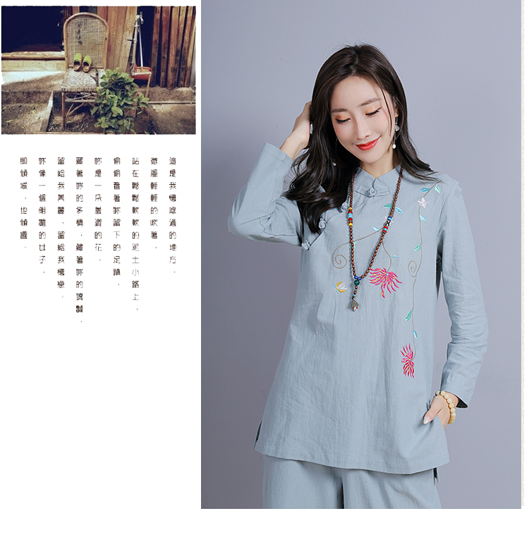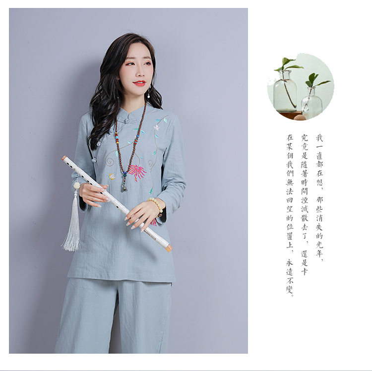 2019秋裝新款中國風復古民族風禪意棉麻刺繡茶服上衣+長褲套裝女1入