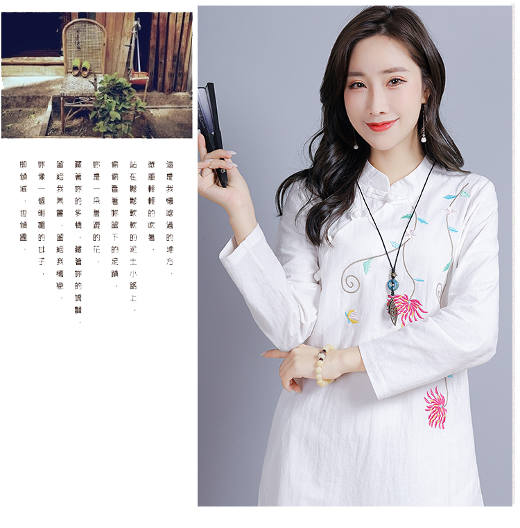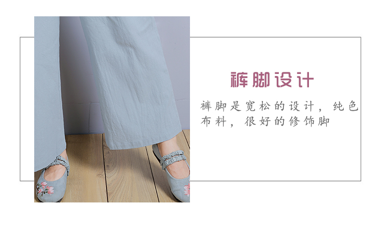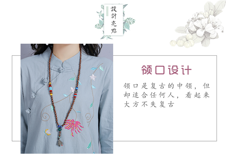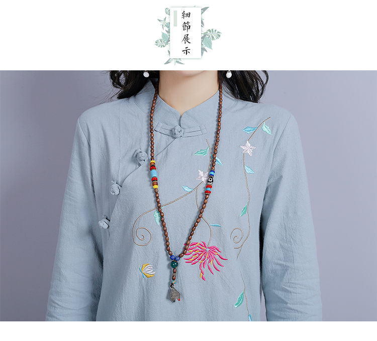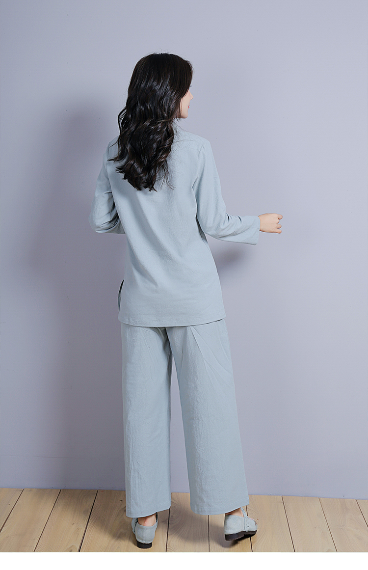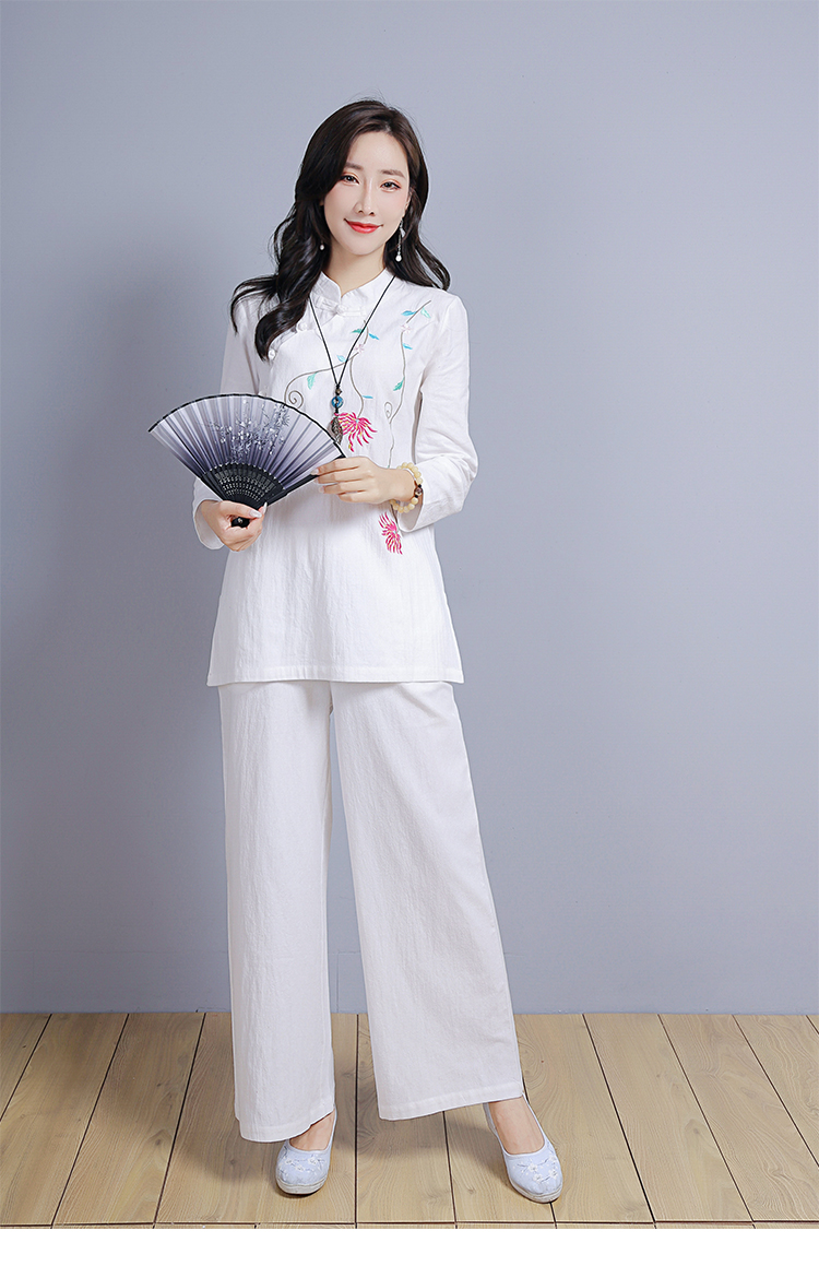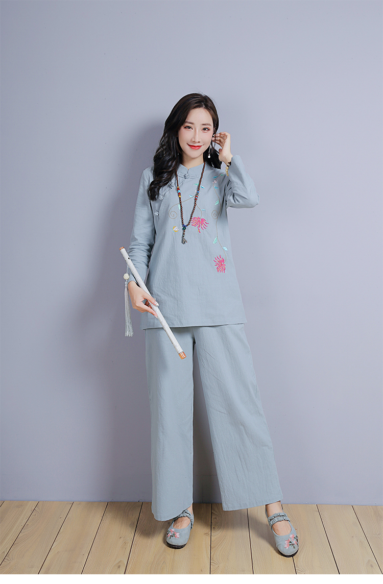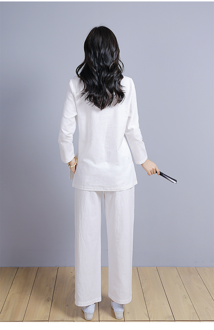 2019秋裝新款中國風復古民族風禪意棉麻刺繡茶服上衣+長褲套裝女1入