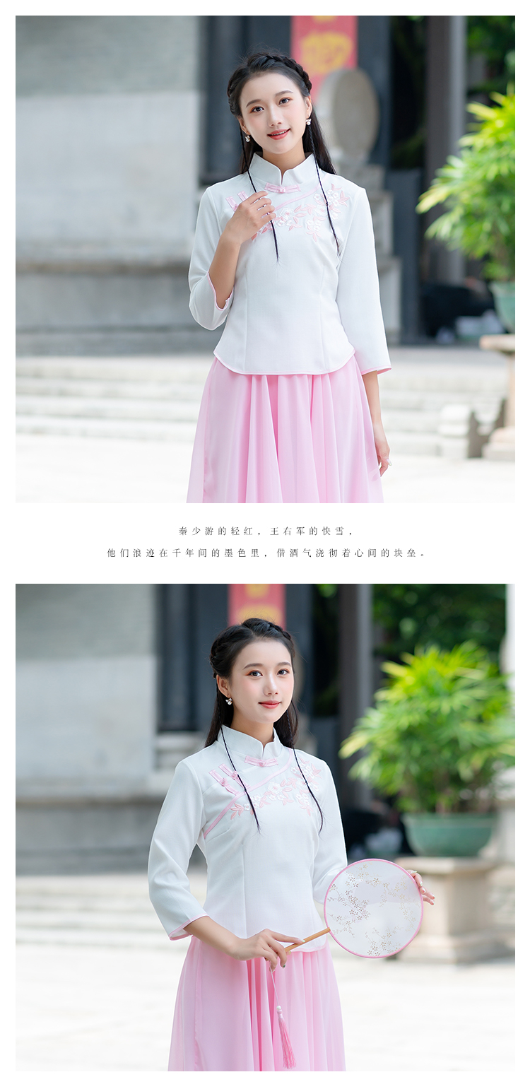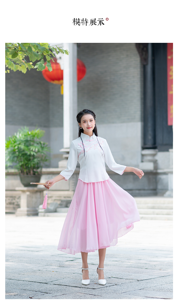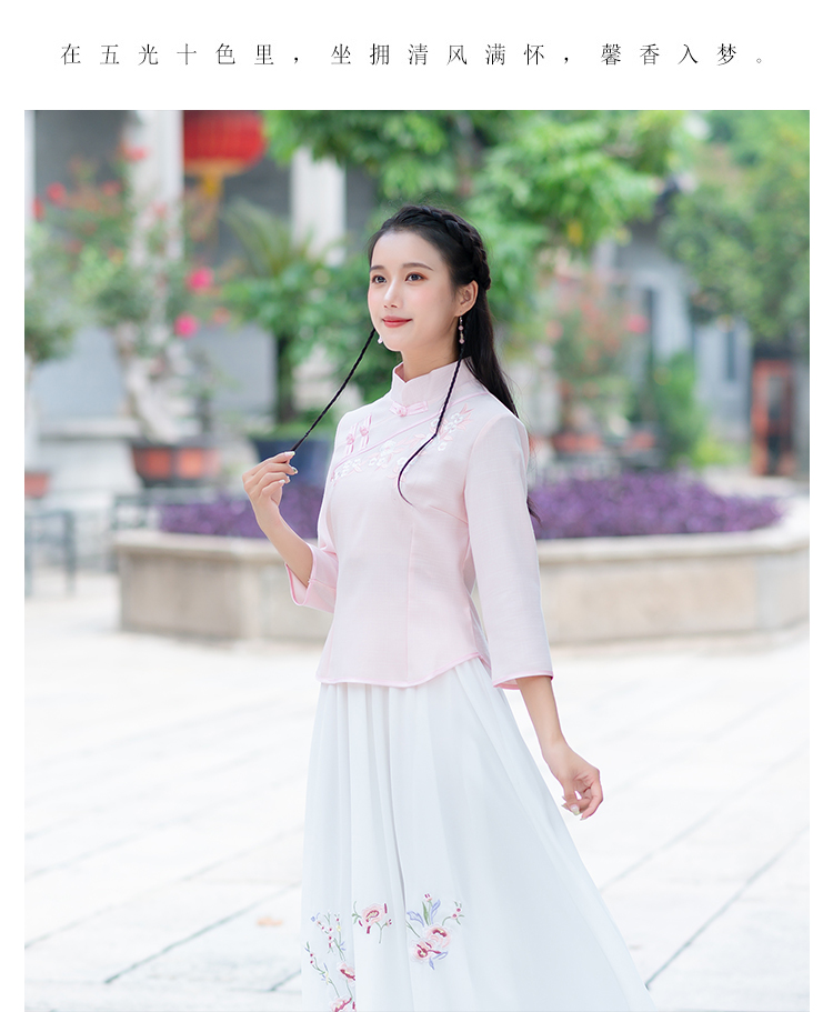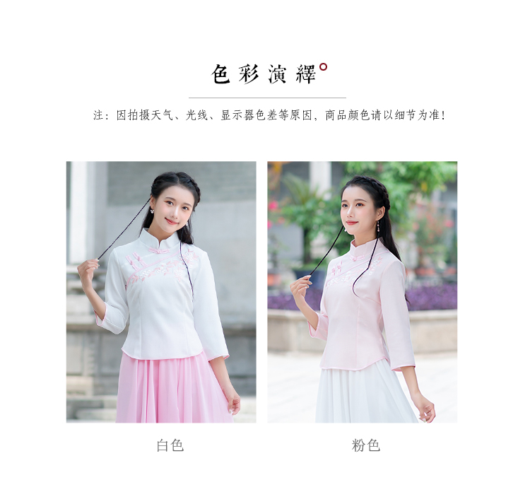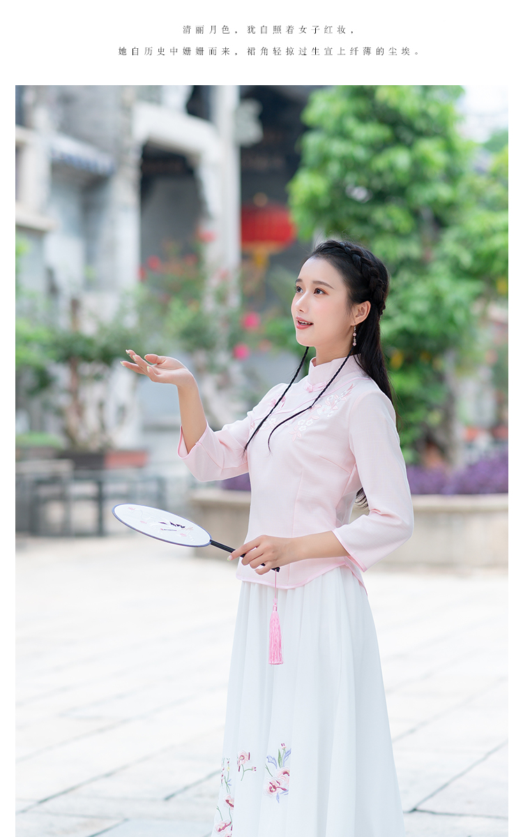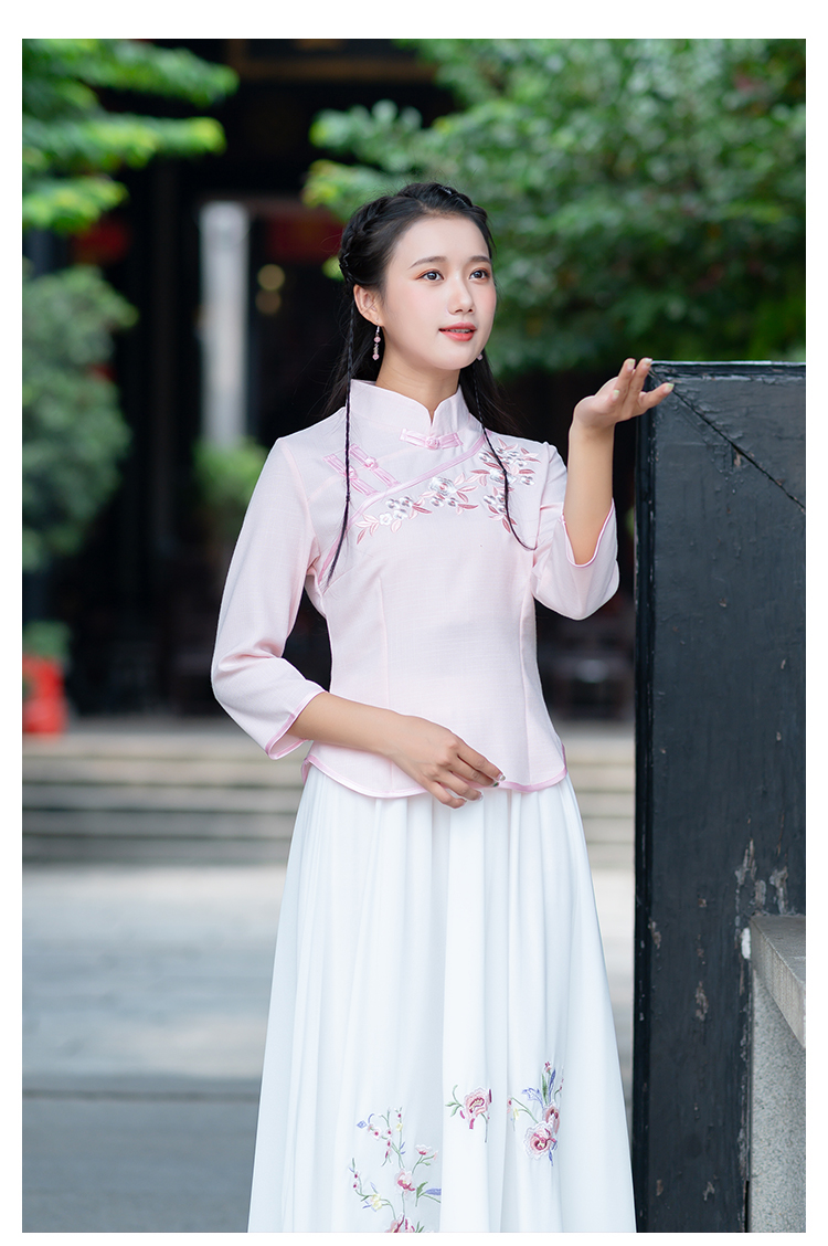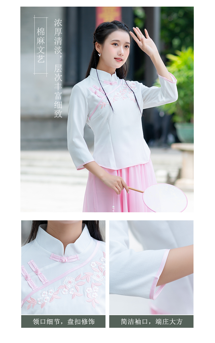 2020夏季新款中國風女學生文藝復古中式盤扣繡花唐裝旗袍襯衫上衣1入