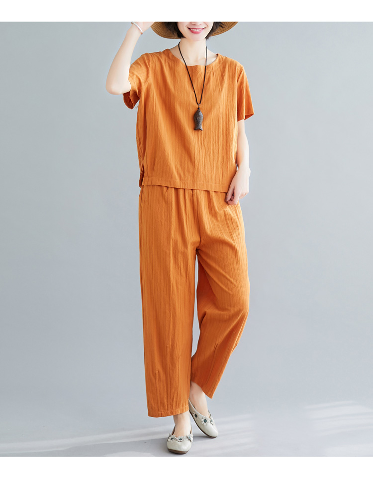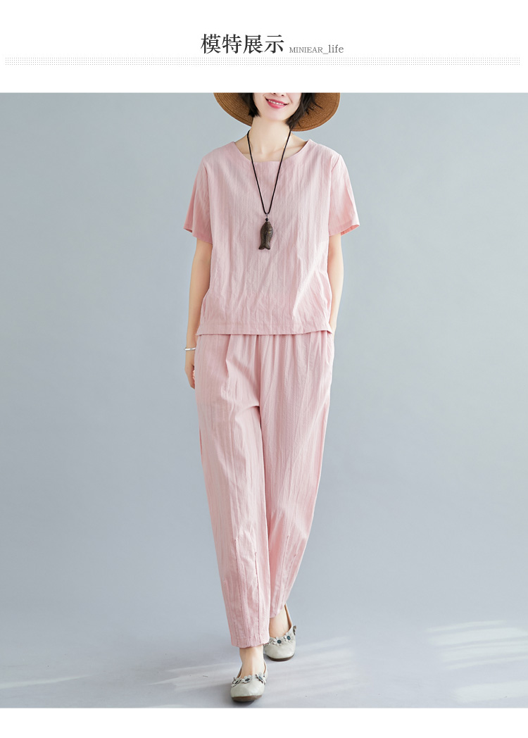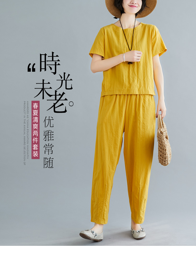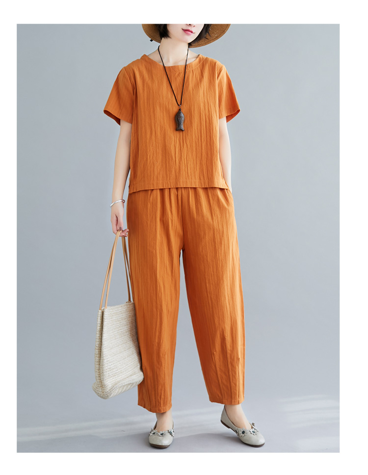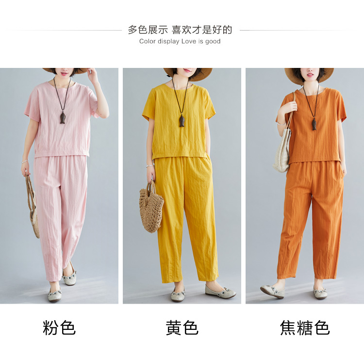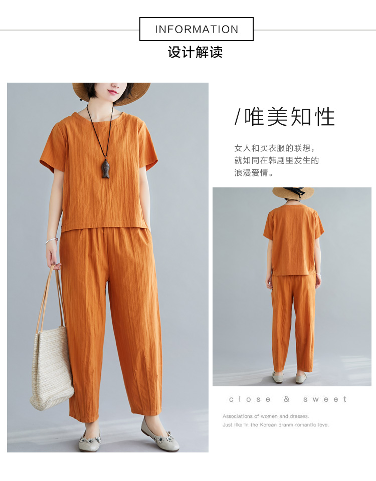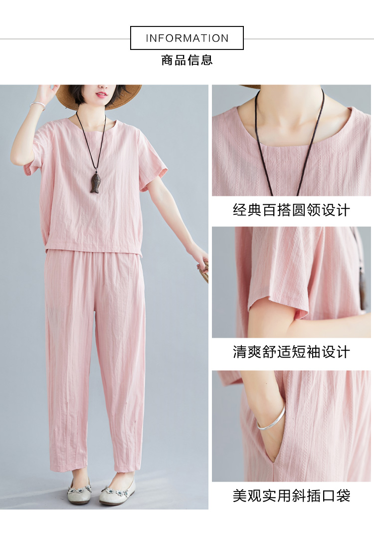 2020夏季新款韓版大碼女裝文藝復古寬松休閑短袖九分褲兩件套裝女1入