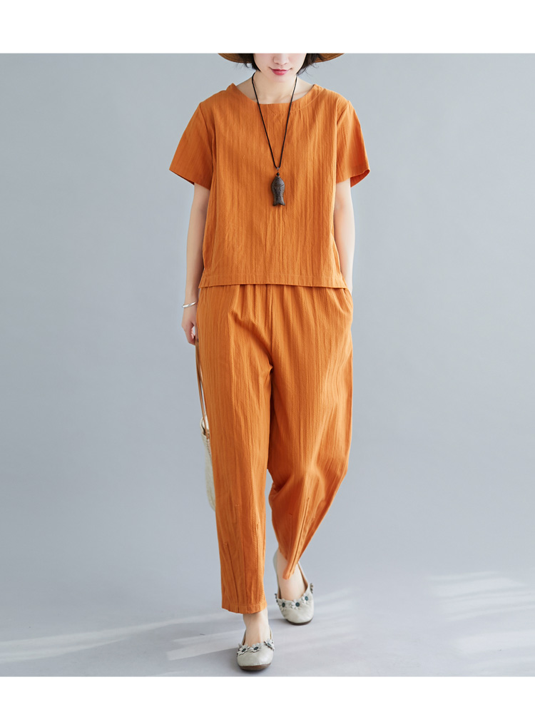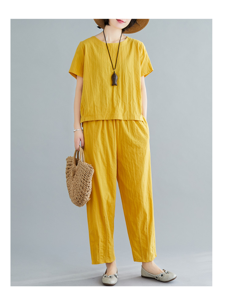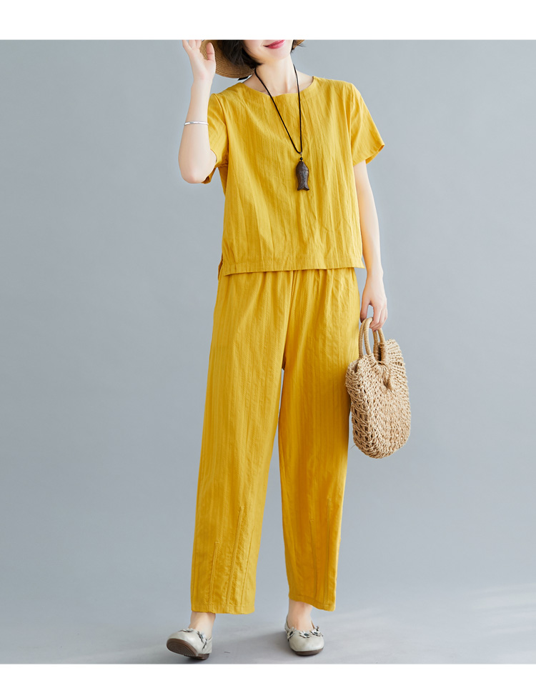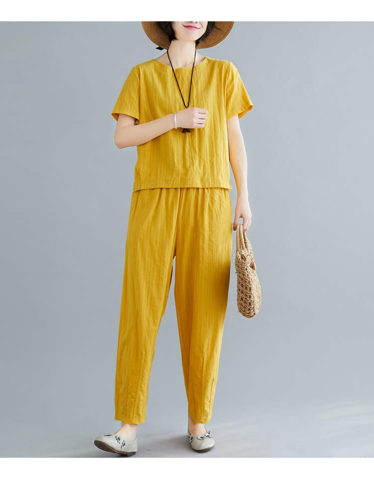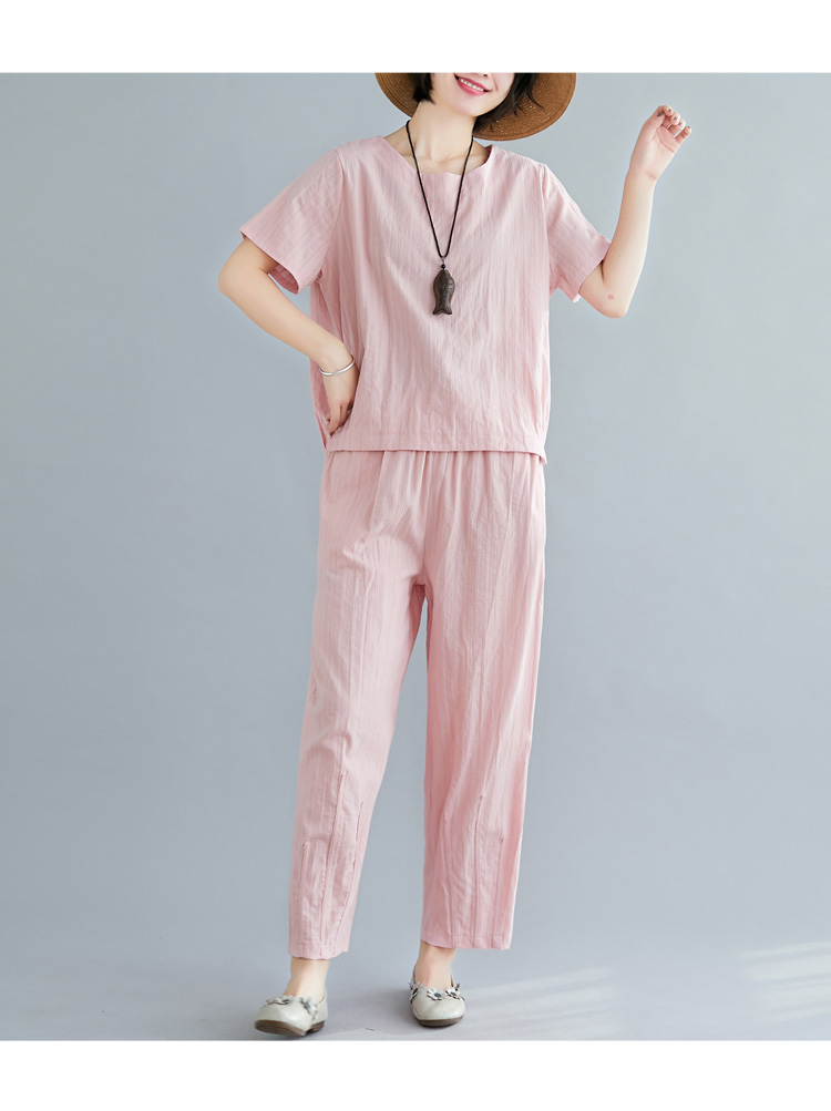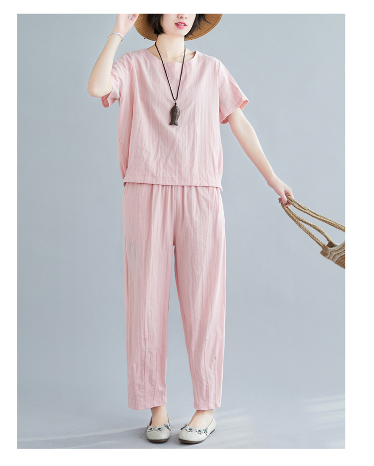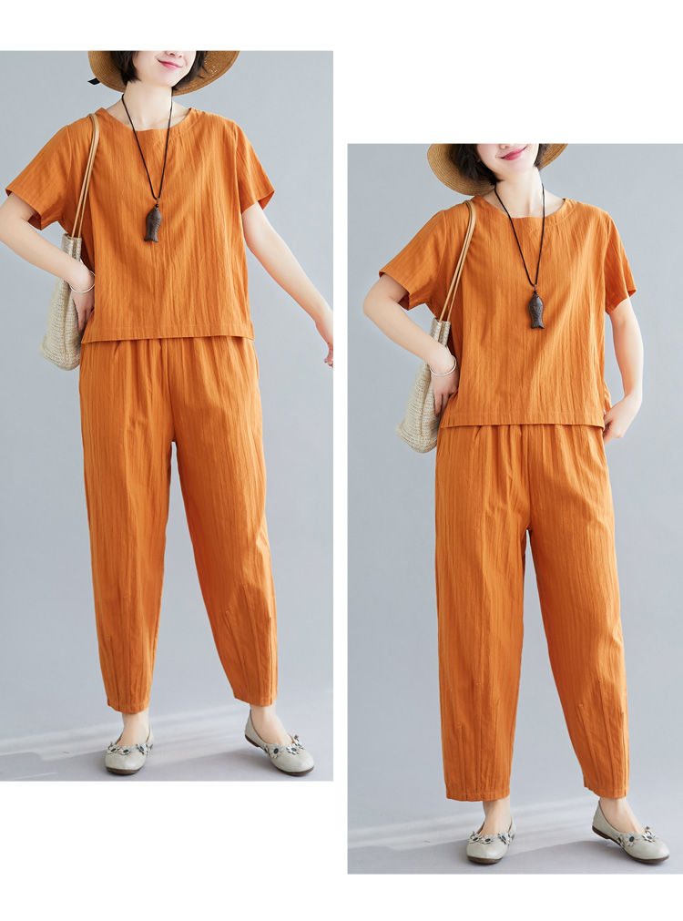 2020夏季新款韓版大碼女裝文藝復古寬松休閑短袖九分褲兩件套裝女1入
