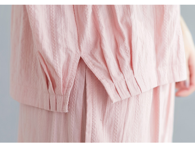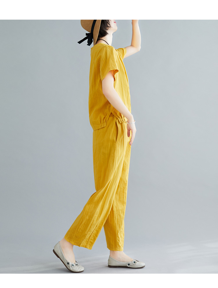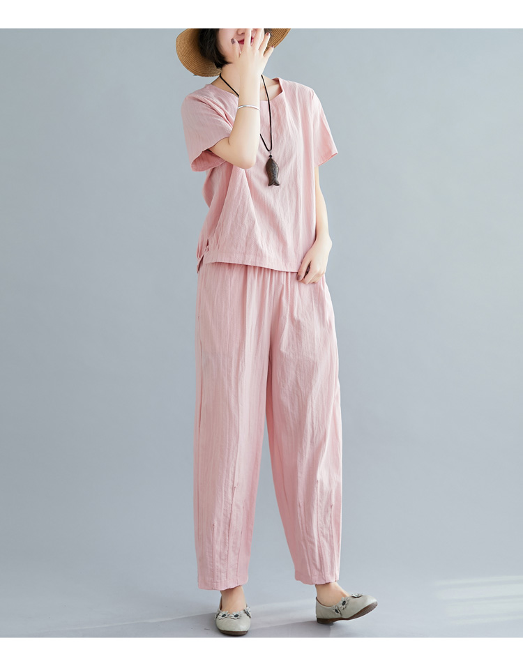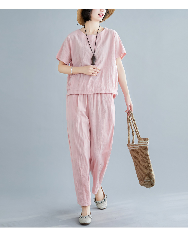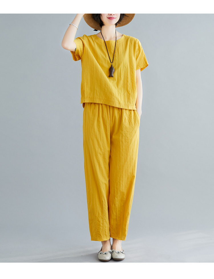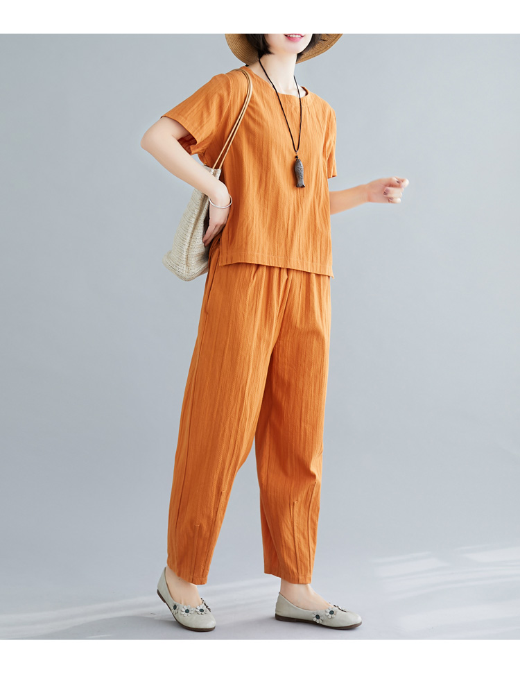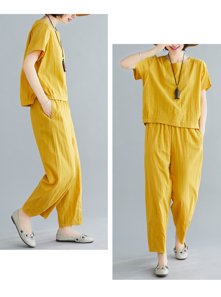 2020夏季新款韓版大碼女裝文藝復古寬松休閑短袖九分褲兩件套裝女1入