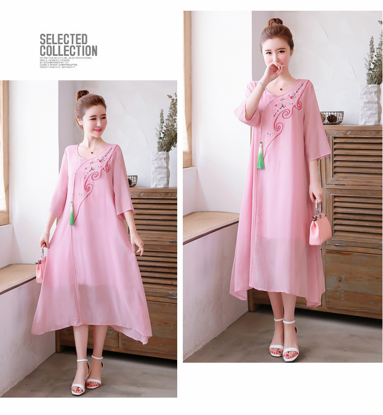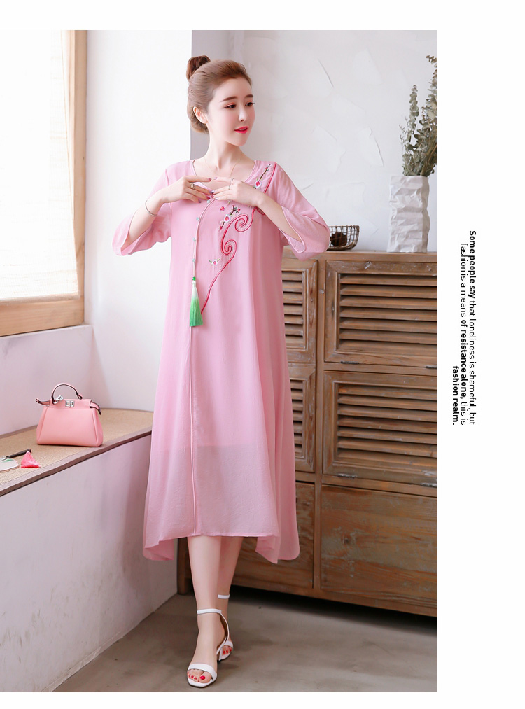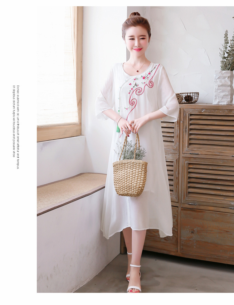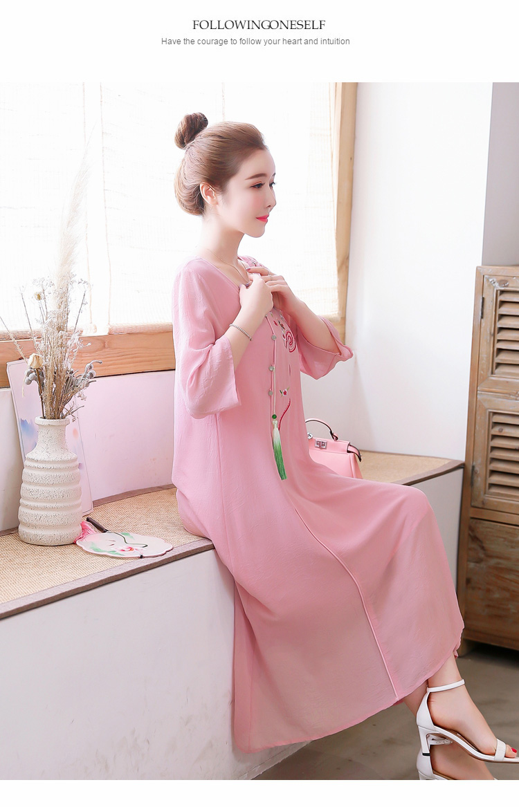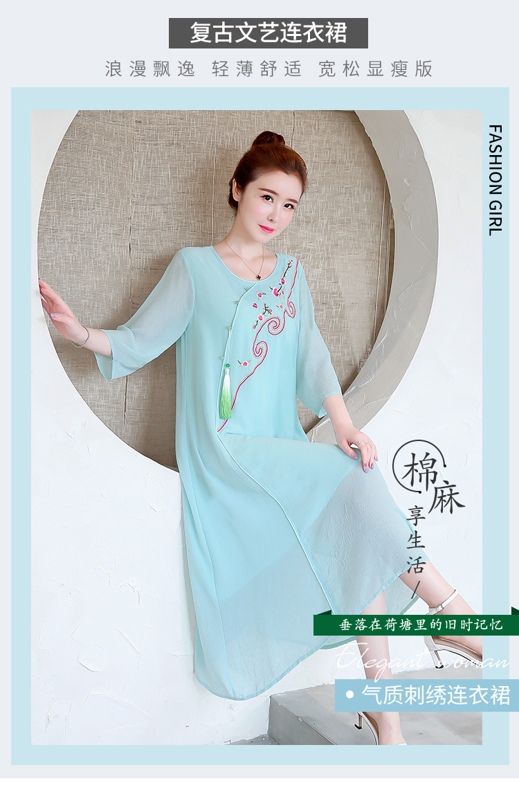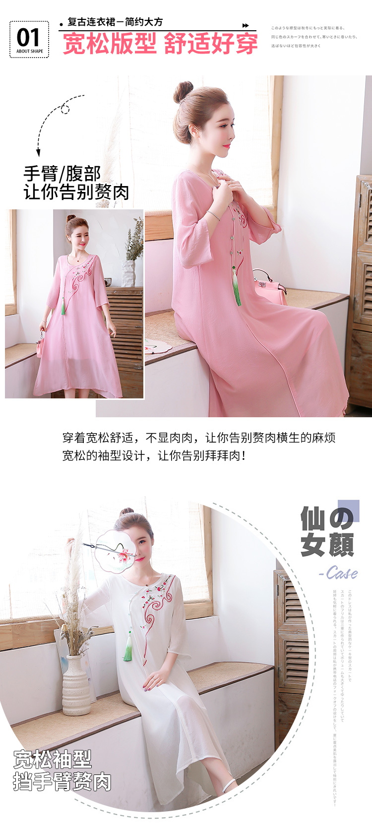 2020夏季新款中國風女學生棉麻連衣裙大碼民族風復古刺繡寬松長裙1入