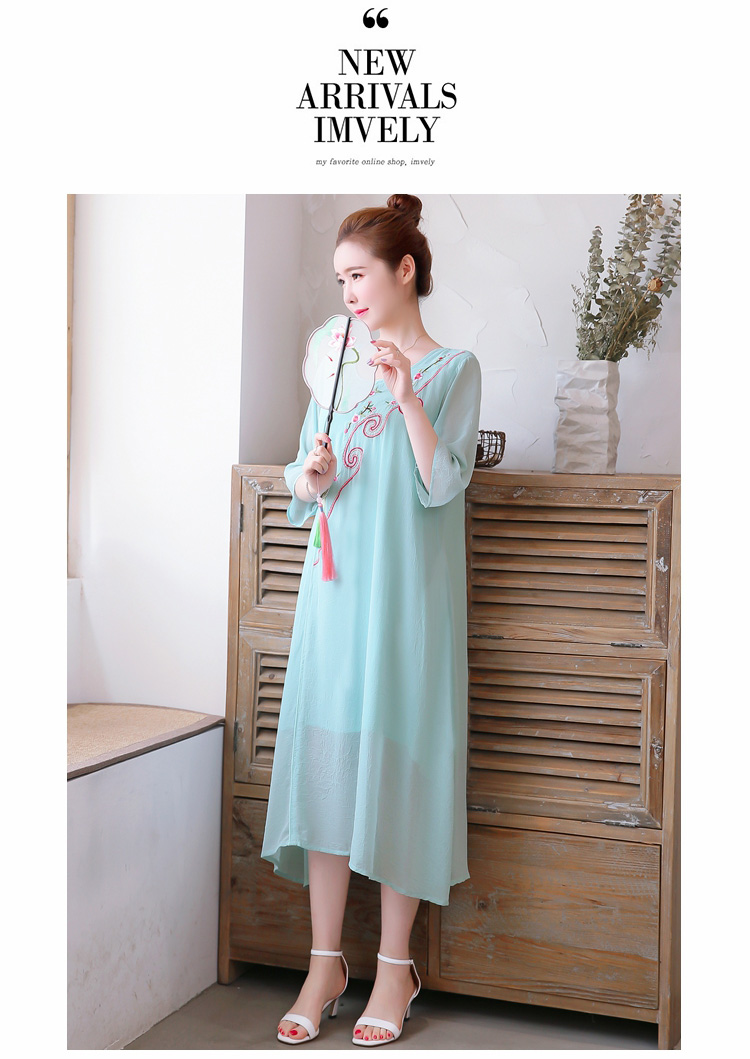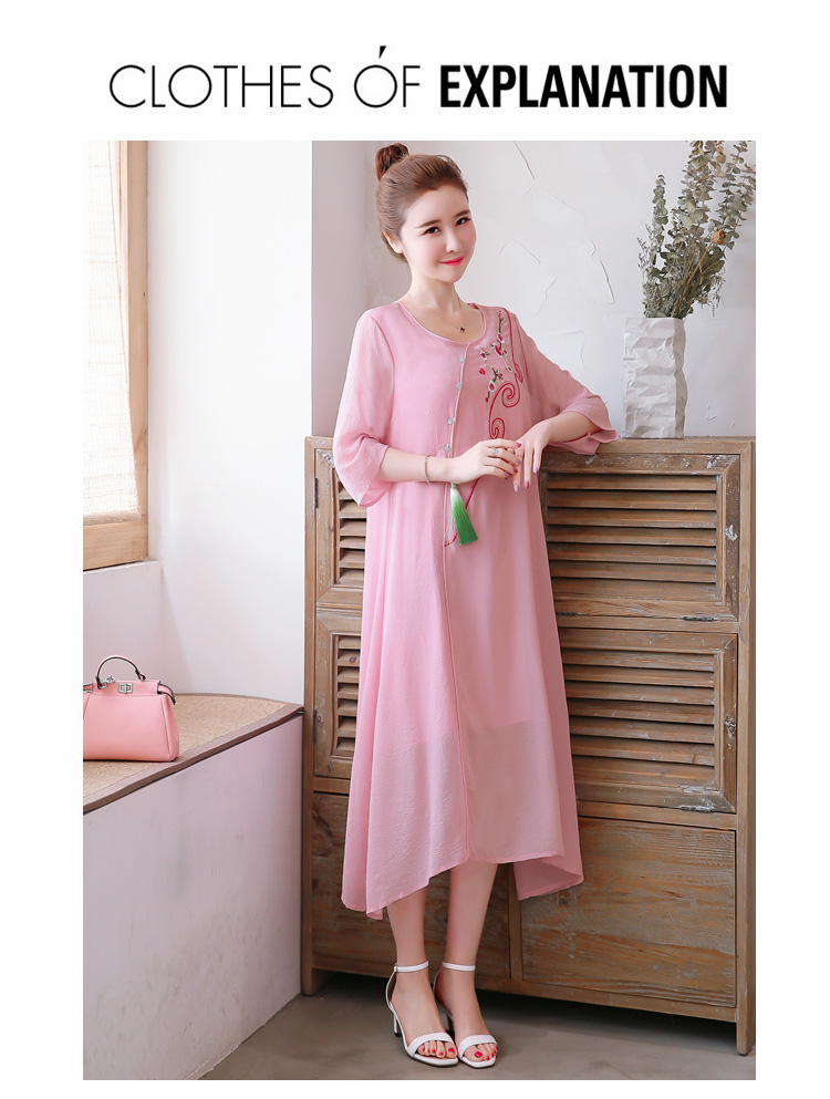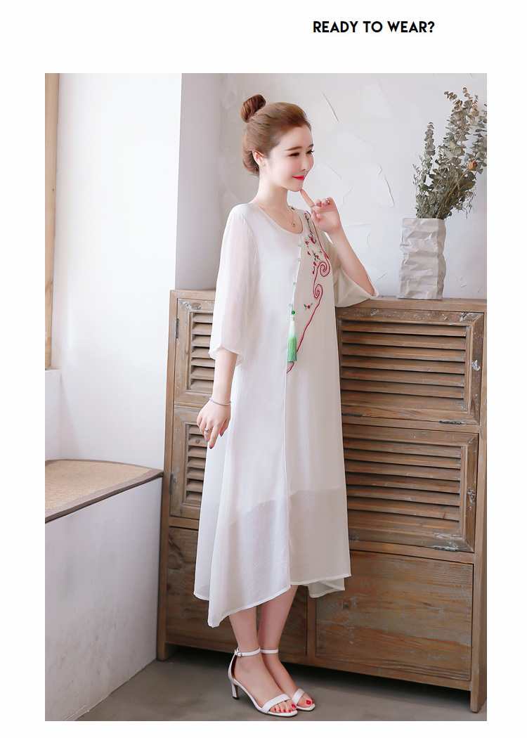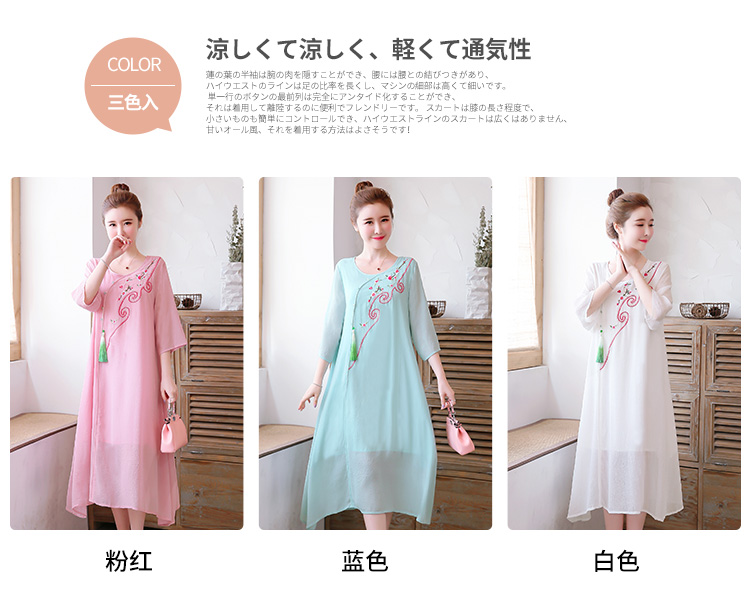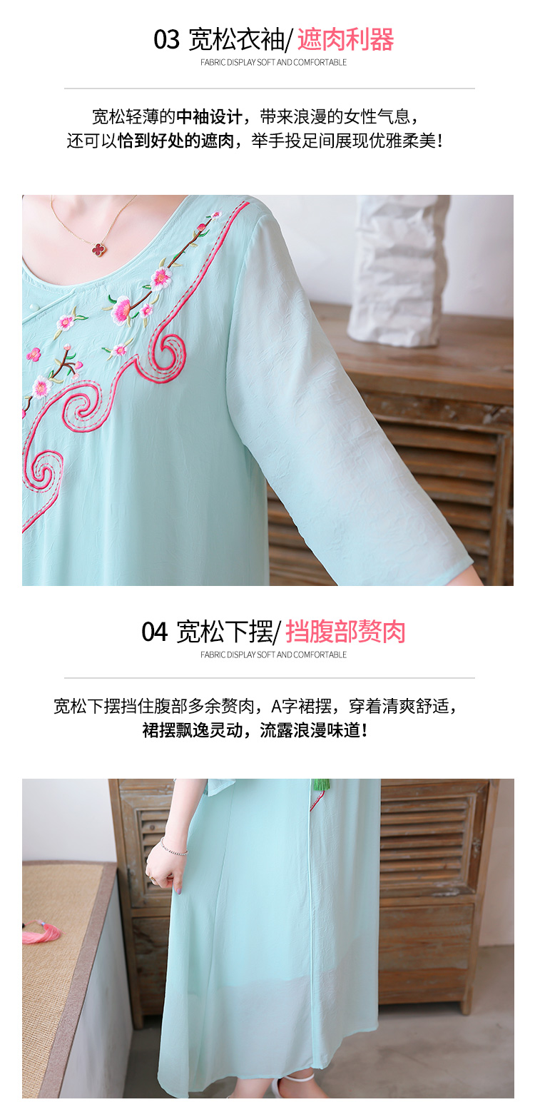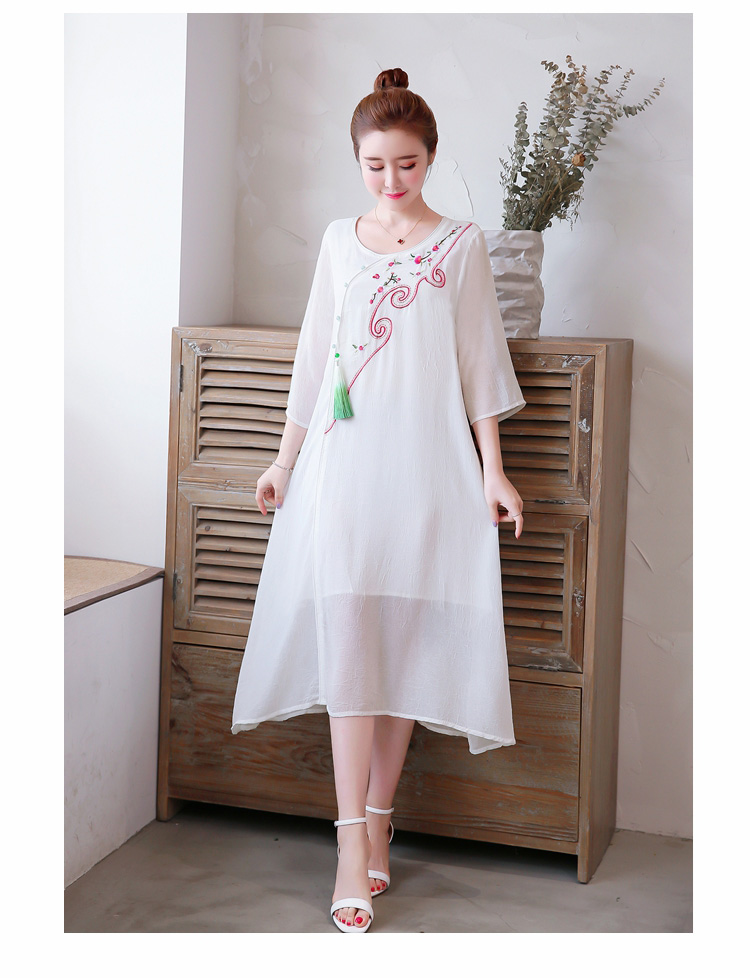2020夏季新款中國風女學生棉麻連衣裙大碼民族風復古刺繡寬松長裙1入
