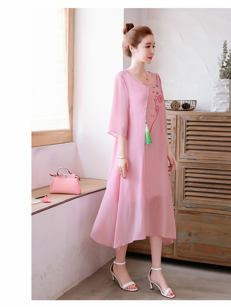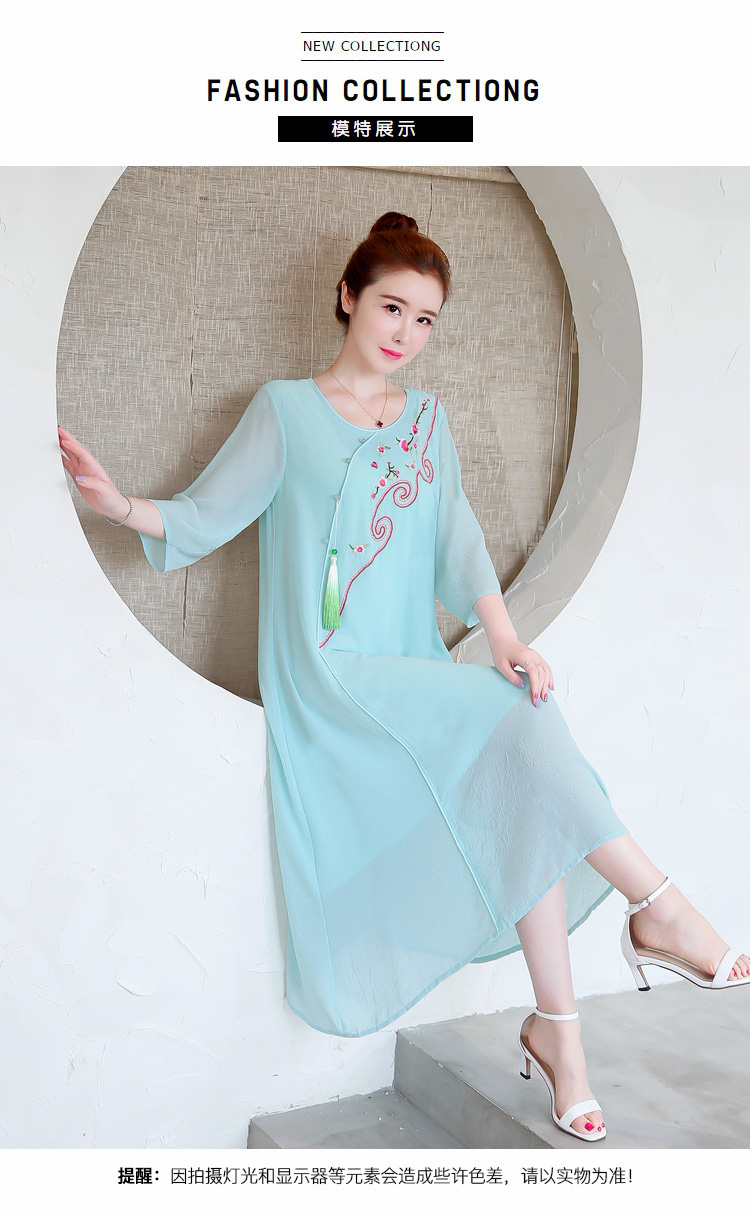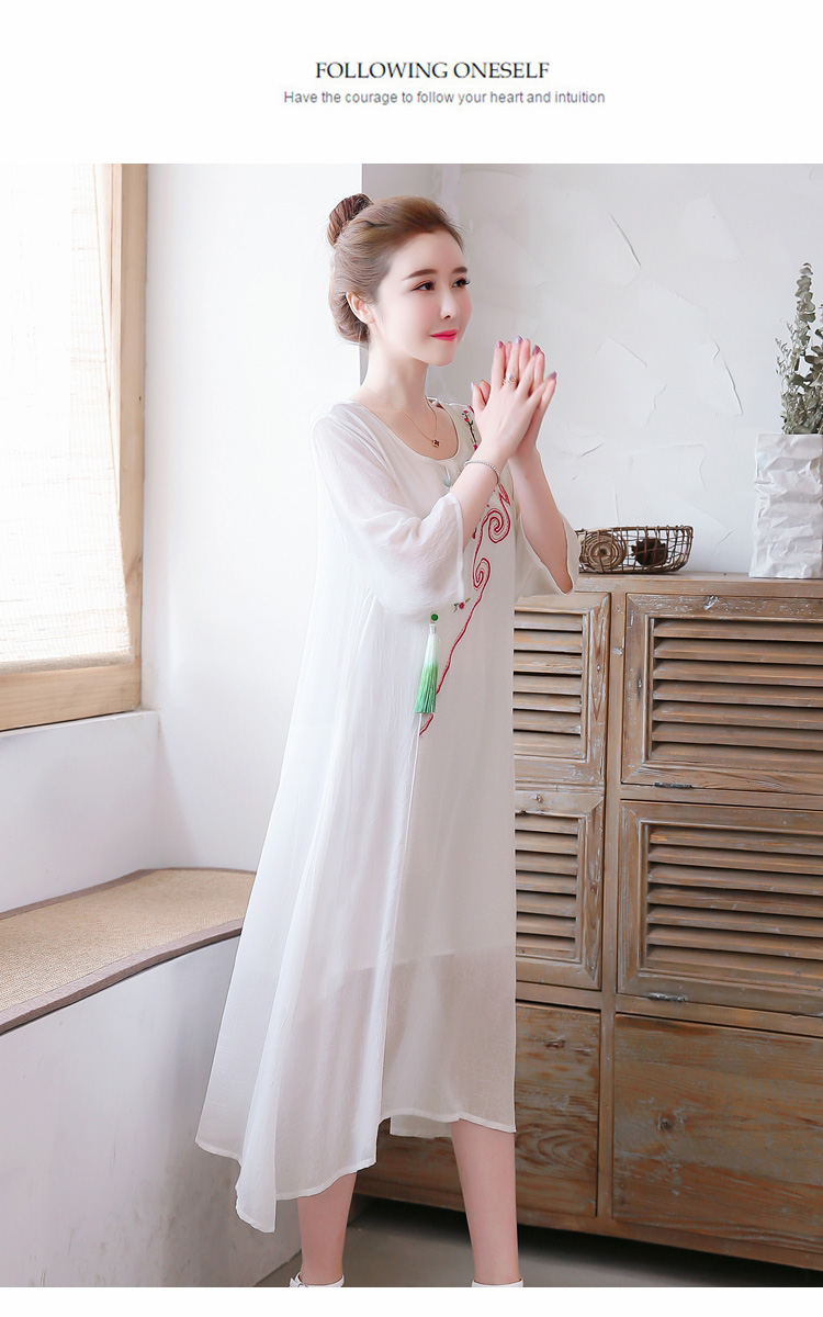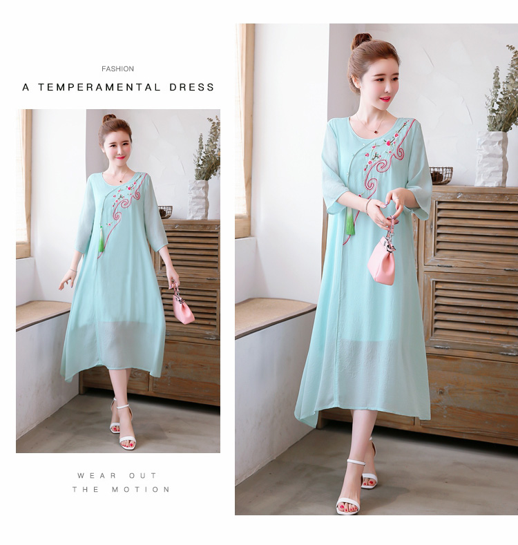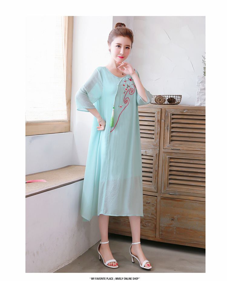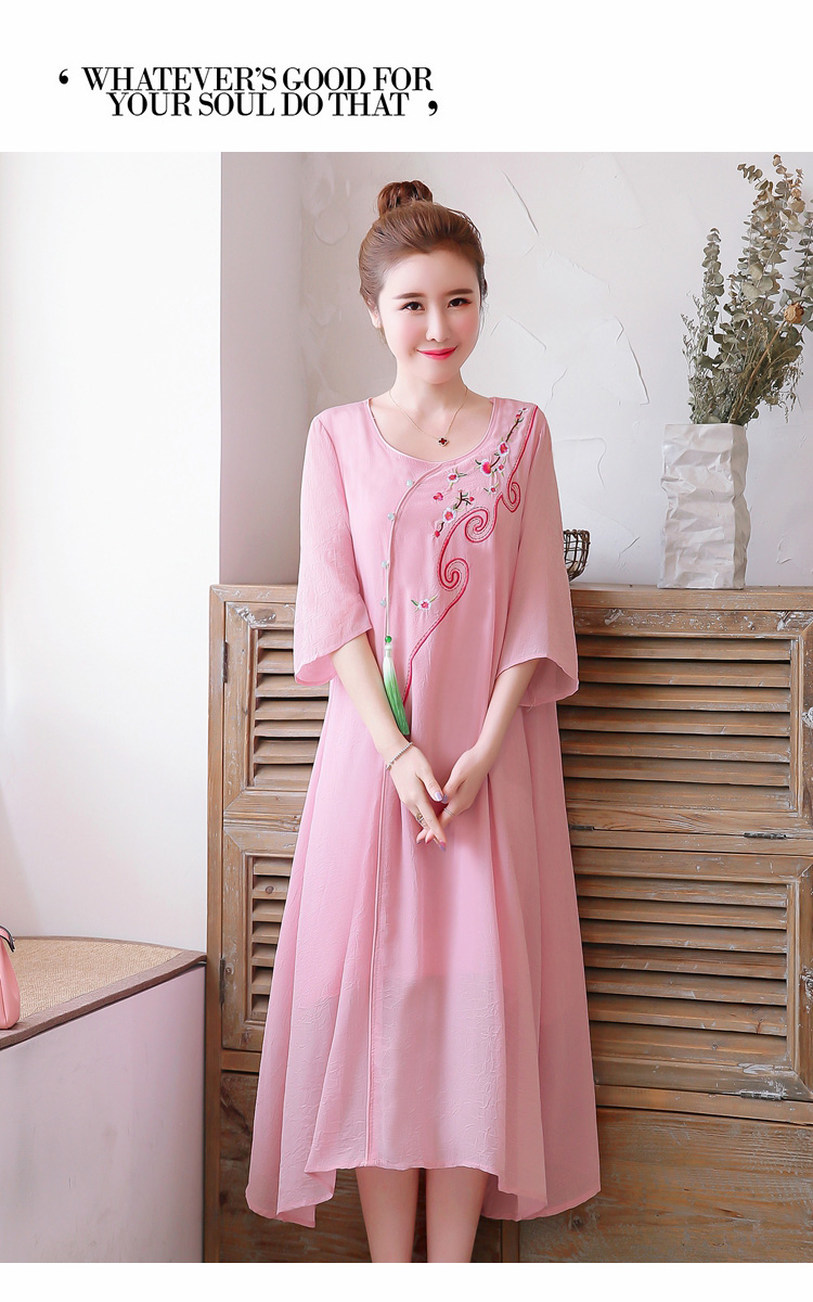 2020夏季新款中國風女學生棉麻連衣裙大碼民族風復古刺繡寬松長裙1入