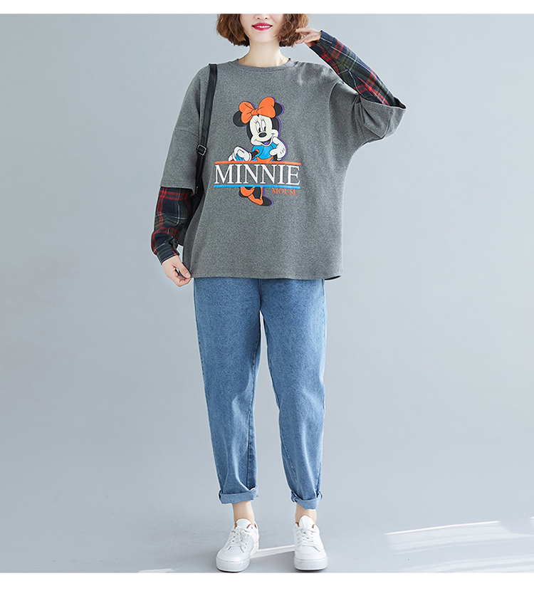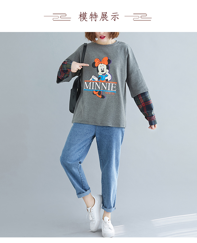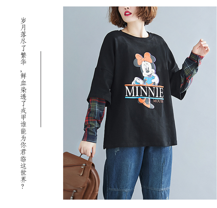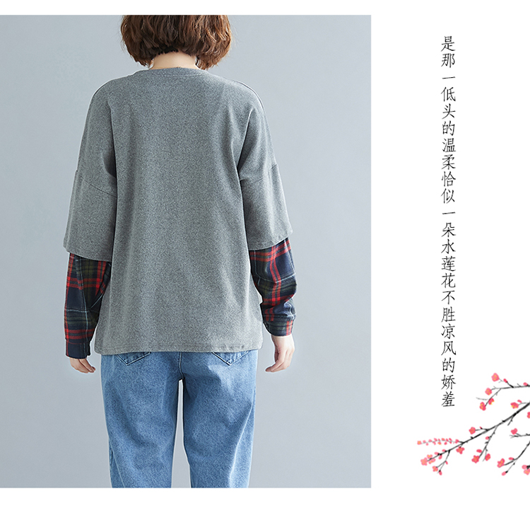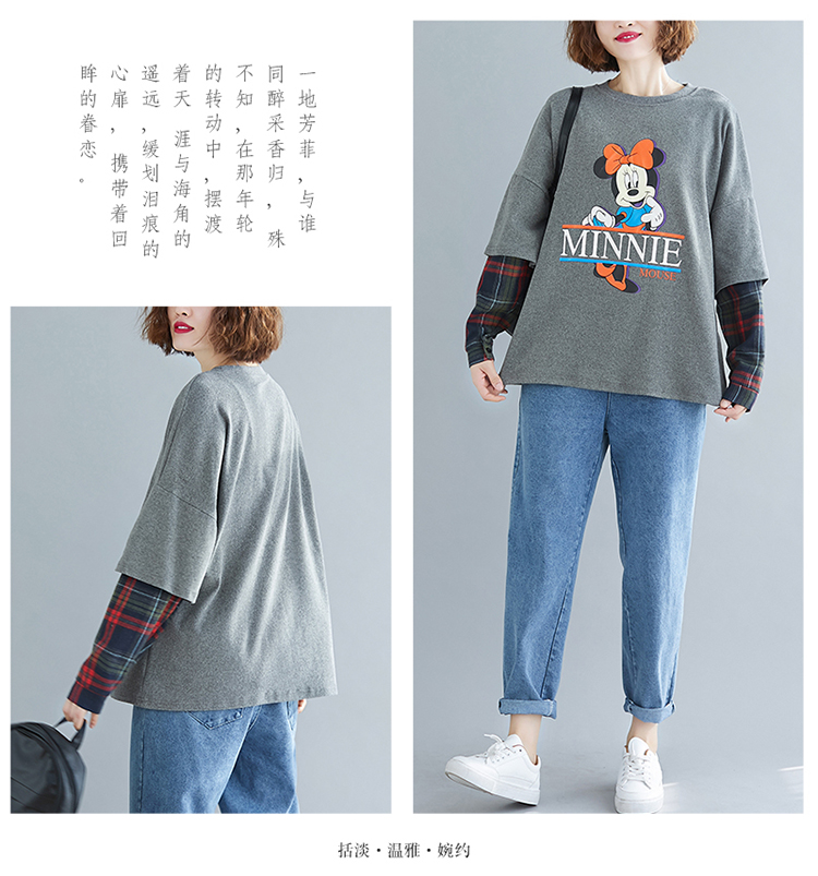 韓版時尚假兩件T恤女長袖2020春季學生文藝大碼女裝寬松套頭上衣1入