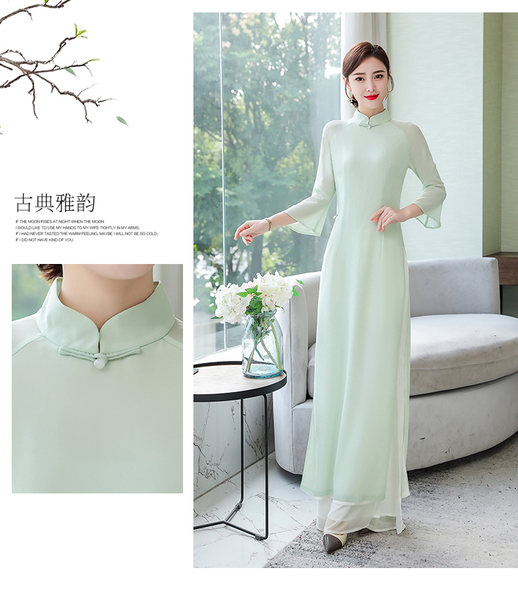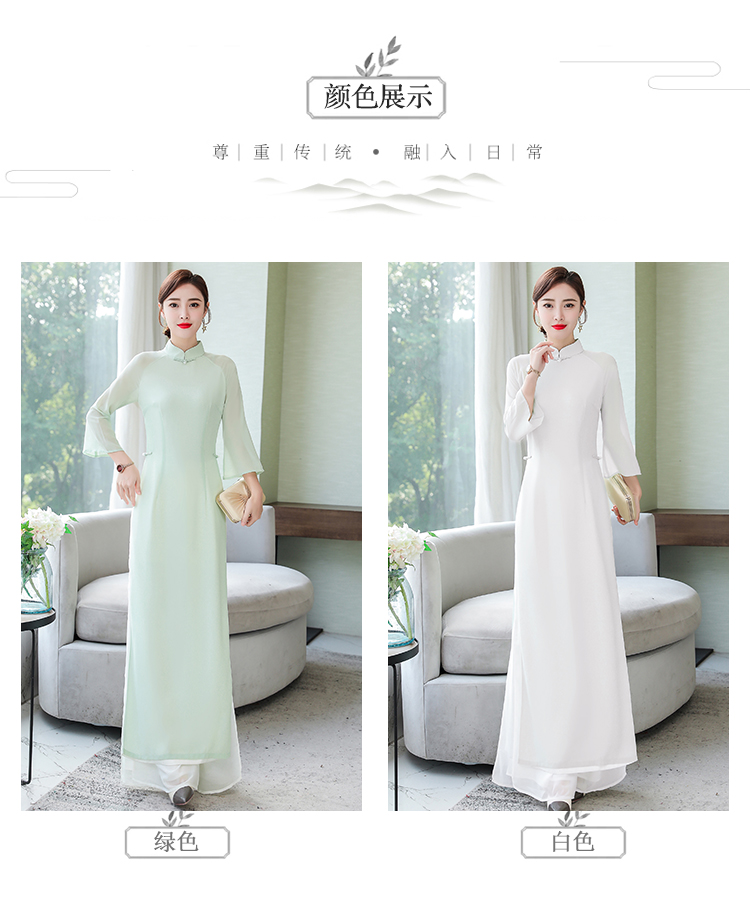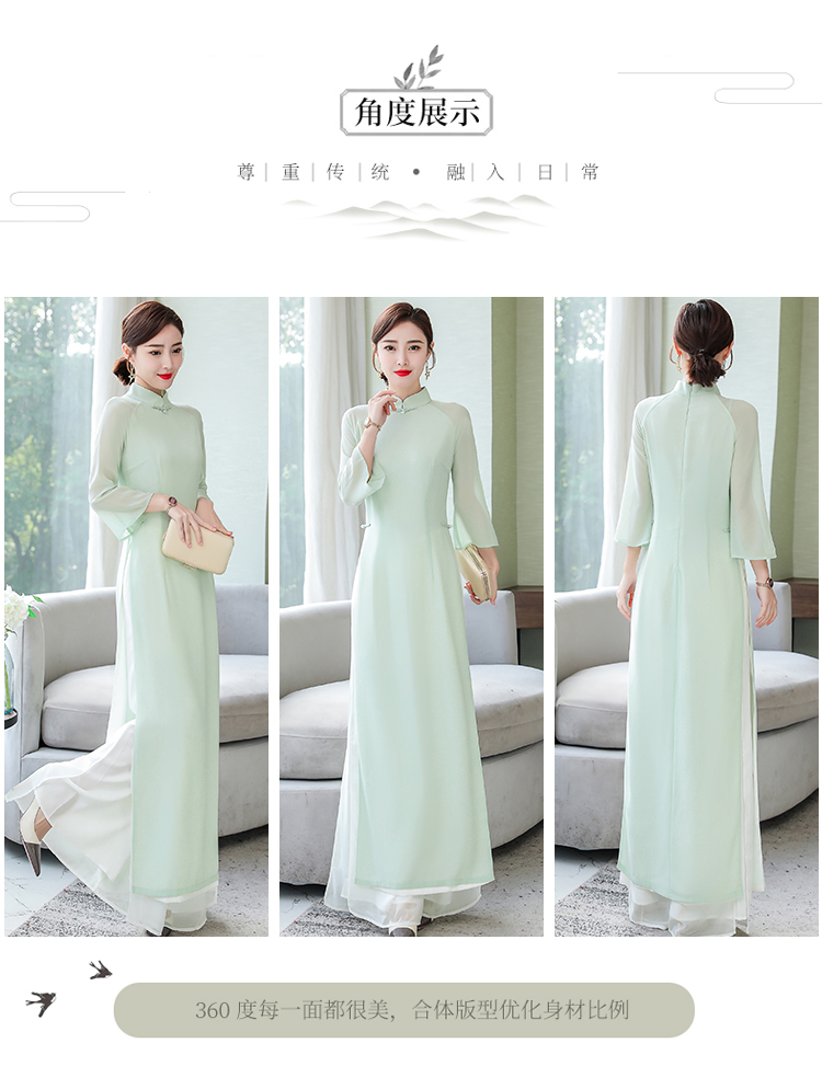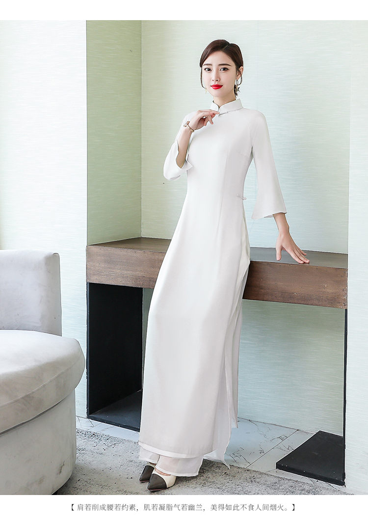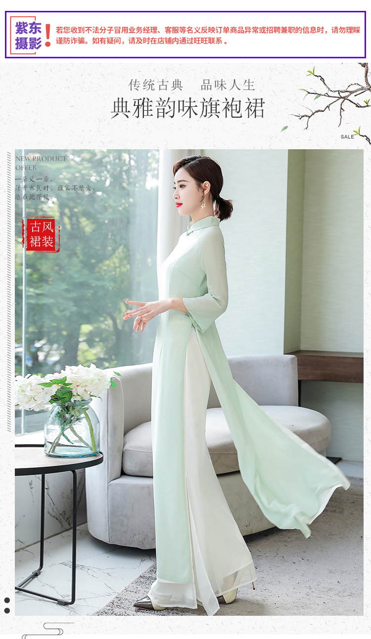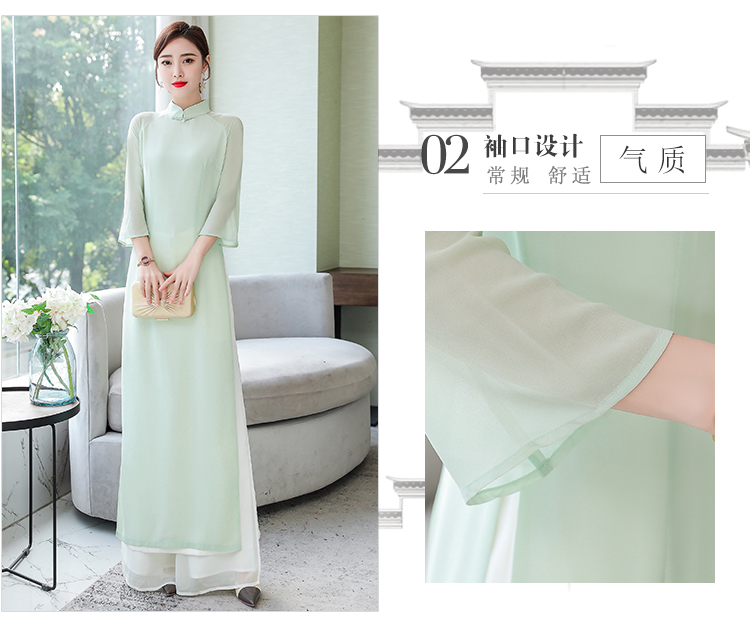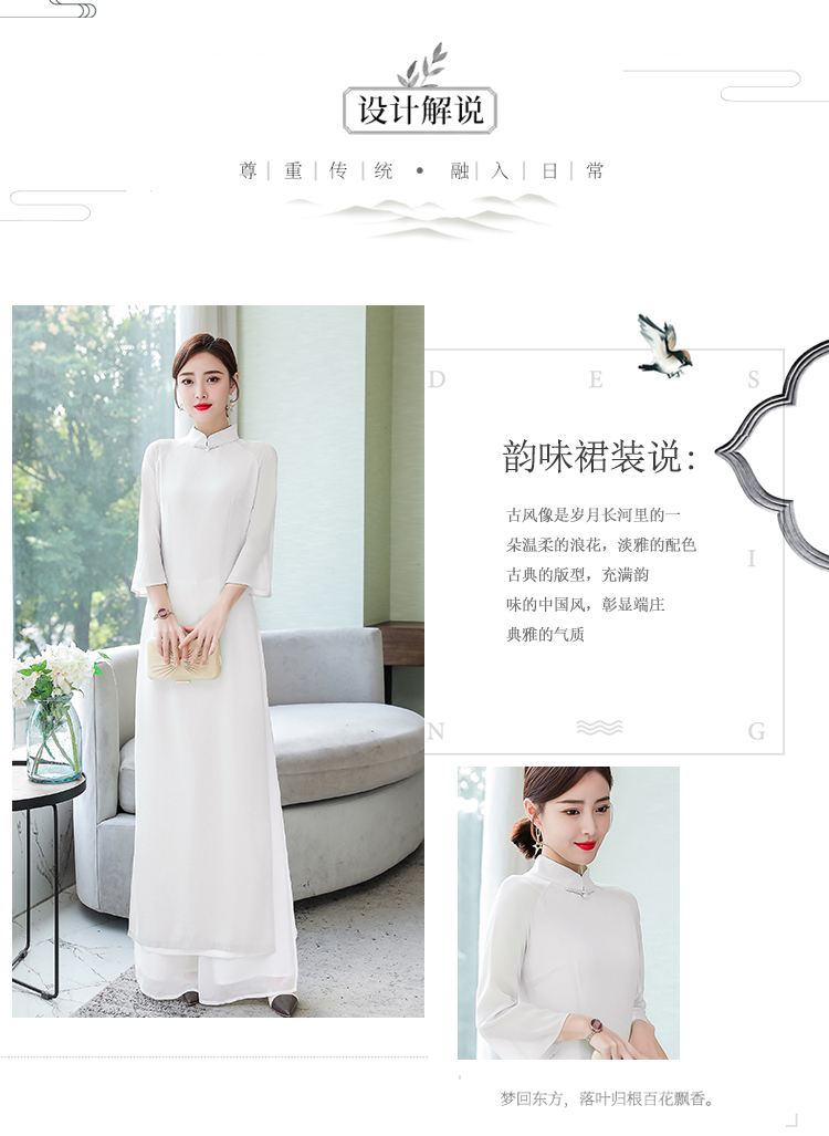 2020夏季中國風改良越南奧黛旗袍連衣裙套裝上衣+褲子兩件套茶服1入