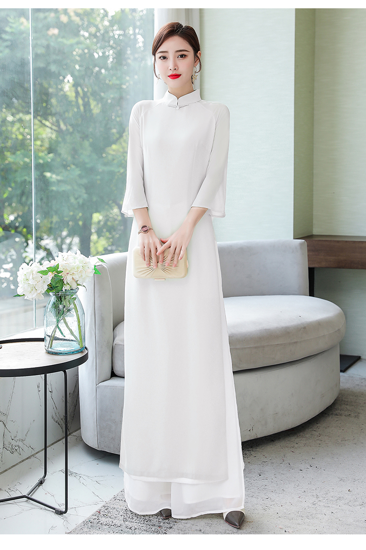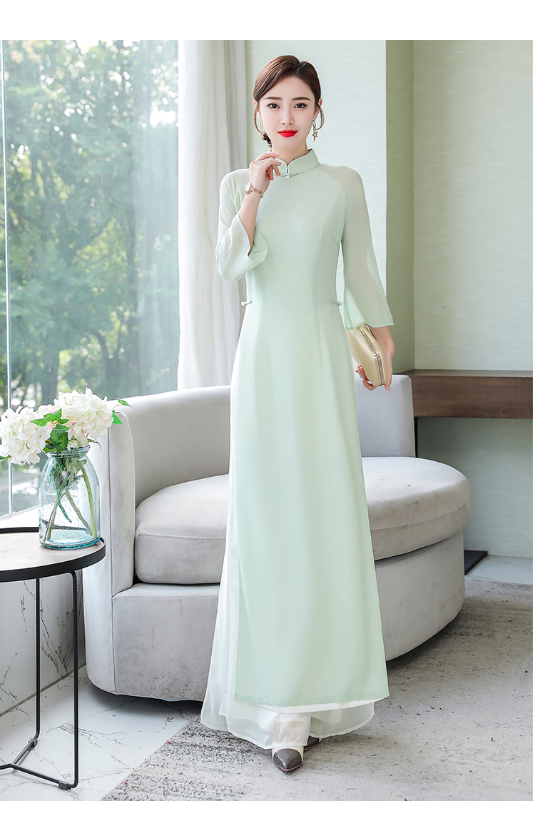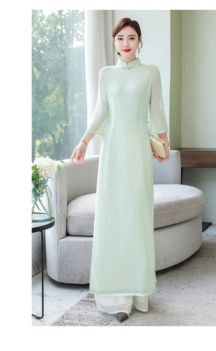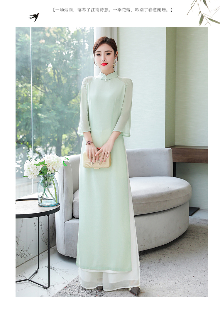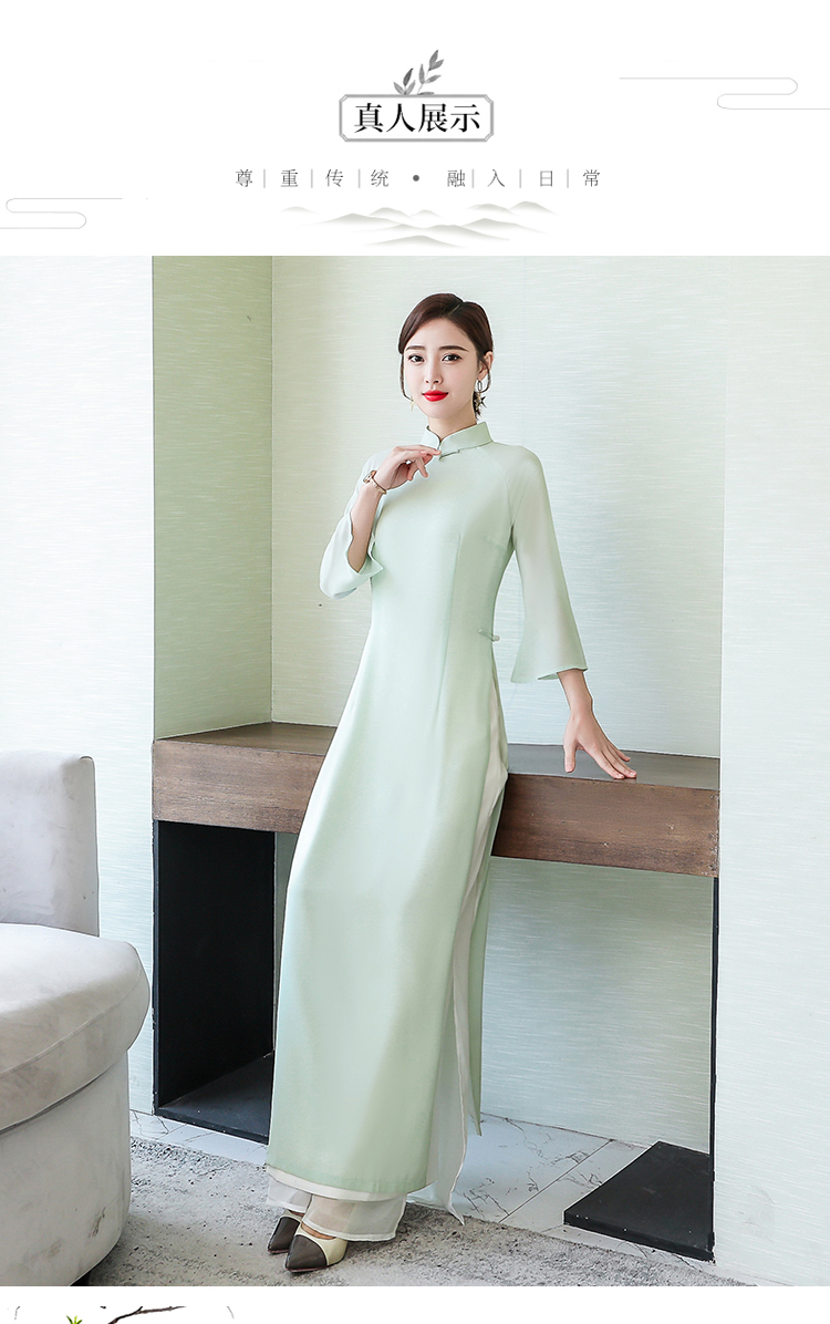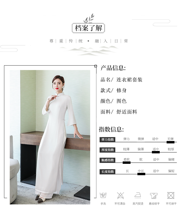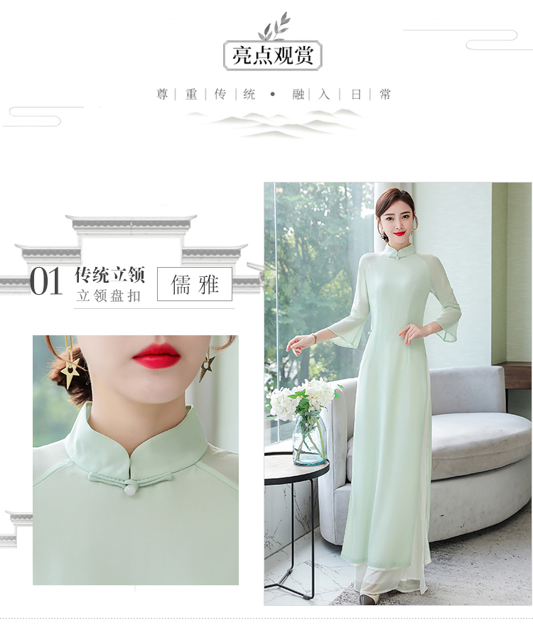 2020夏季中國風改良越南奧黛旗袍連衣裙套裝上衣+褲子兩件套茶服1入