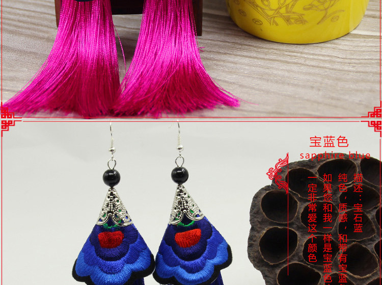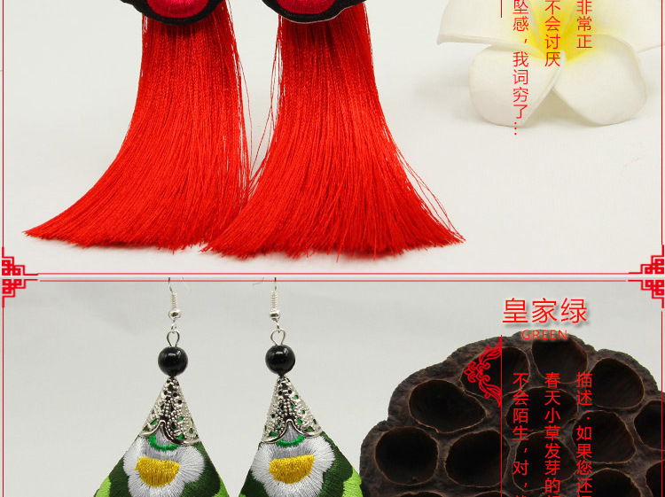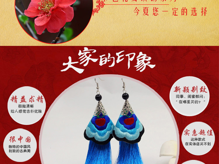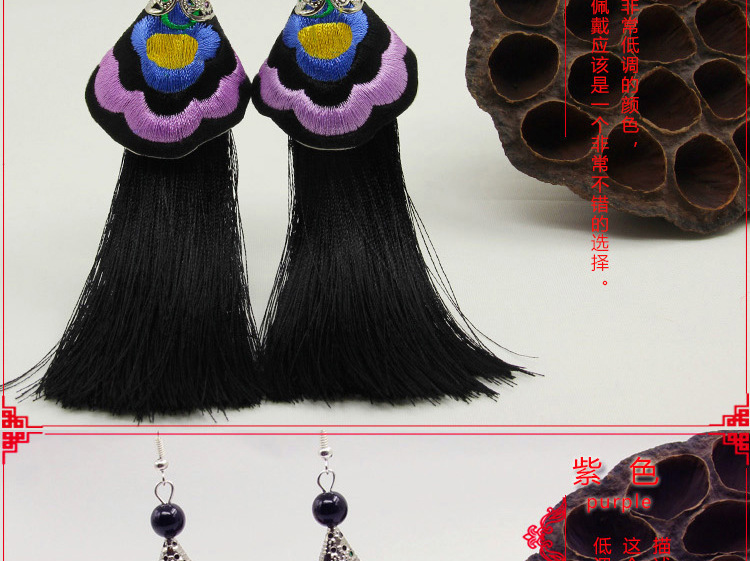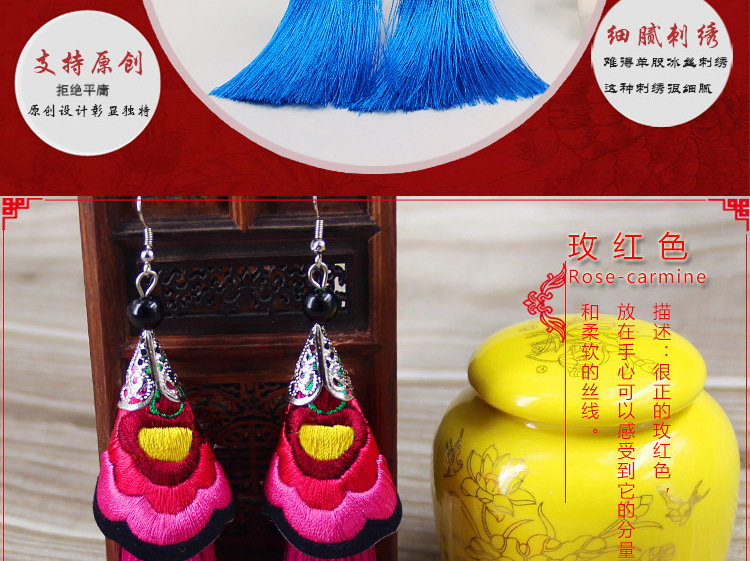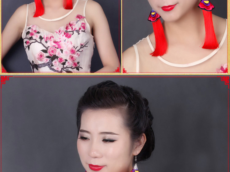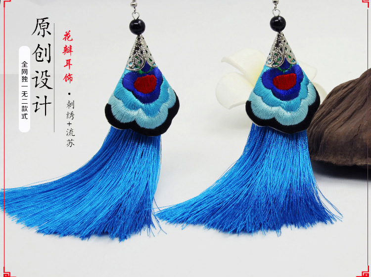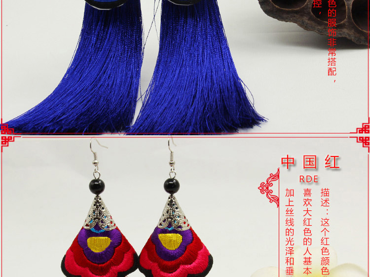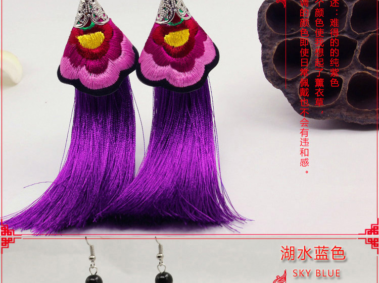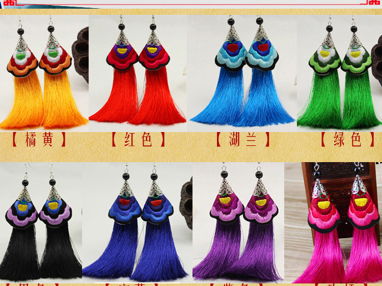 2019新款民族風女裝配飾復古苗銀繡花流失拼接耳環長款女士飾品1入