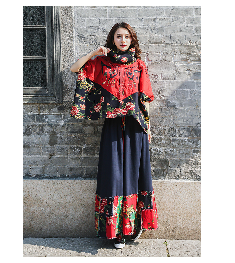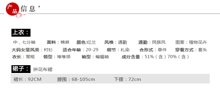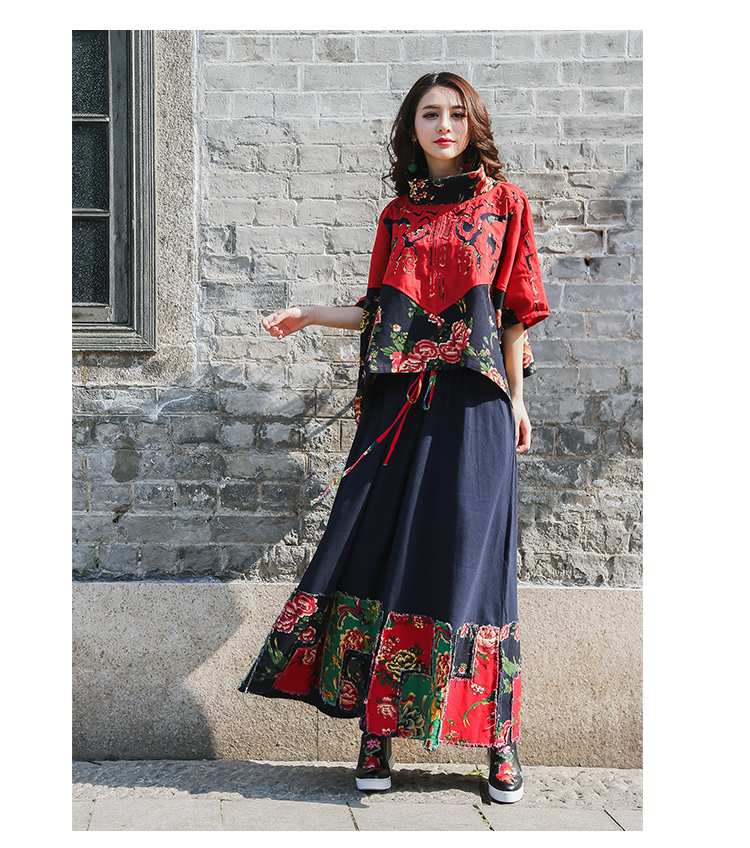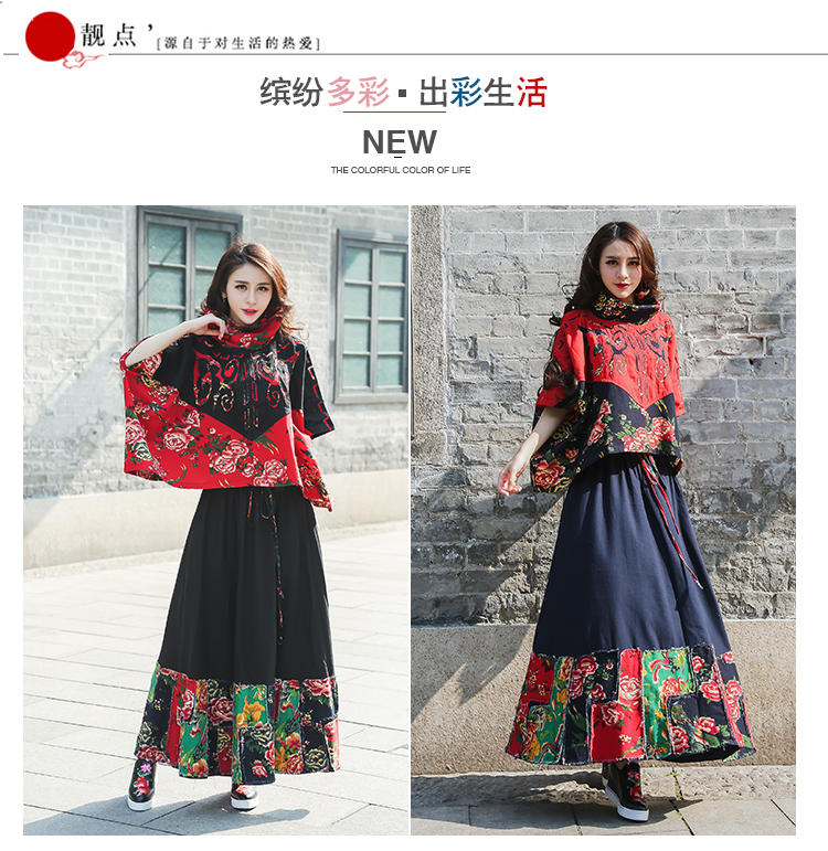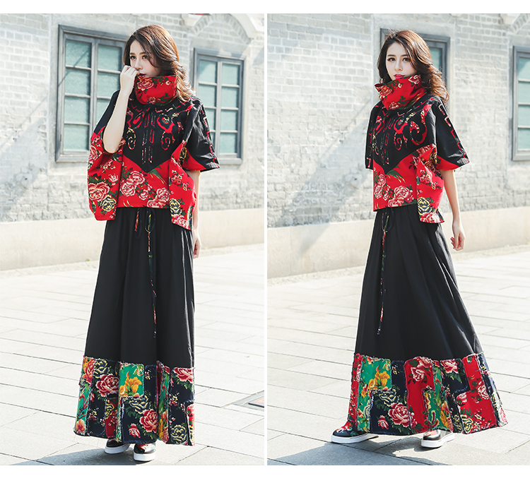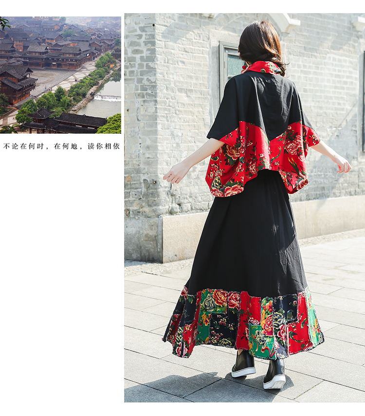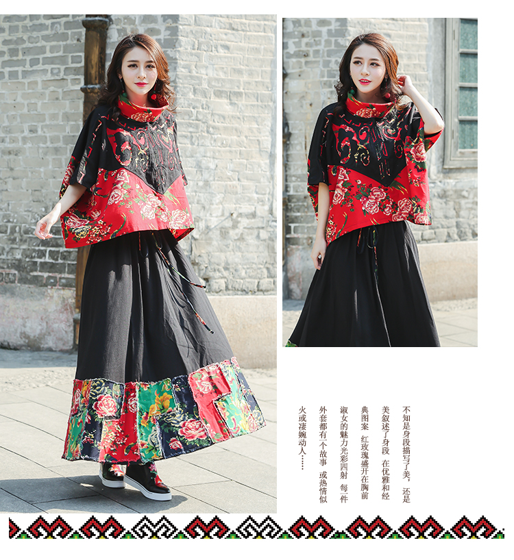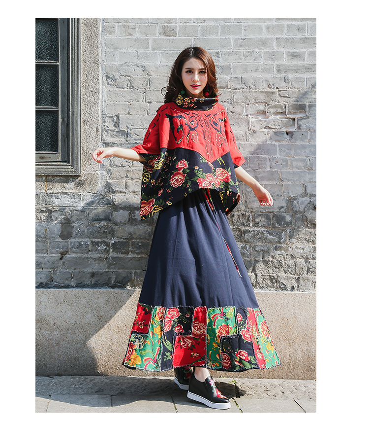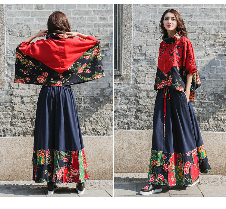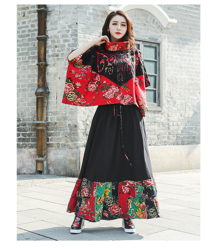 2020春裝新款民族風女裝復古印花棉麻半身裙秋冬松緊腰長裙大擺裙1入