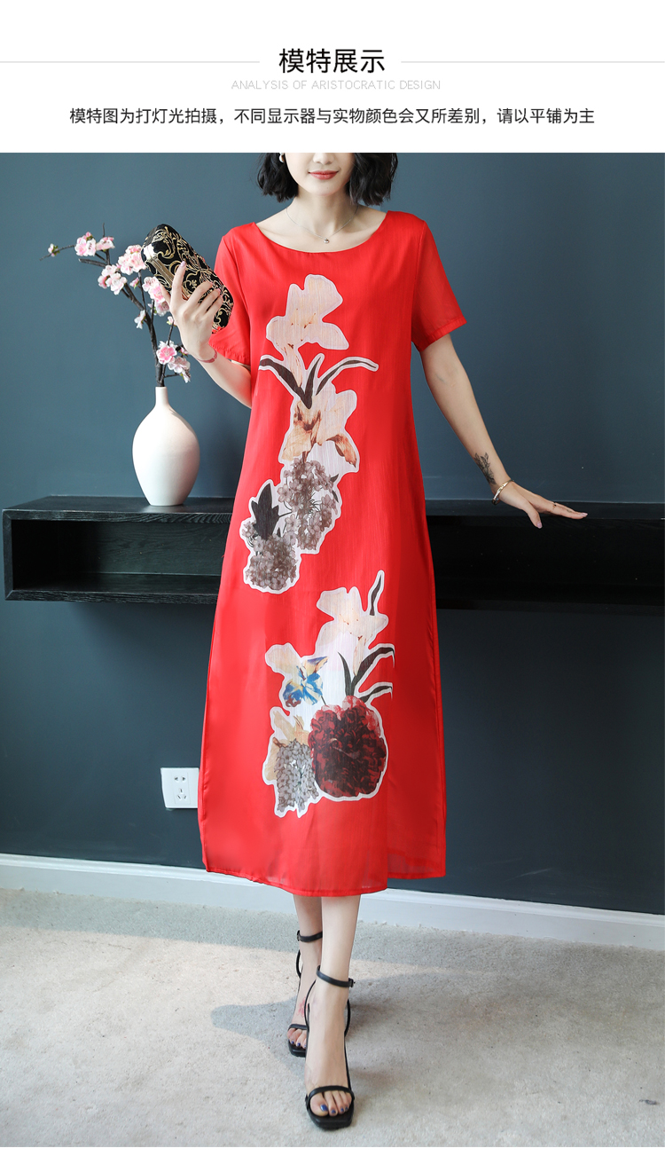 2019夏裝民族風女裝中長款大碼寬松復古仿真絲印花連衣裙短袖顯瘦1入