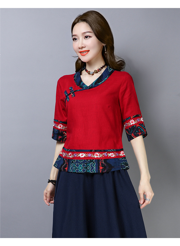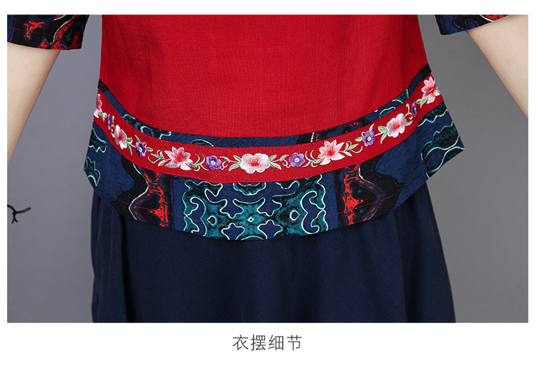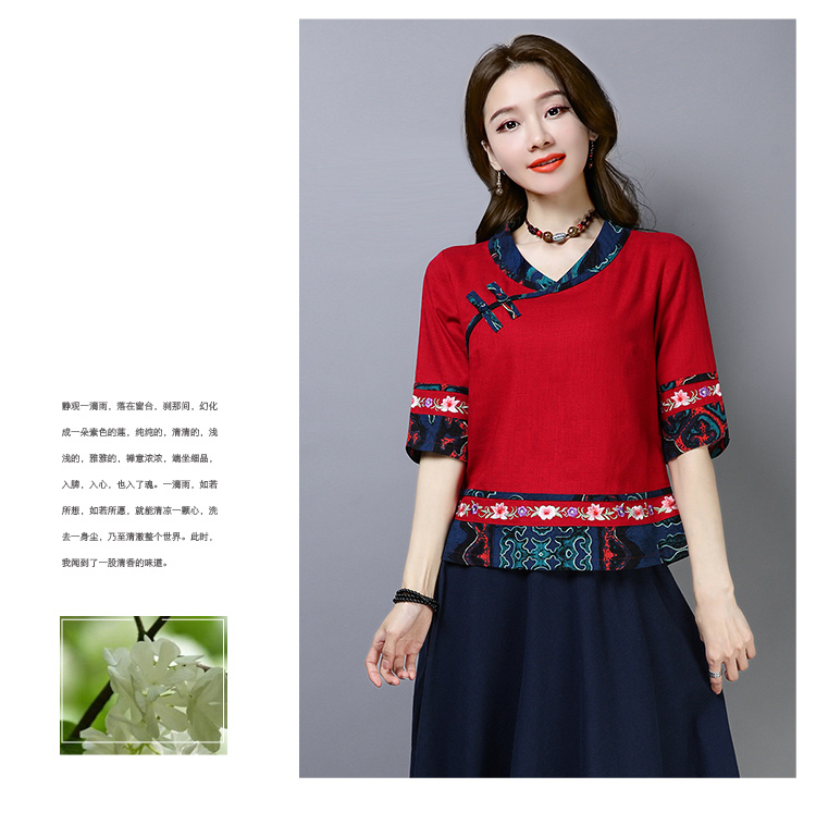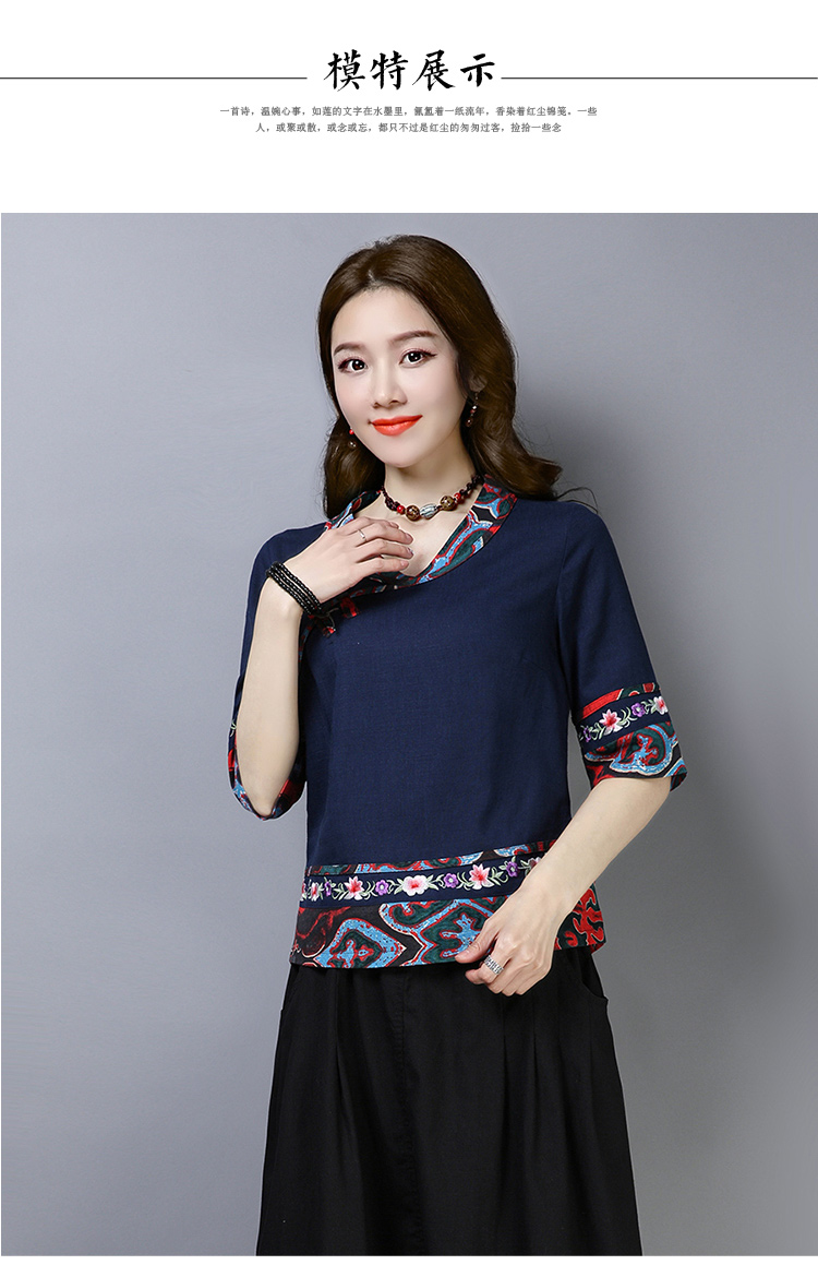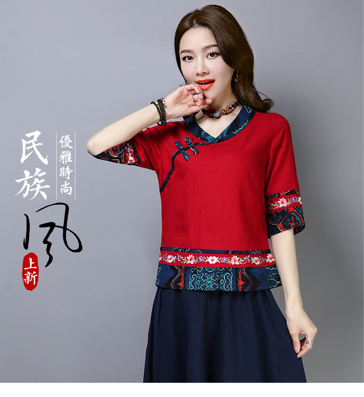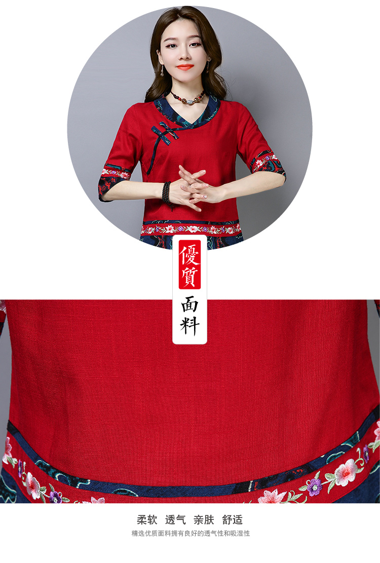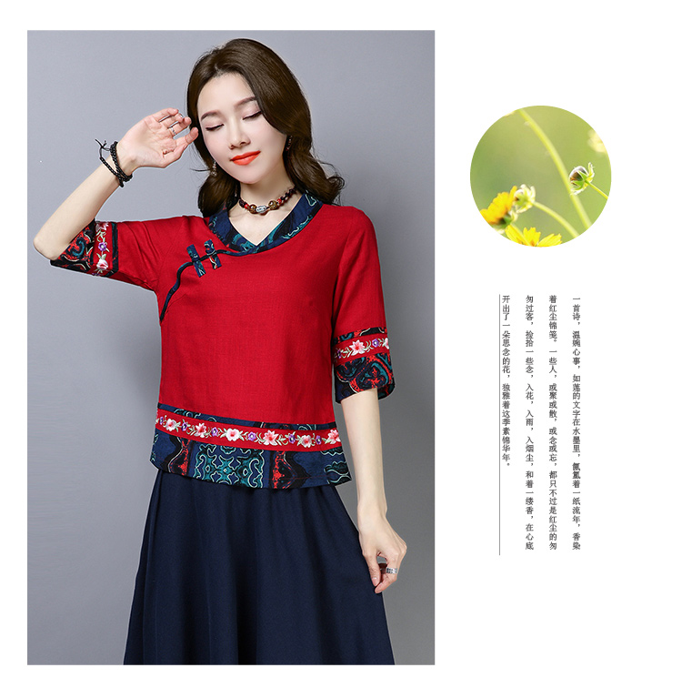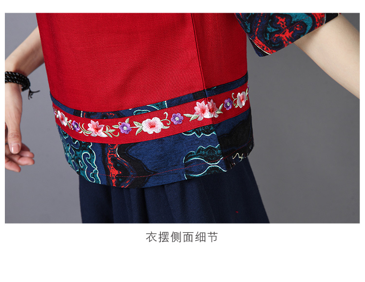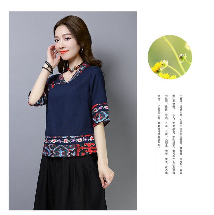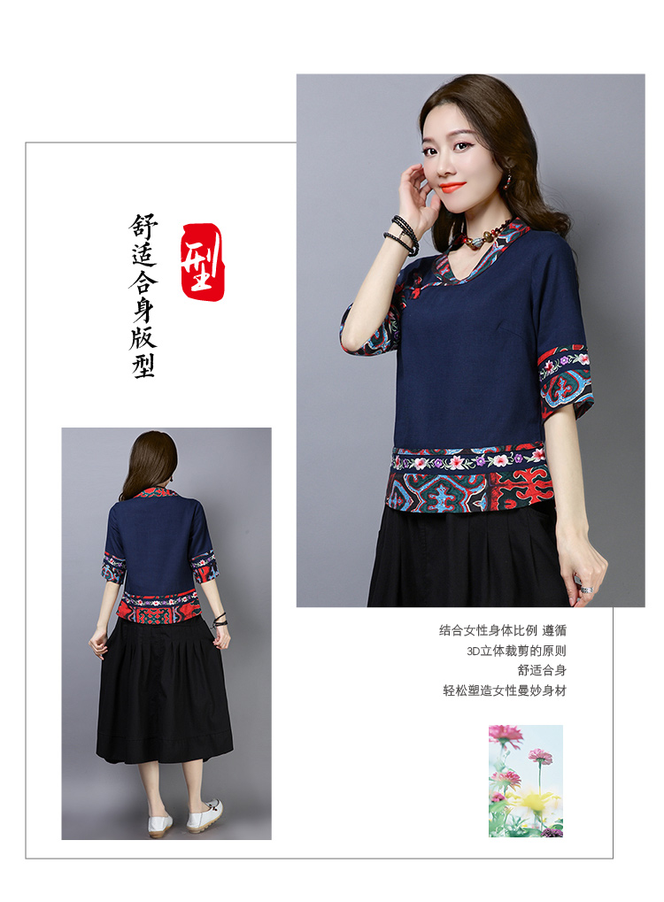 2020夏季新款民族風女裝中式復古花布棉麻中式繡花T恤五分袖上衣1入