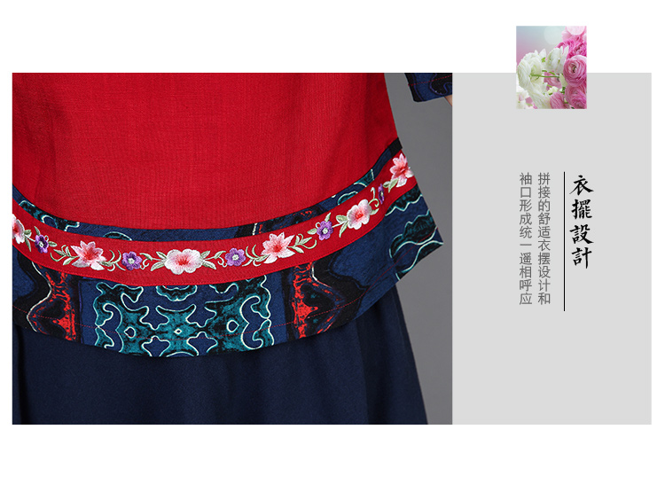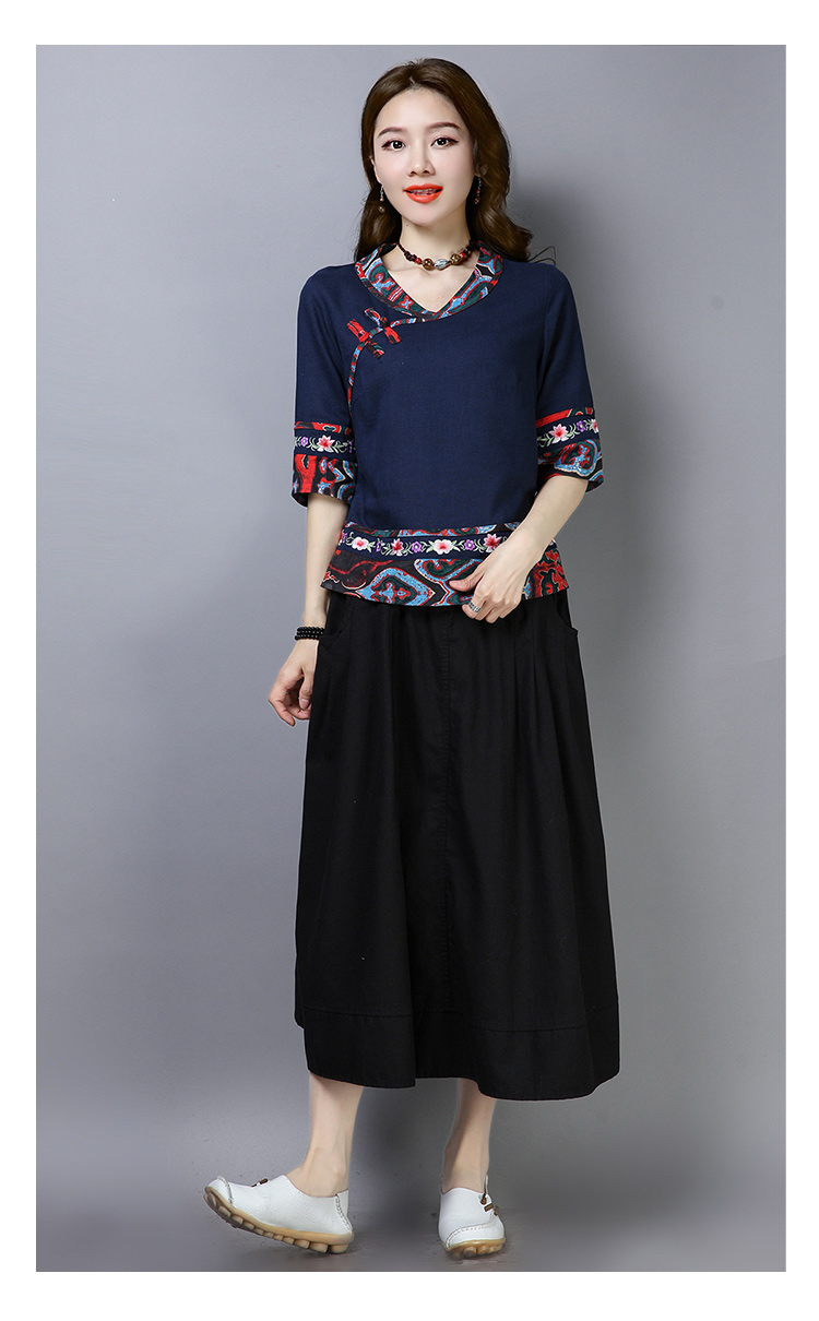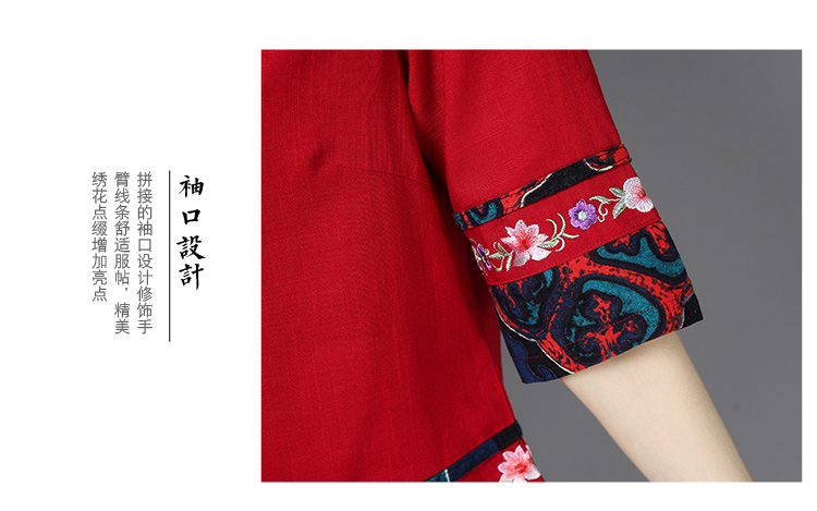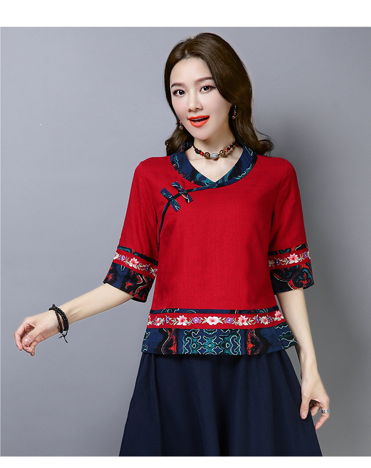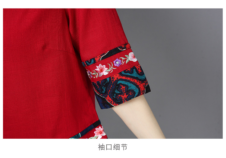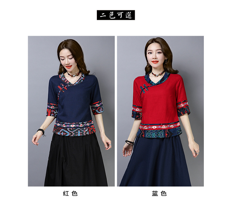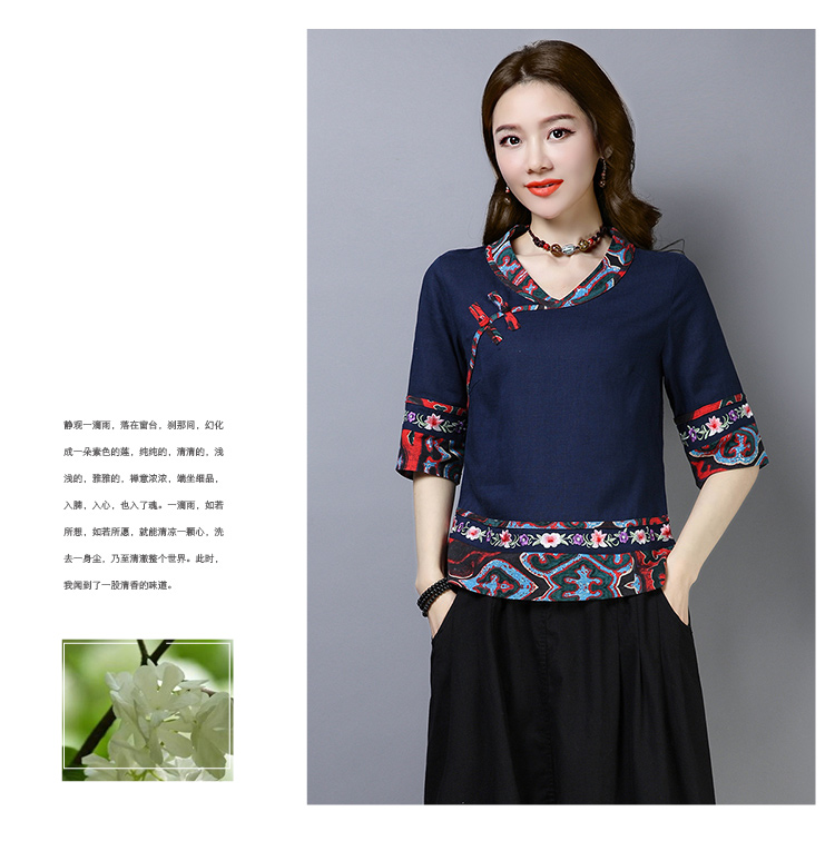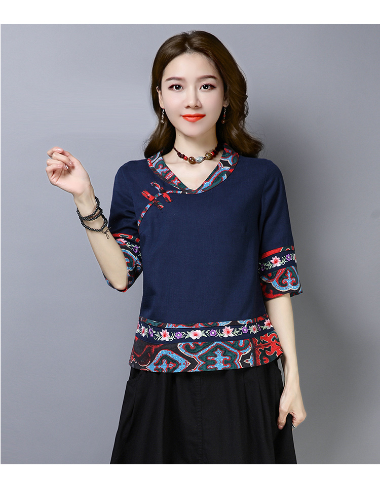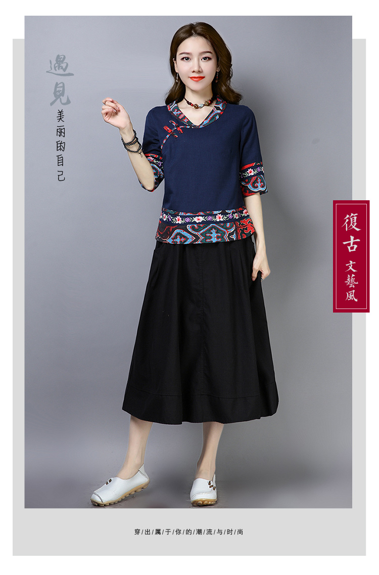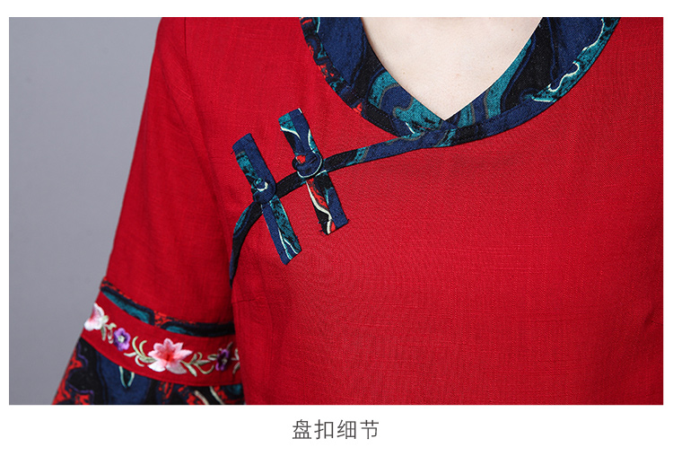 2020夏季新款民族風女裝中式復古花布棉麻中式繡花T恤五分袖上衣1入