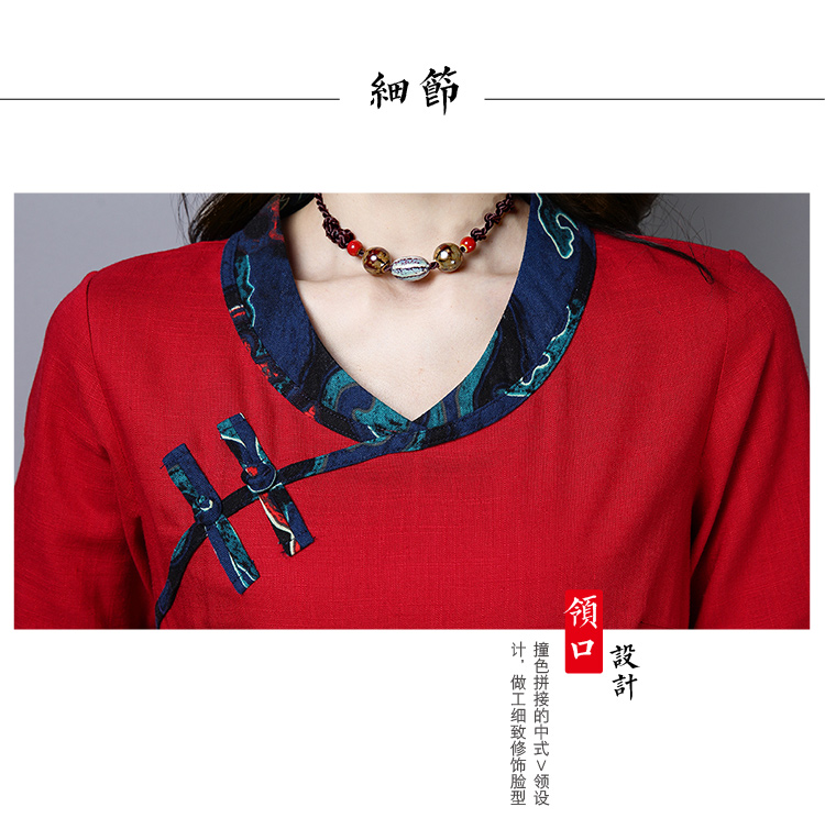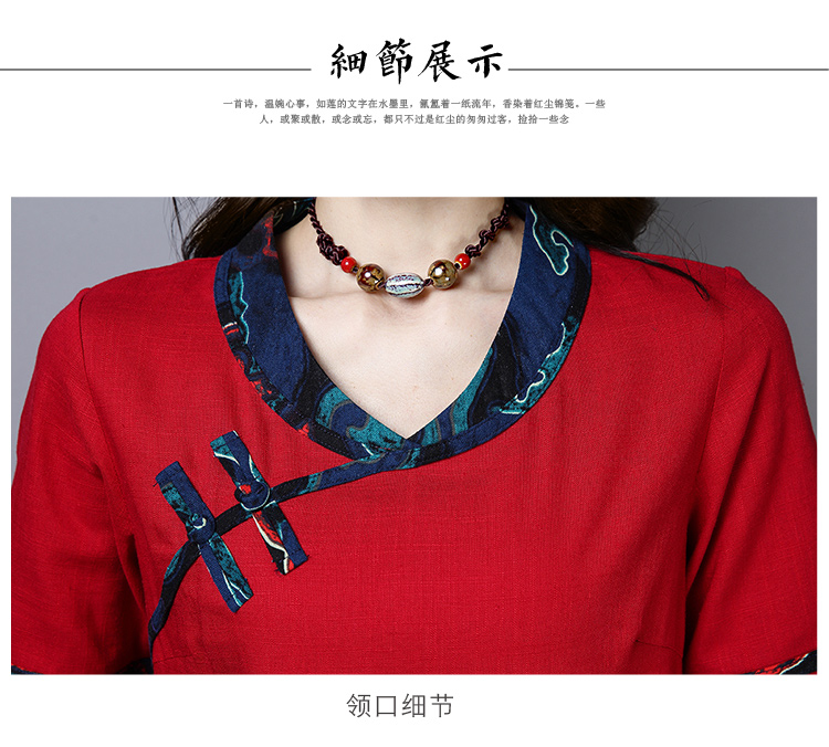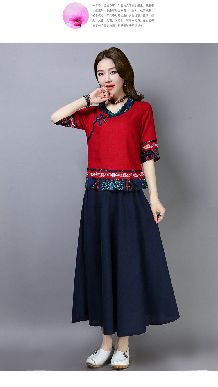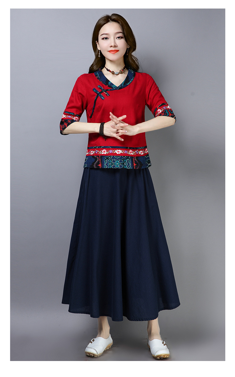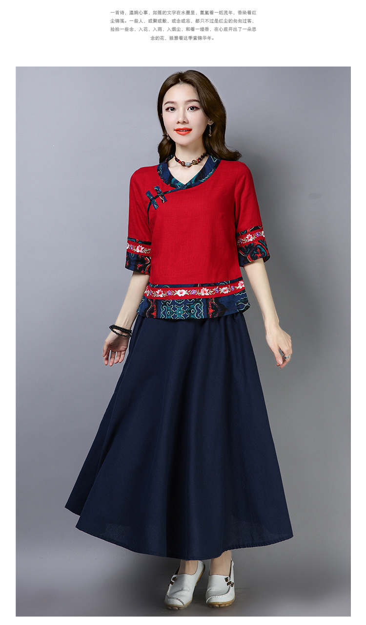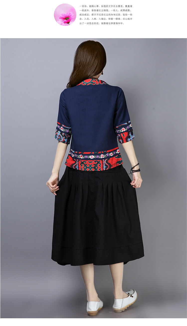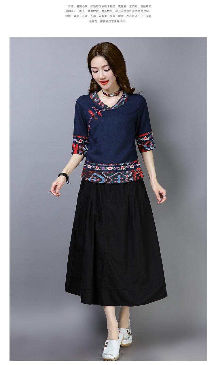 2020夏季新款民族風女裝中式復古花布棉麻中式繡花T恤五分袖上衣1入
