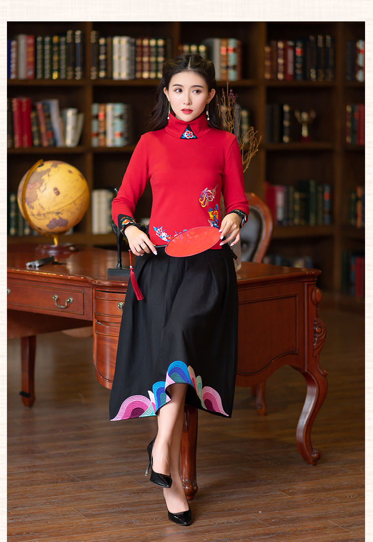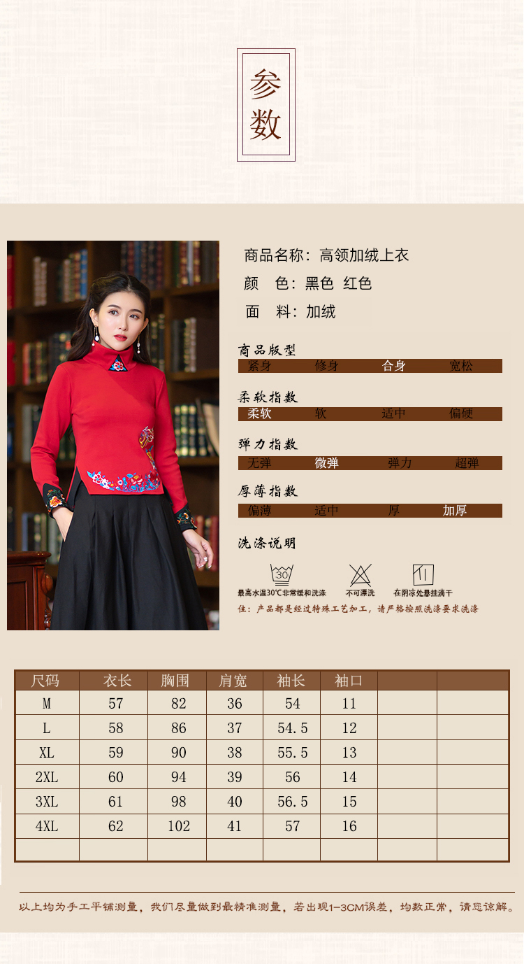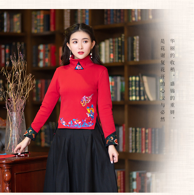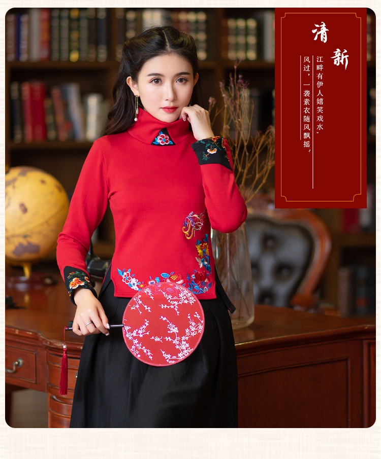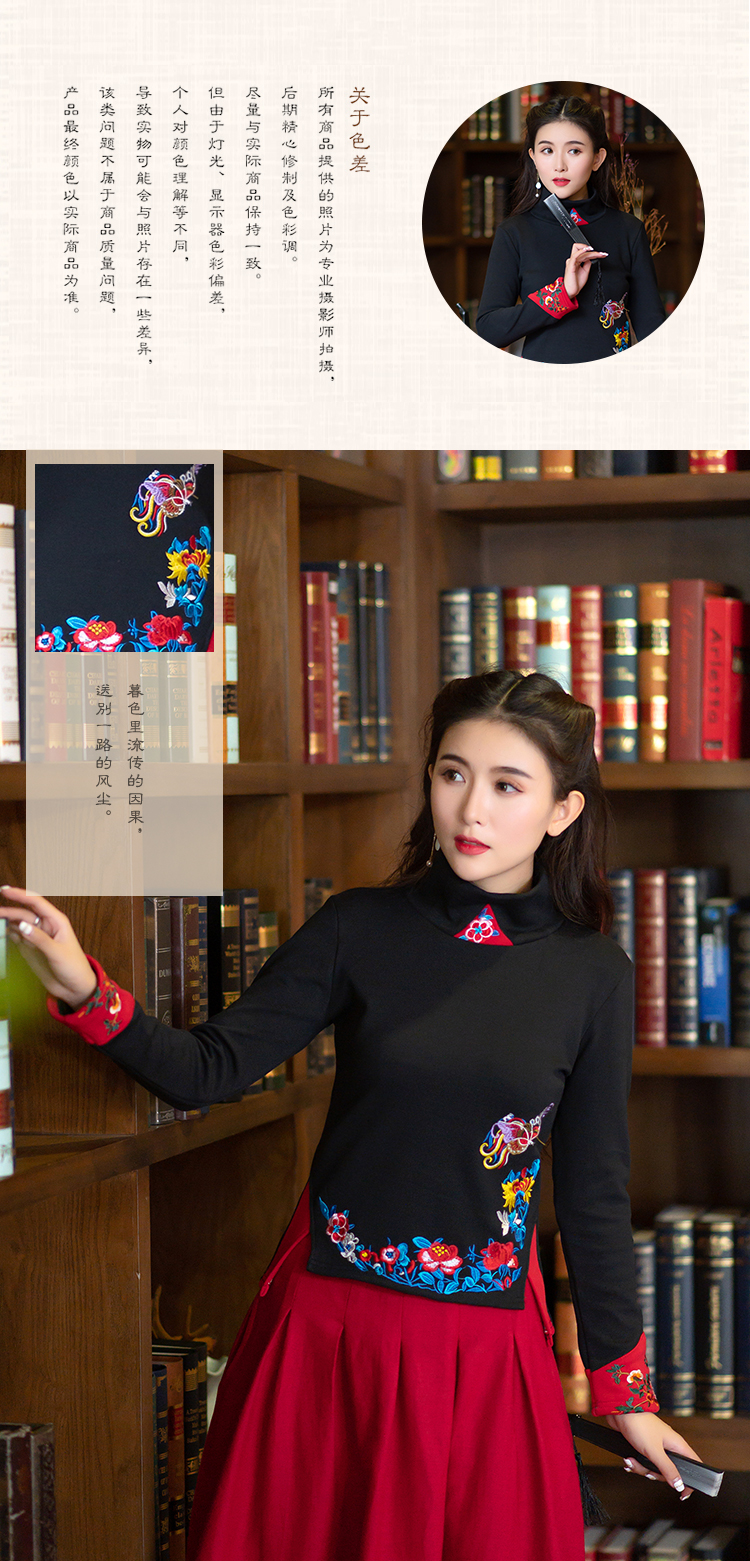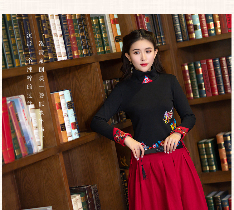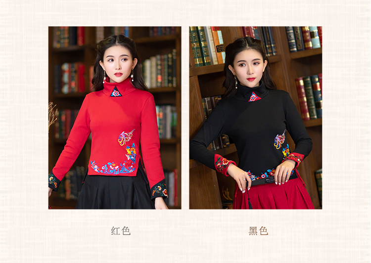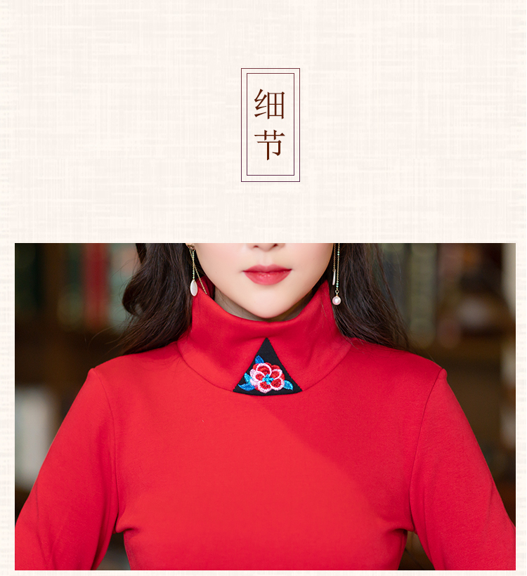 2020冬裝新款民族風繡花修身顯瘦高領長袖T恤上衣加絨加厚打底衫1入