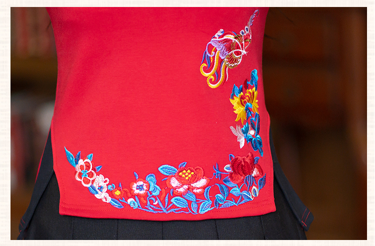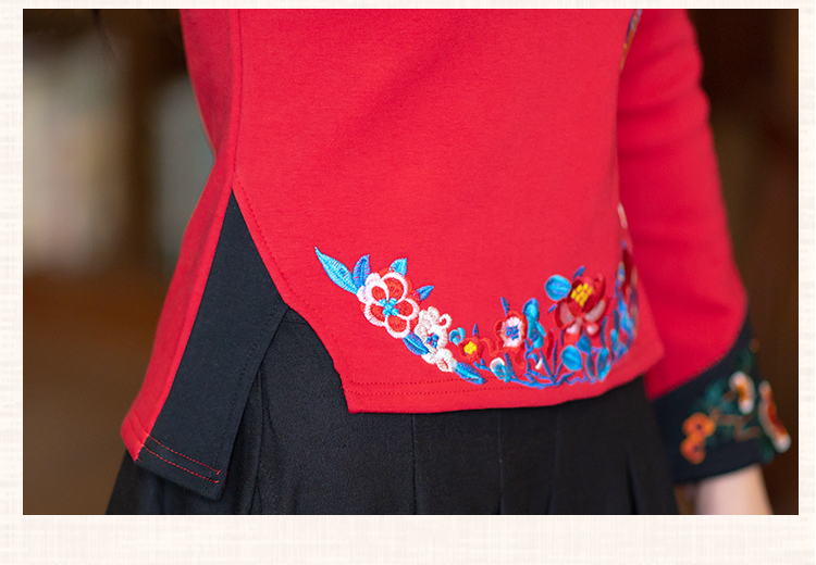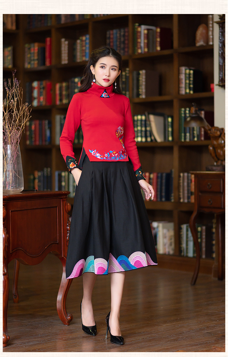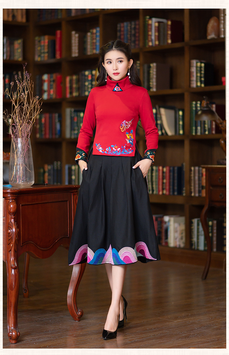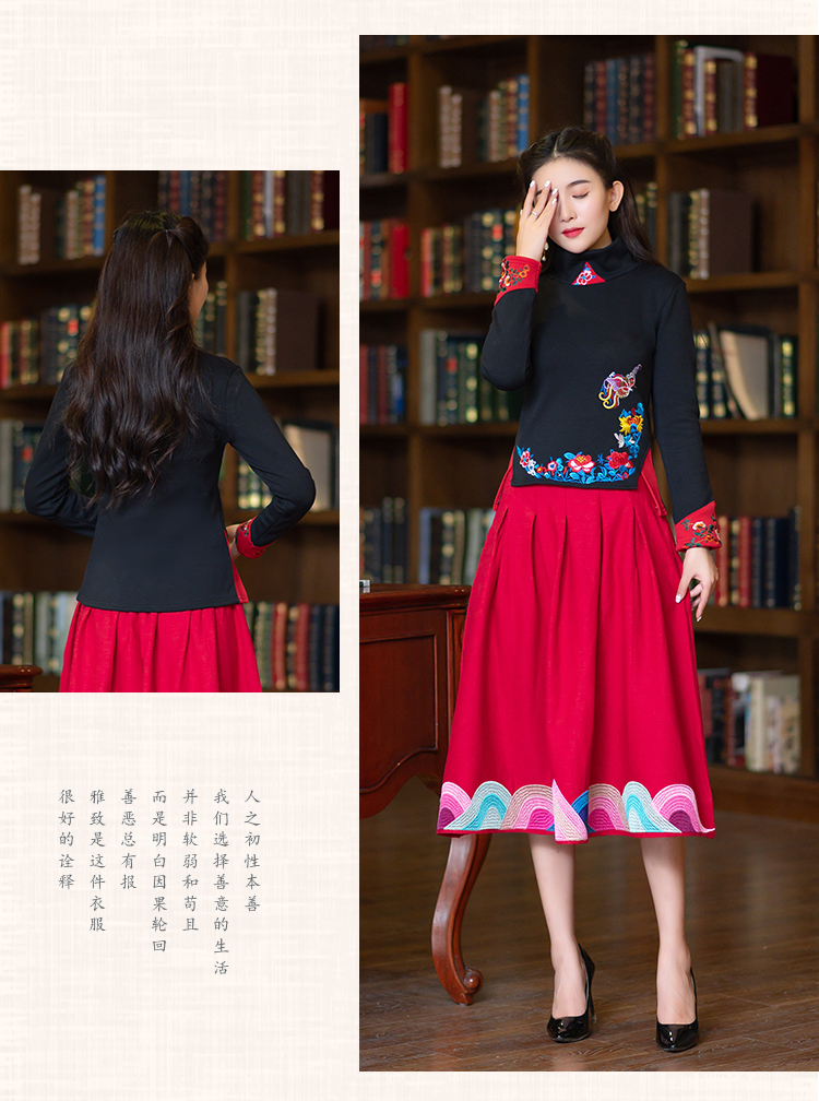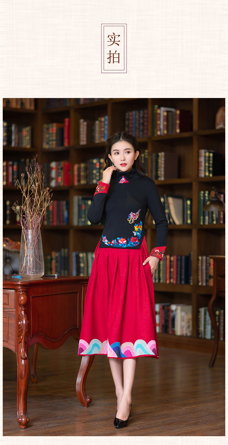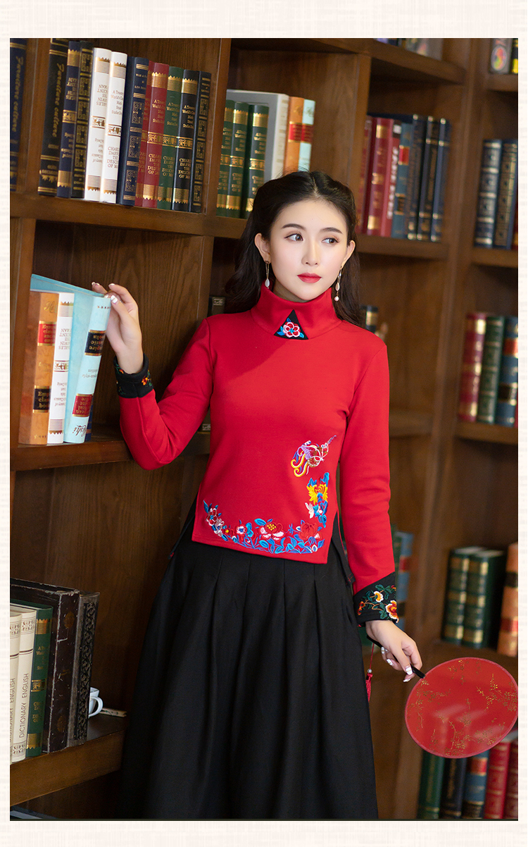 2020冬裝新款民族風繡花修身顯瘦高領長袖T恤上衣加絨加厚打底衫1入