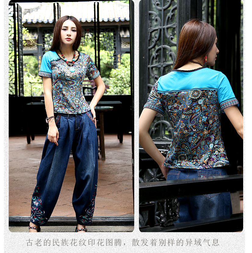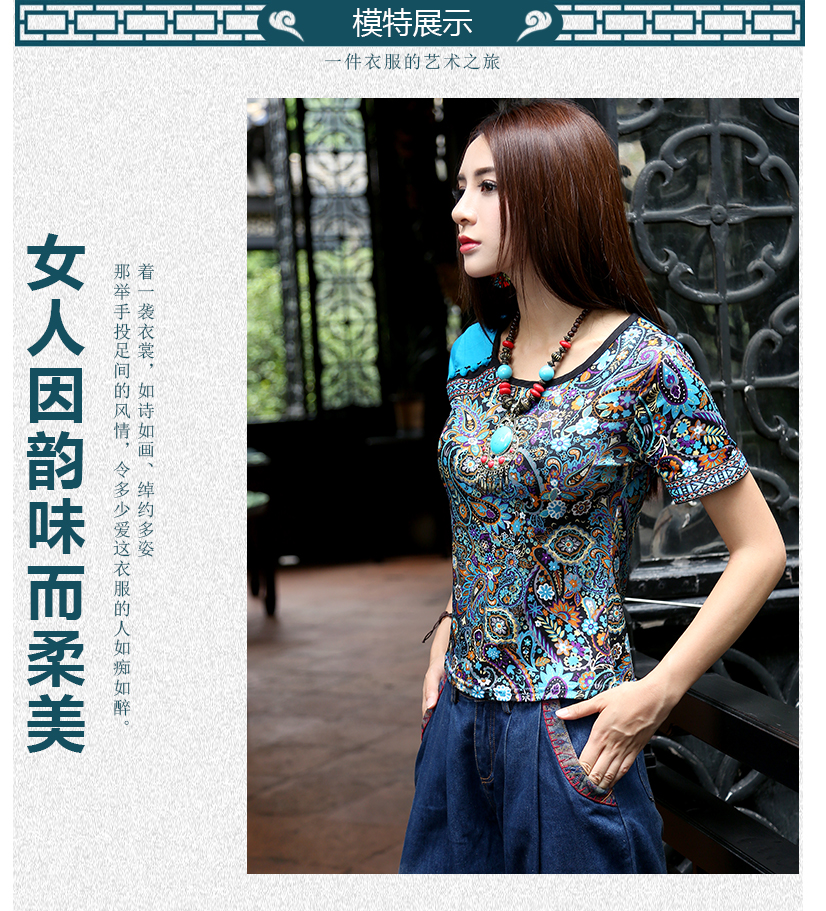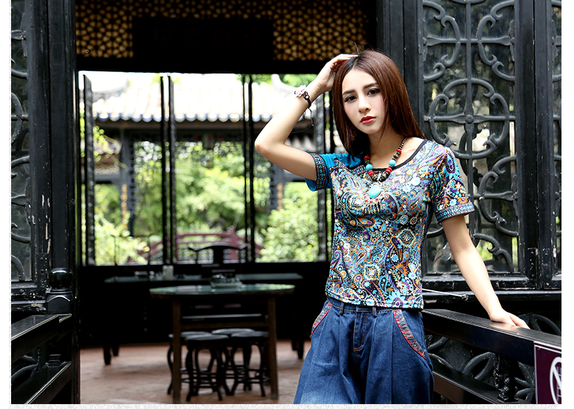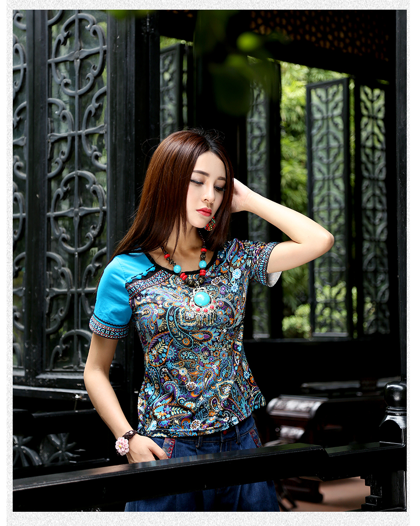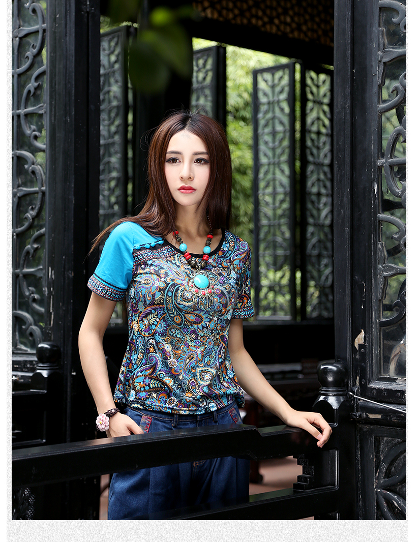 2020夏季新款原創民族風女裝文藝復古印花T恤短袖上衣修身顯瘦1入