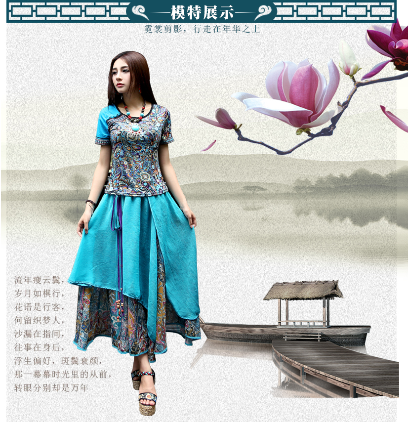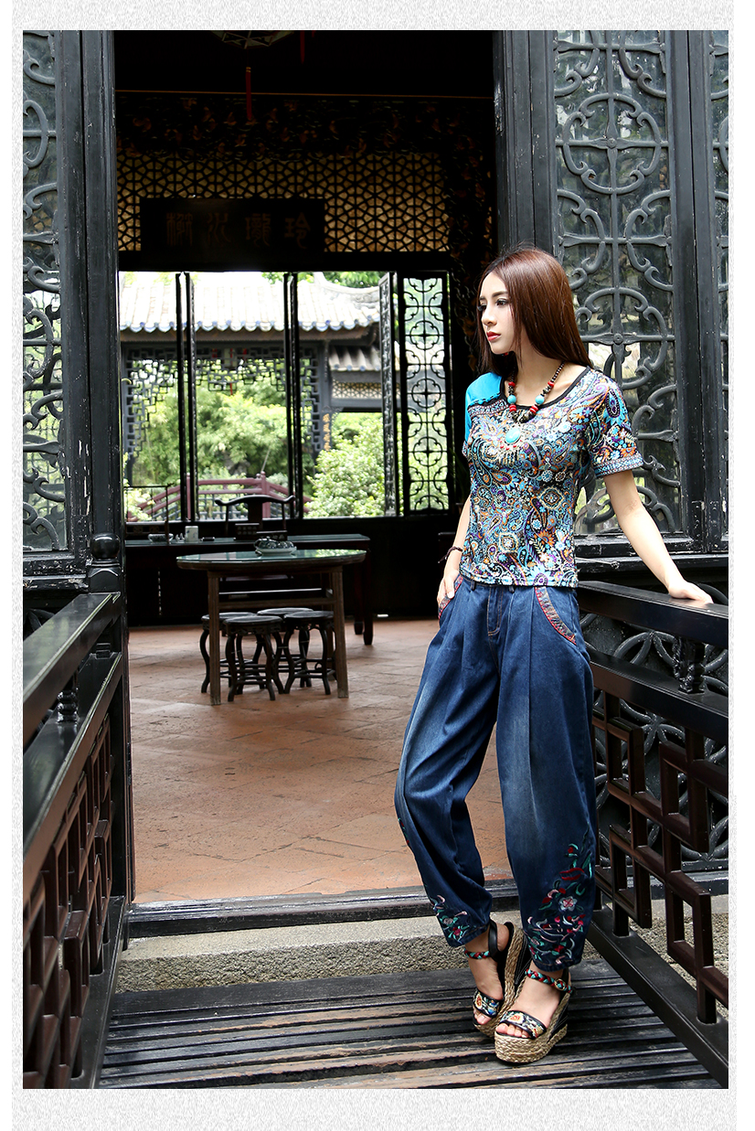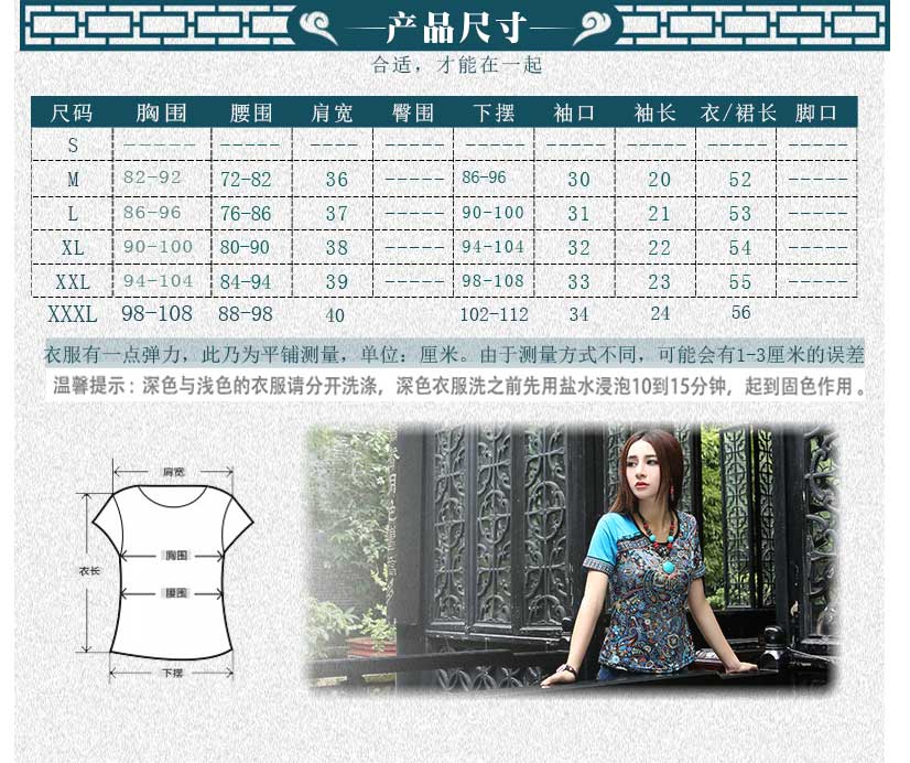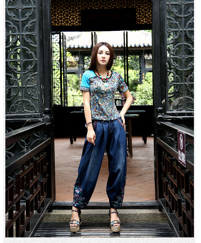 2020夏季新款原創民族風女裝文藝復古印花T恤短袖上衣修身顯瘦1入