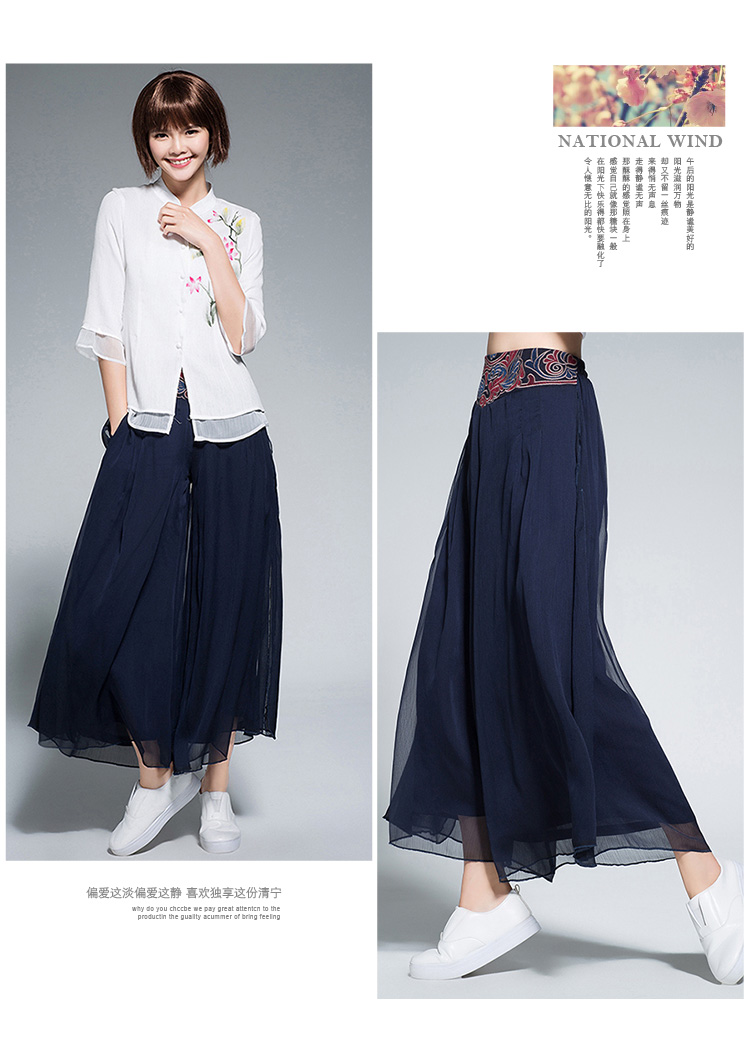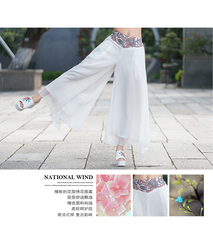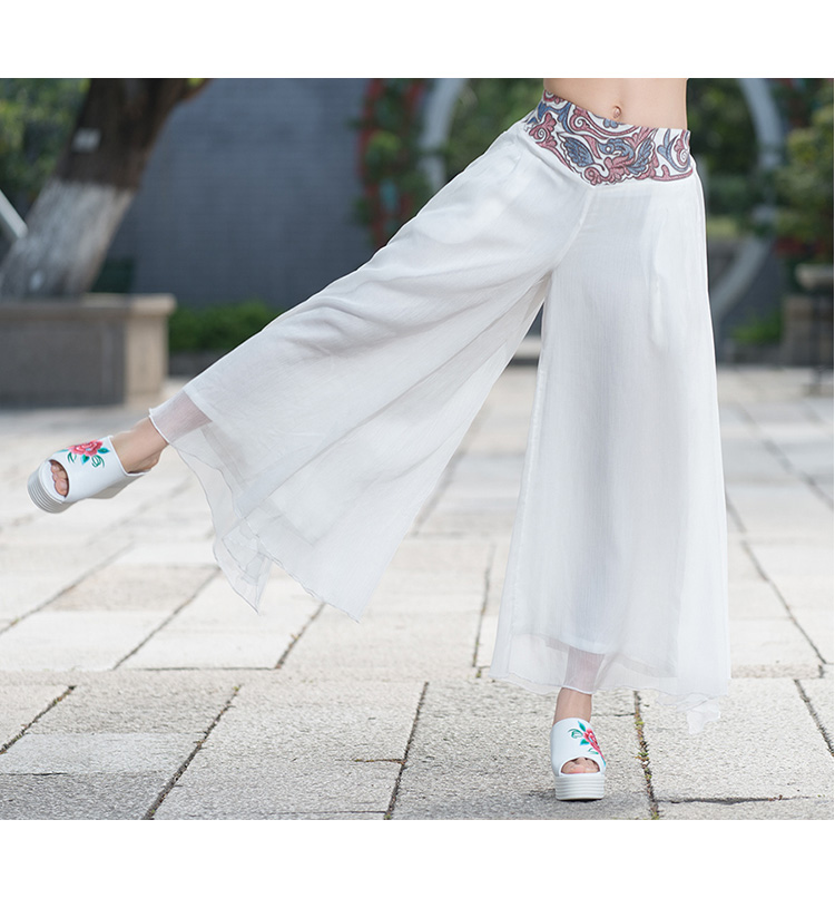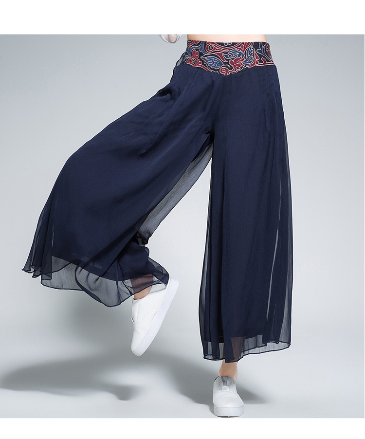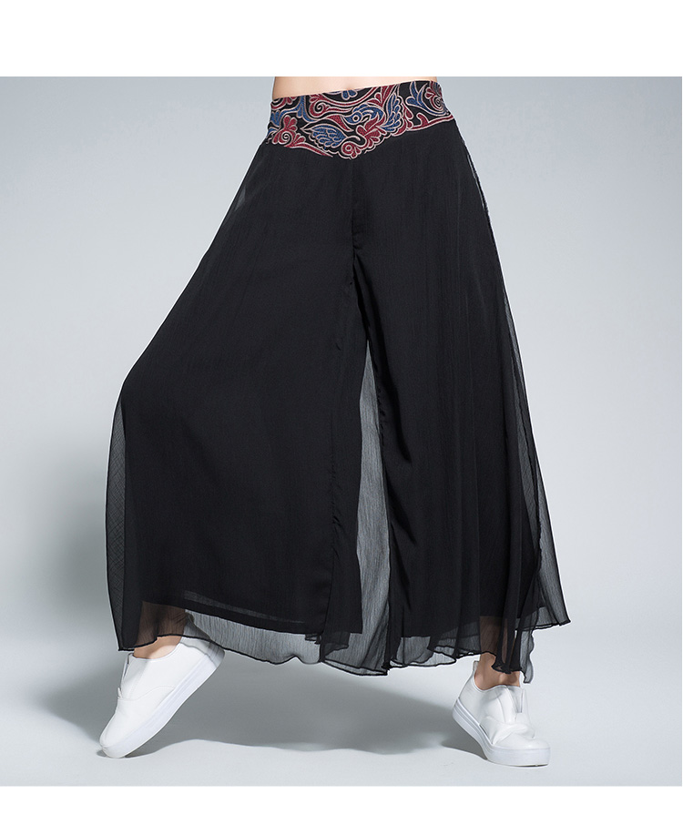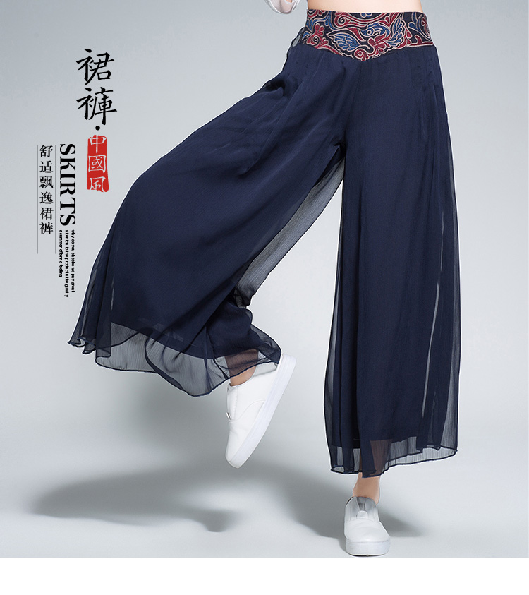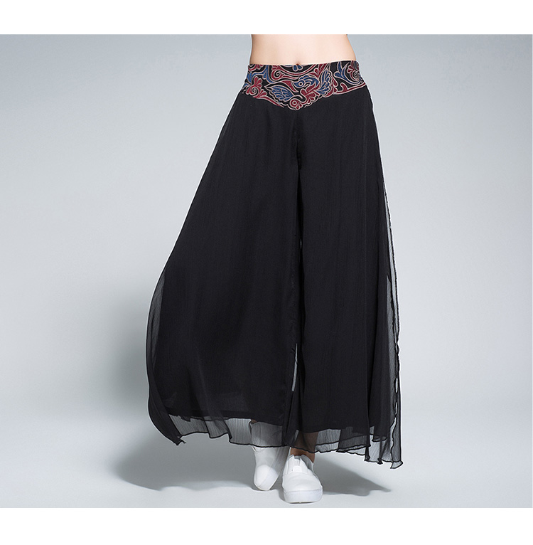 2020夏季民族風復古高腰繡花褲裙雪紡褲大碼寬松闊腿褲瑜伽長褲女1入