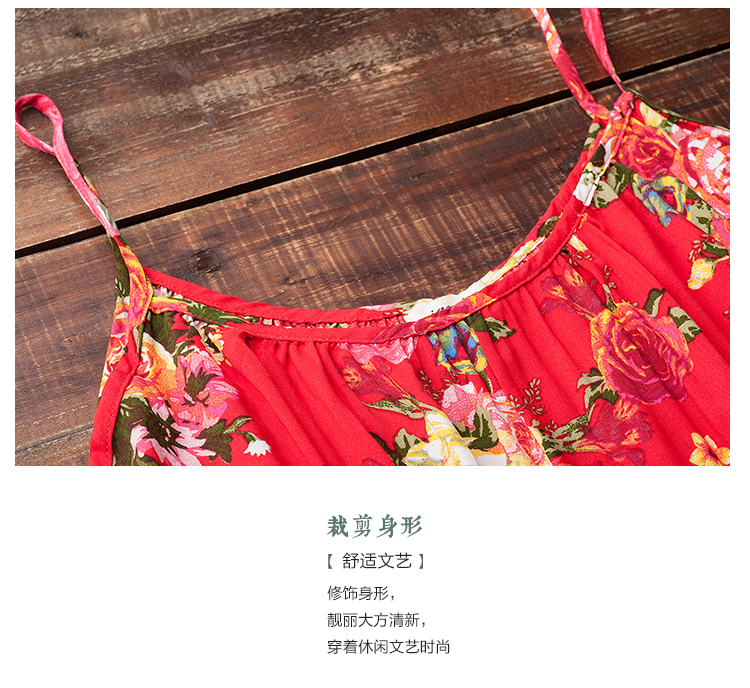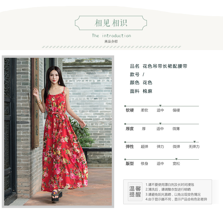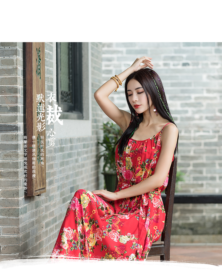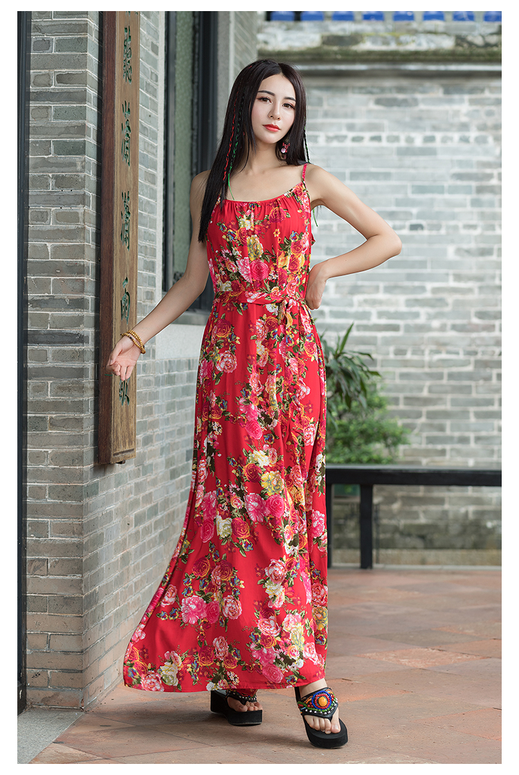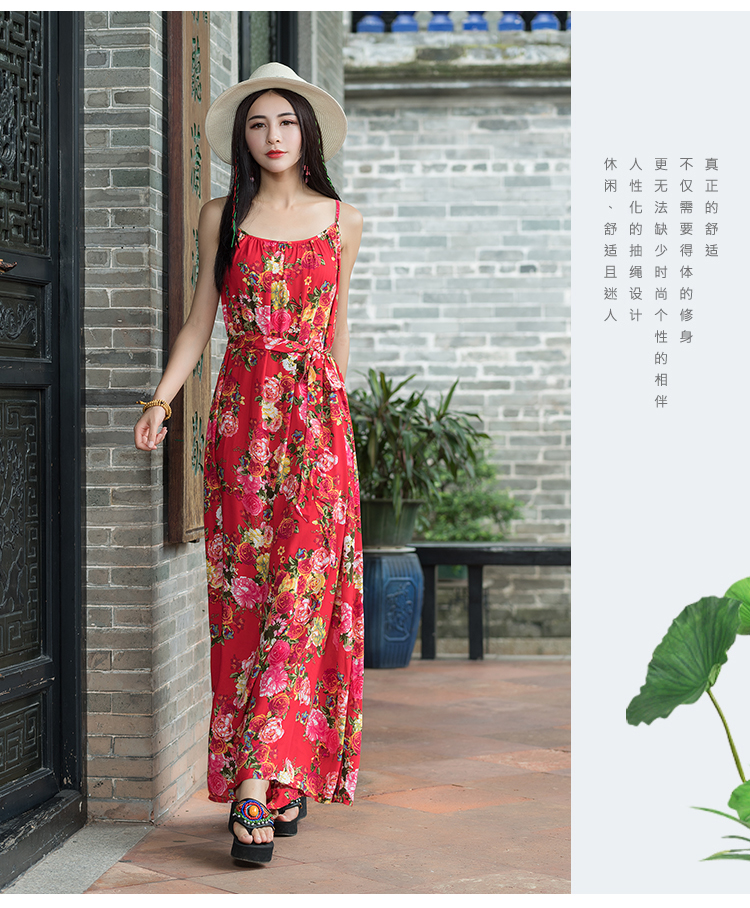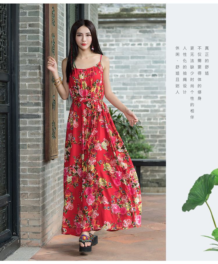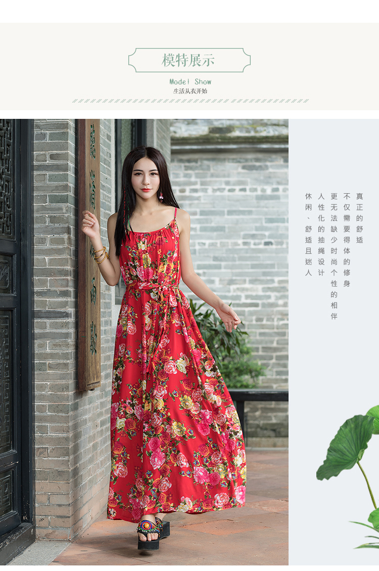 2020夏季棉麻女裝民族風連衣裙復古吊帶裙a字大擺裙棉綢超長裙子1入