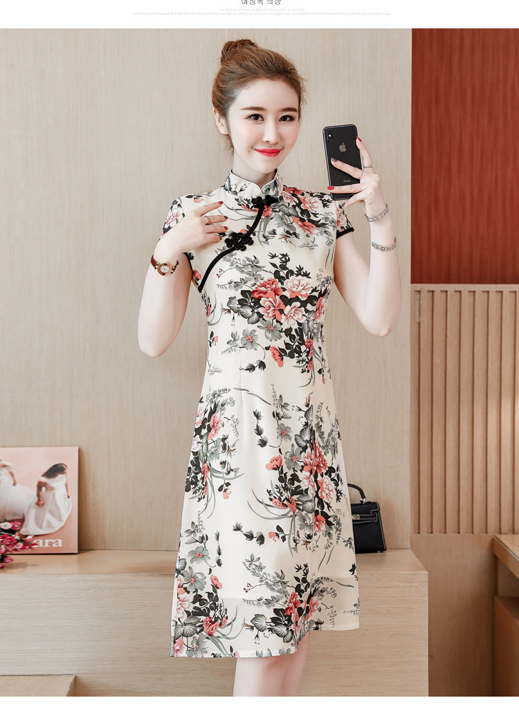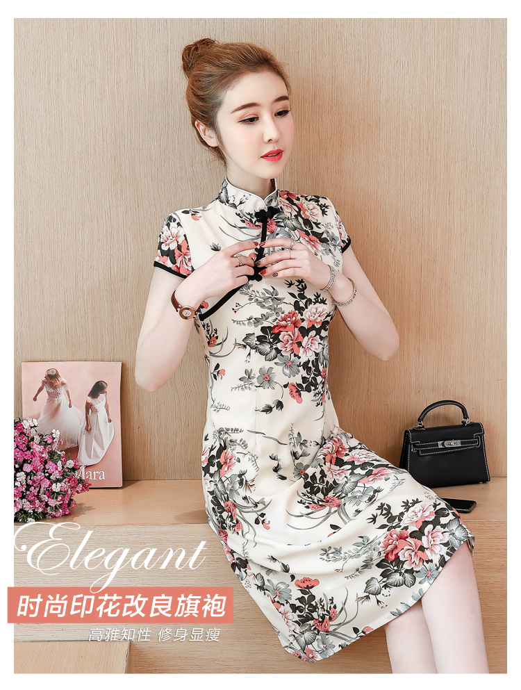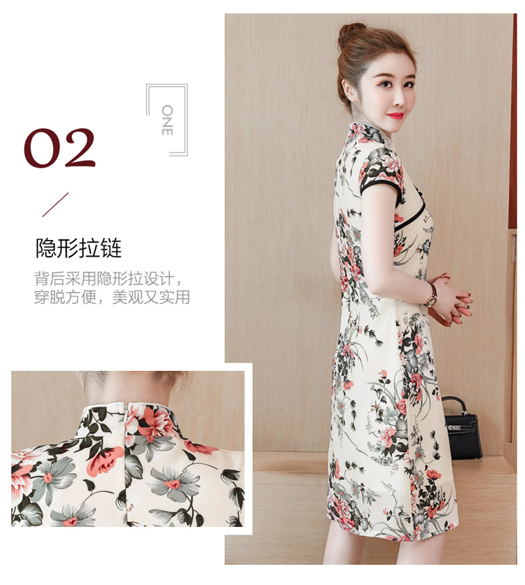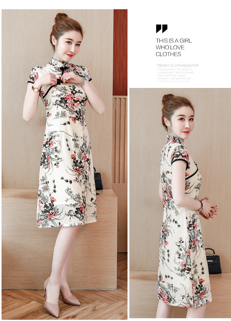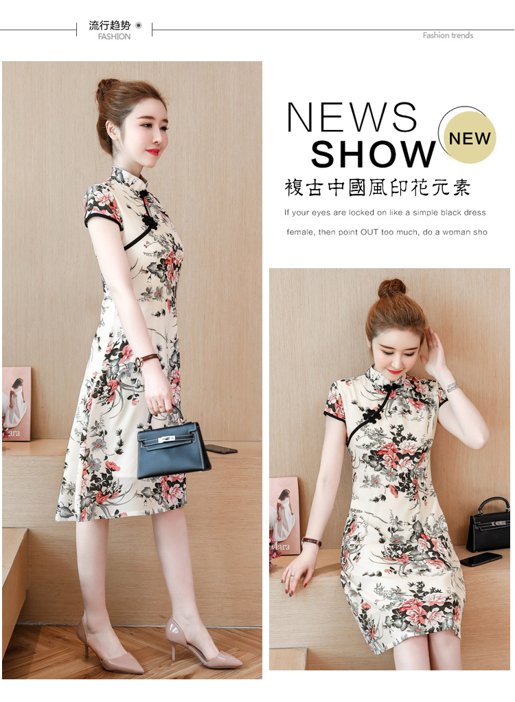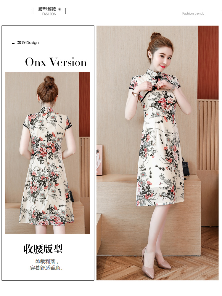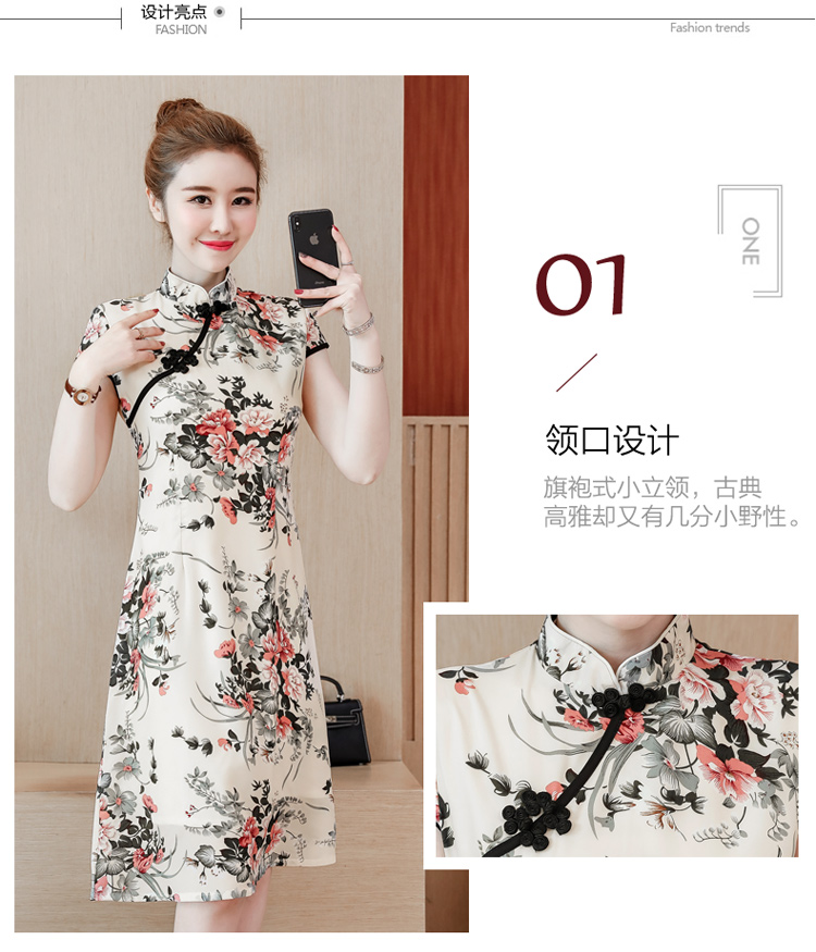 2020夏季新款民族風女裝復古印花連衣裙中式改良盤扣印花旗袍短裙1入