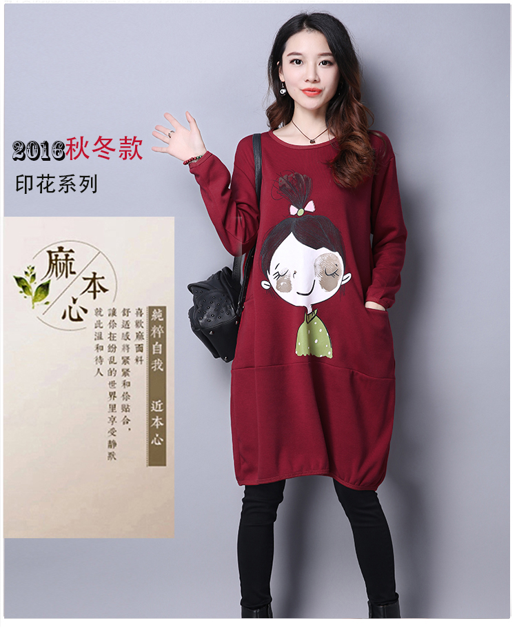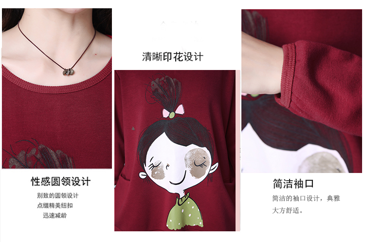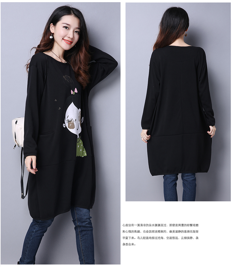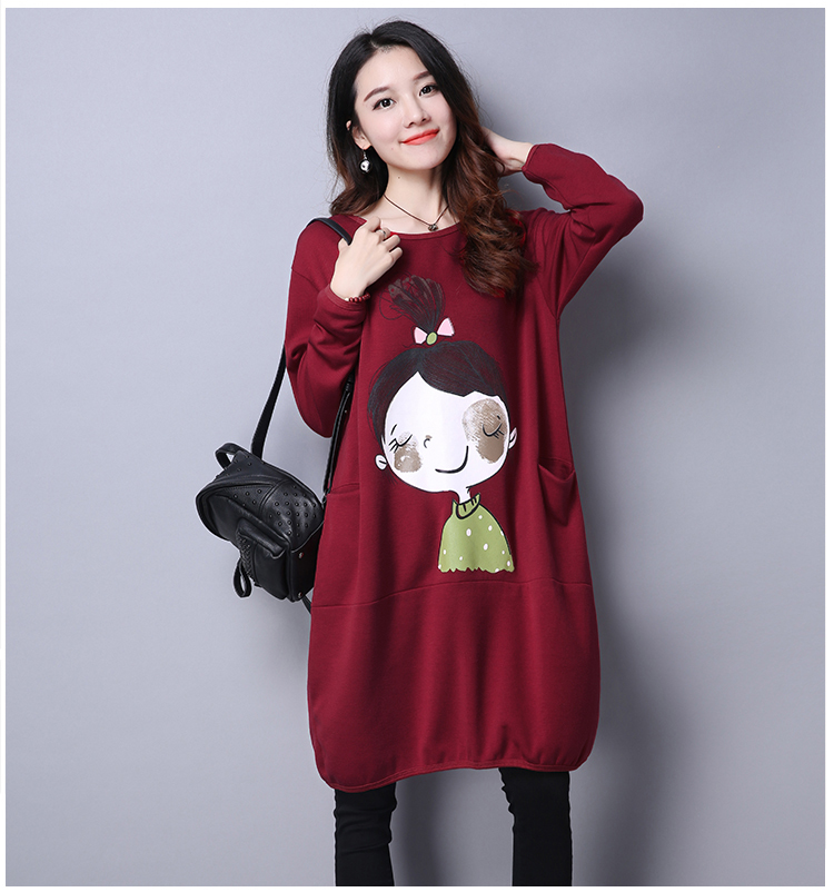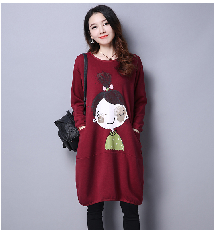 2019秋冬新款韓版學生時尚大碼中長款印花長袖加厚加絨連衣裙衛衣1入