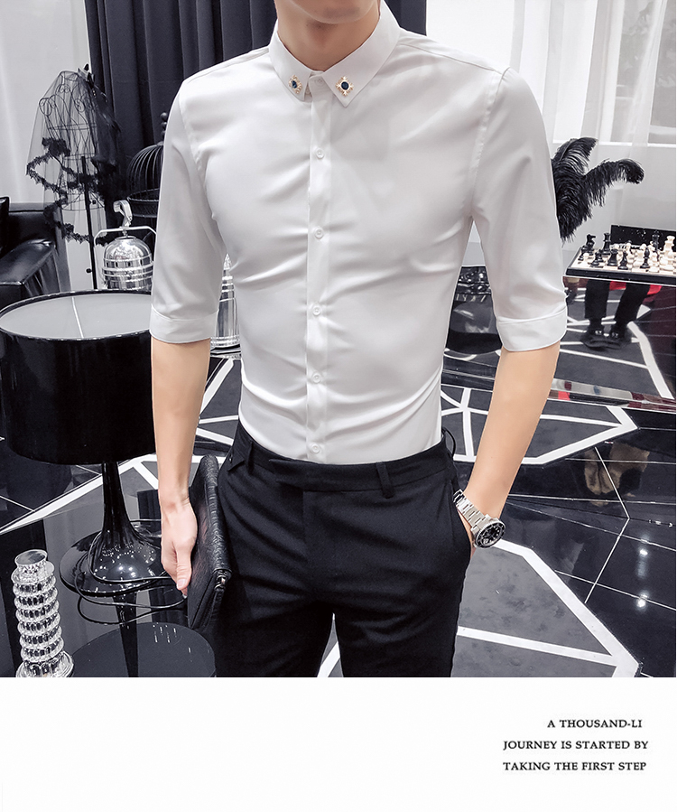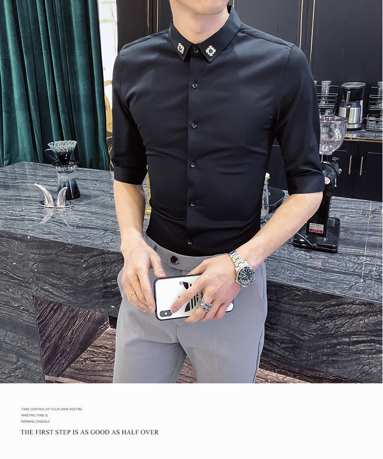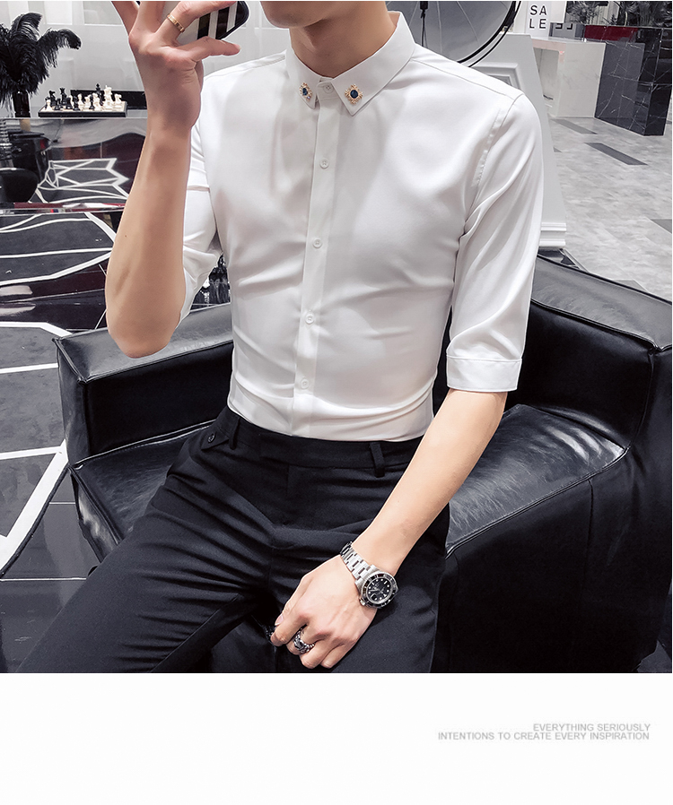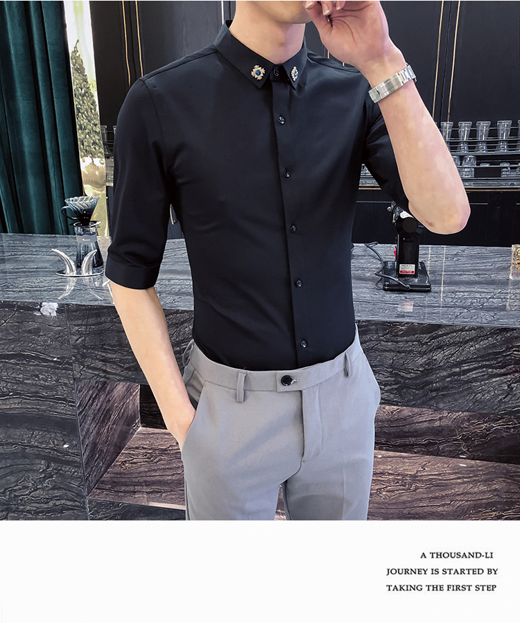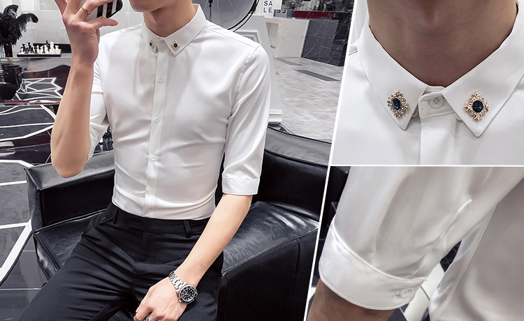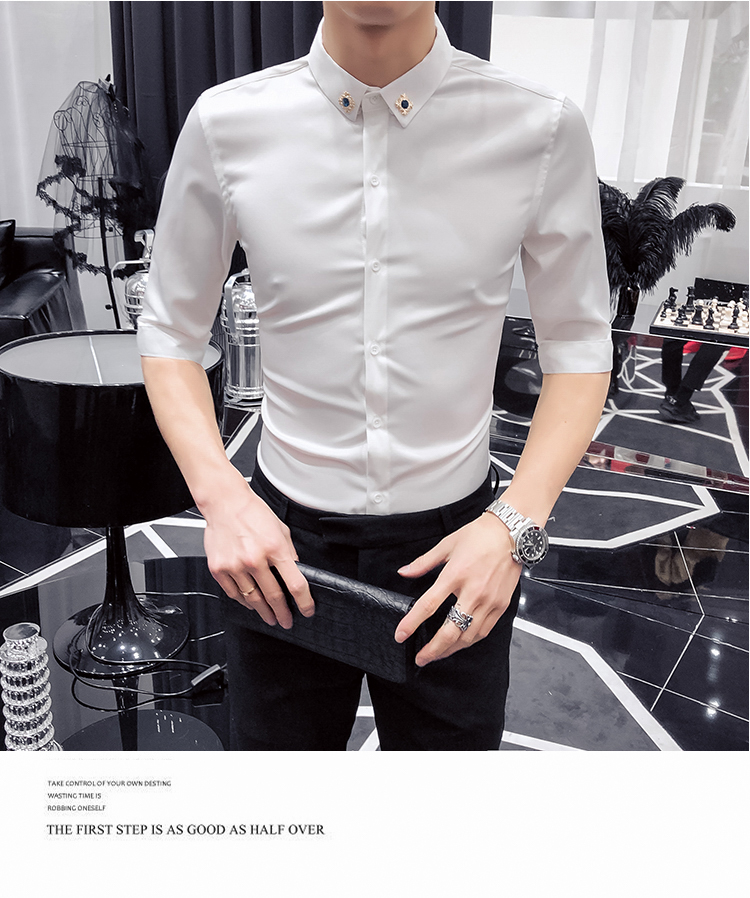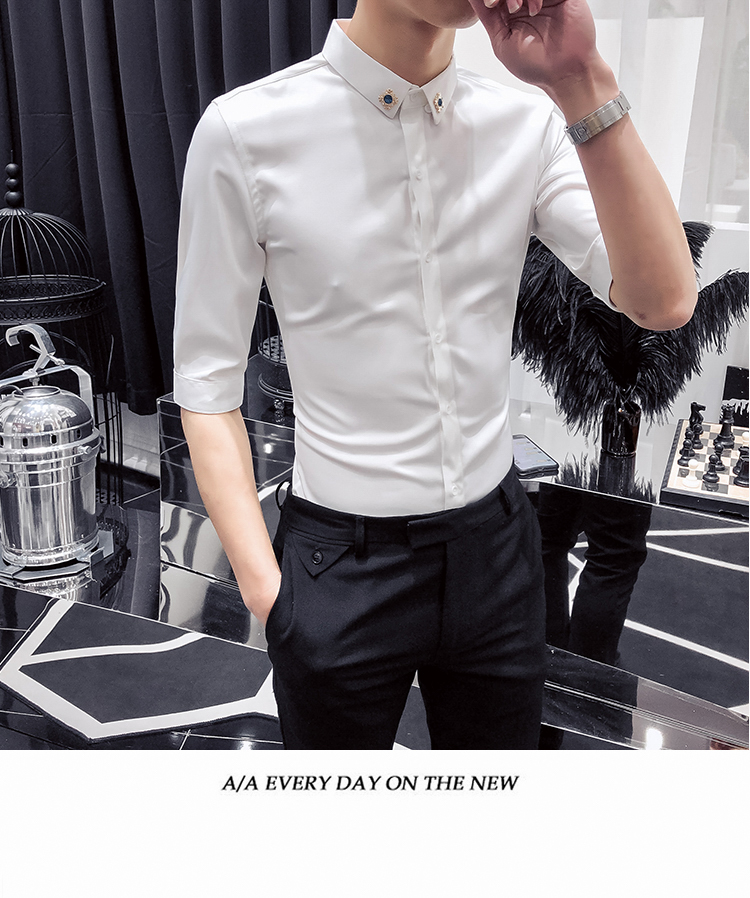 韓版男士中袖襯衫領子金屬裝飾五分袖襯衣