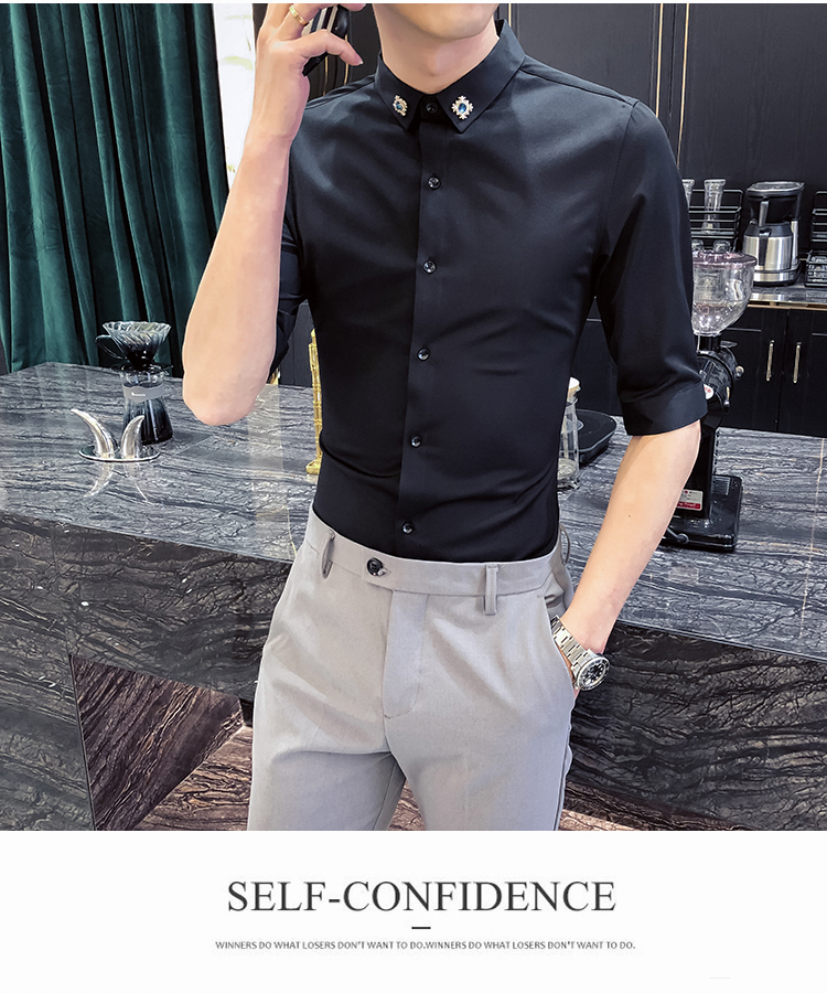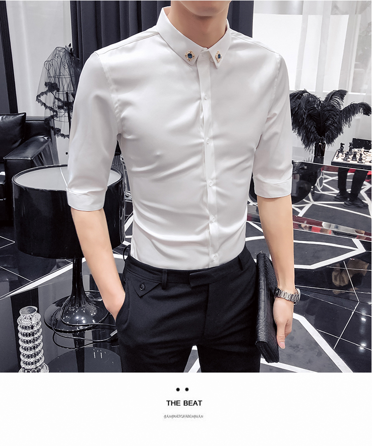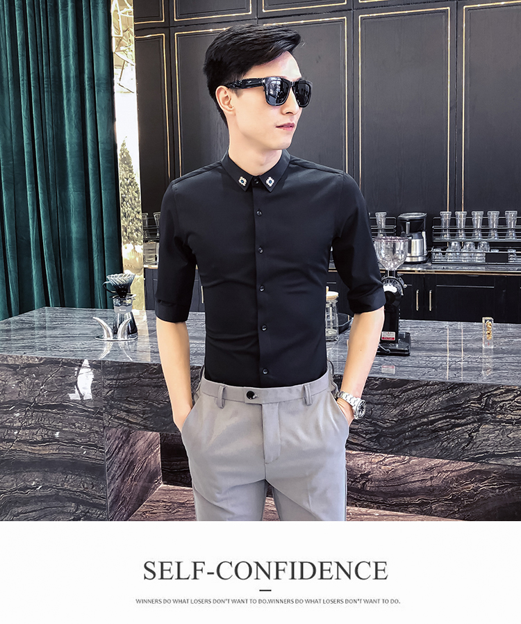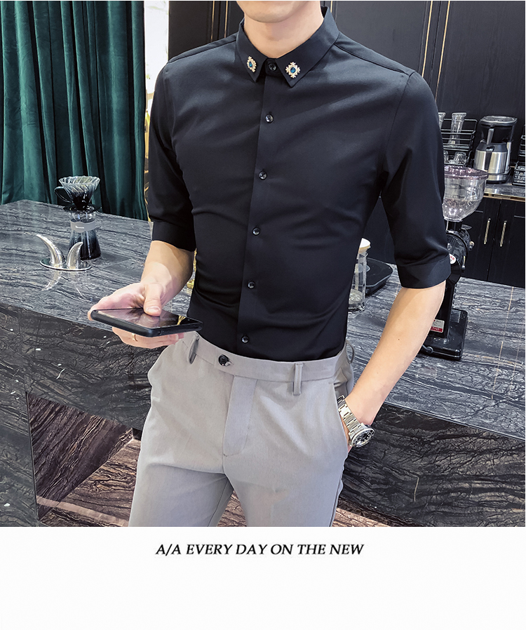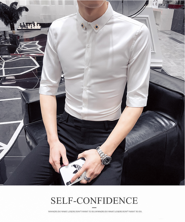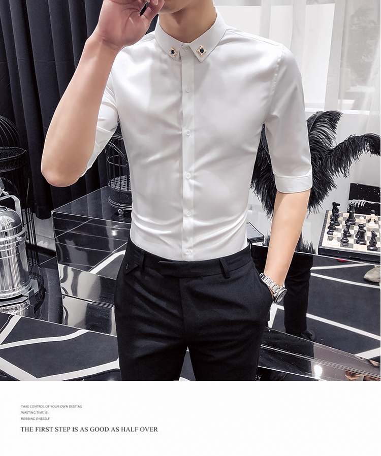 韓版男士中袖襯衫領子金屬裝飾五分袖襯衣