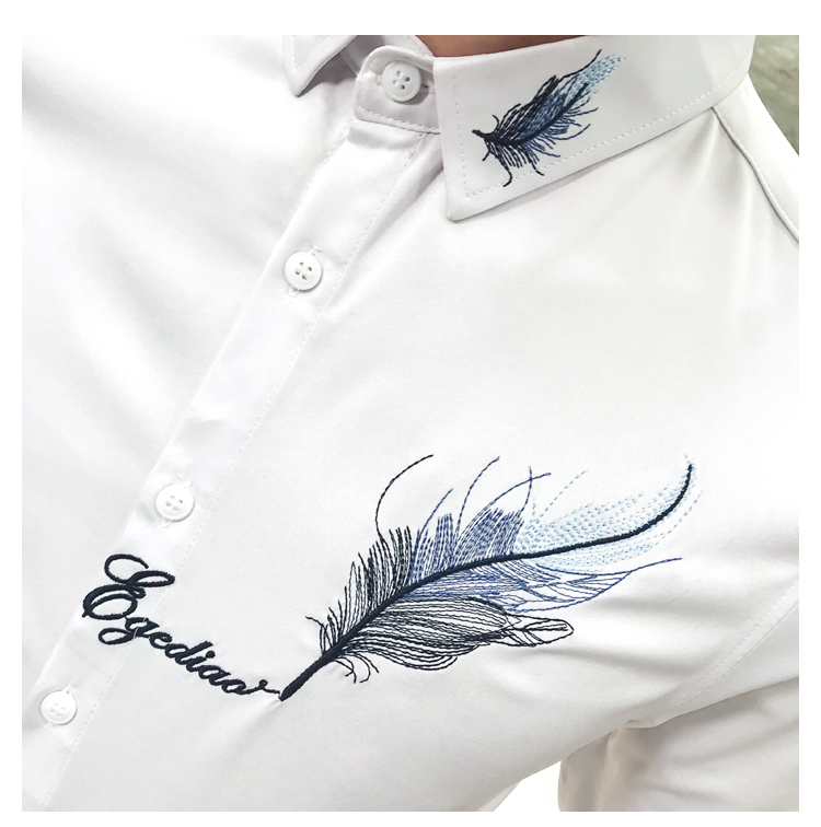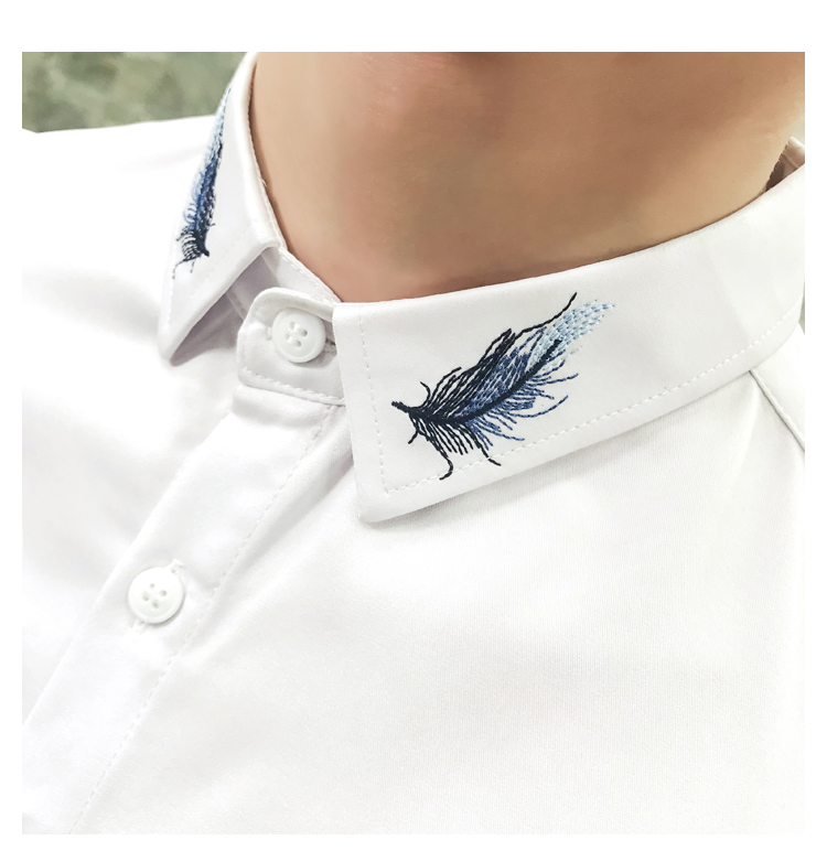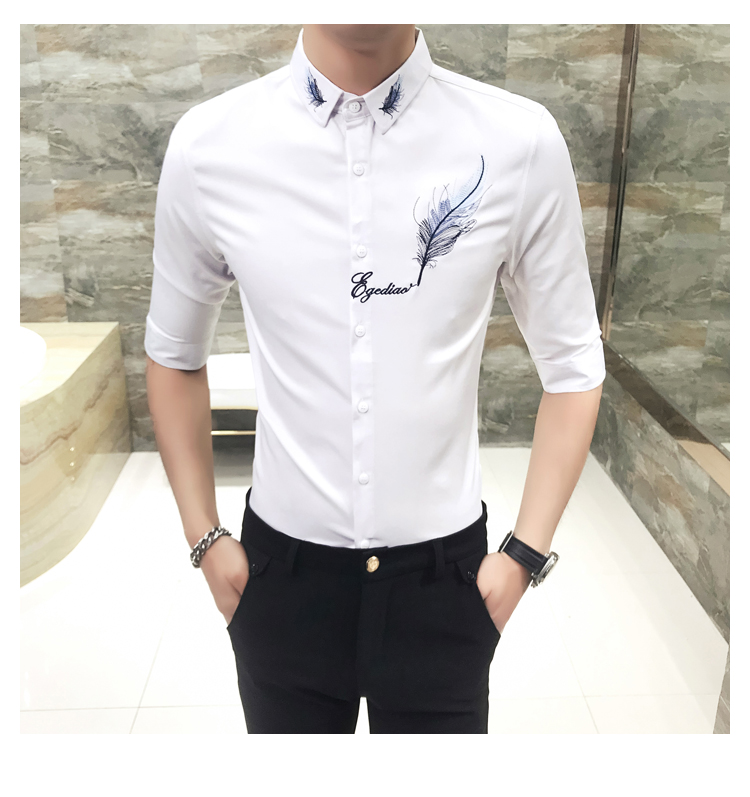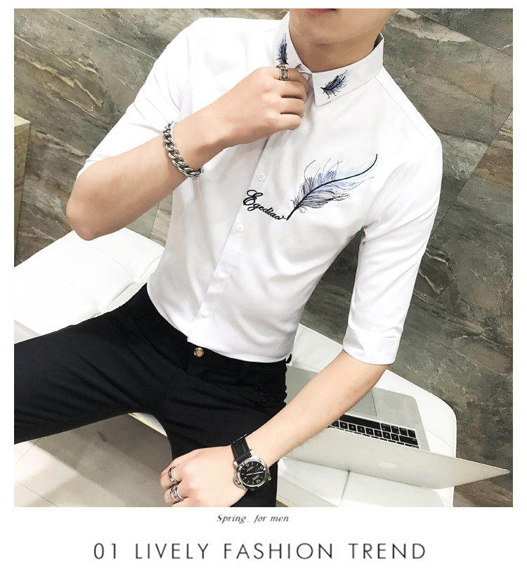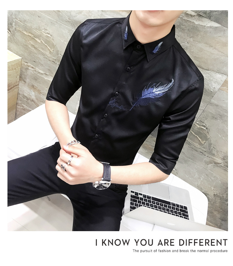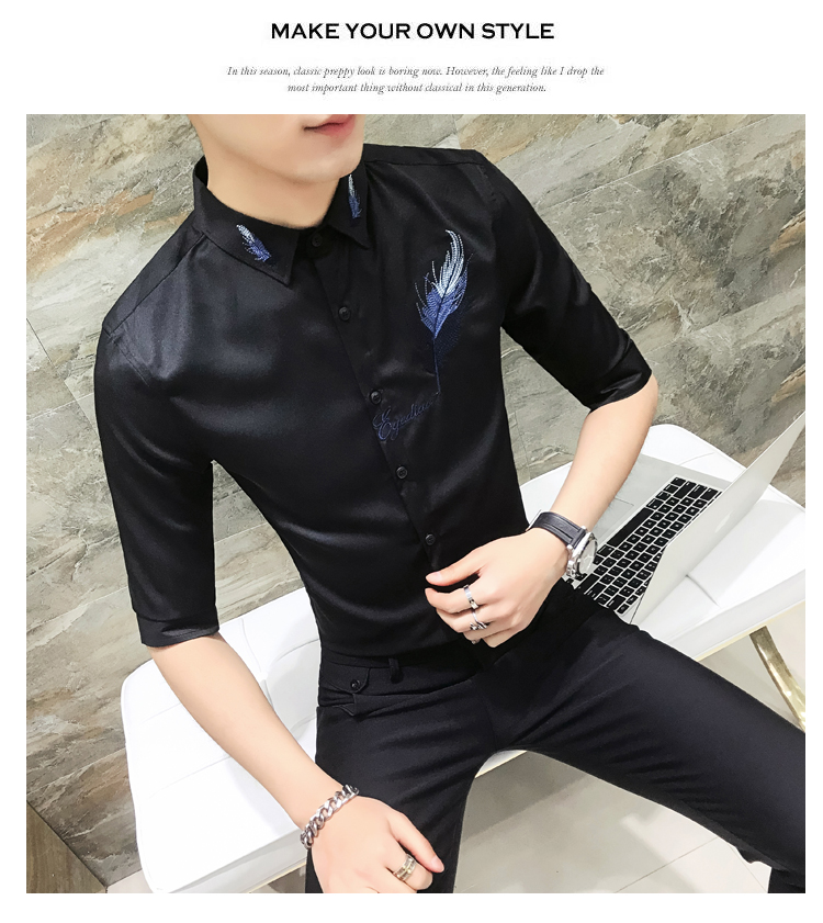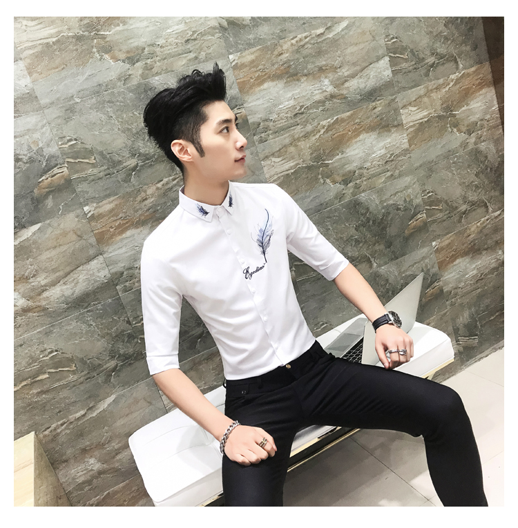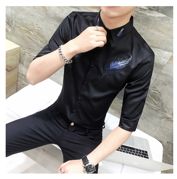 2019夏款潮流韓版修身繡花襯衫男發型師七分袖工作服刺繡七分襯衣