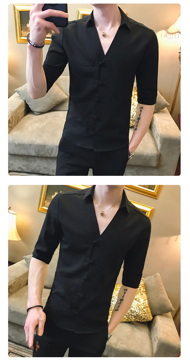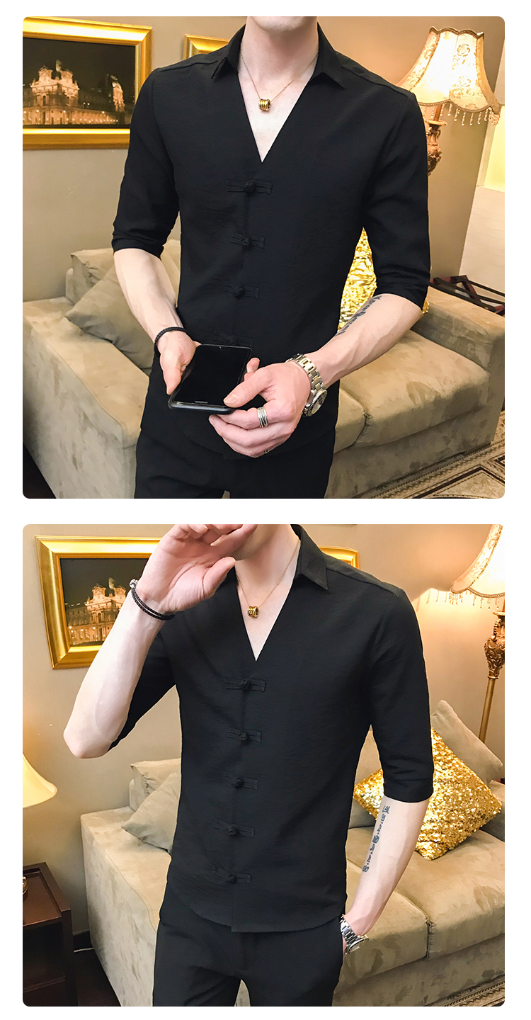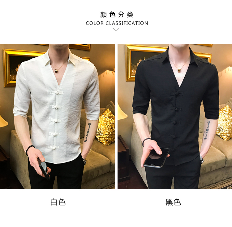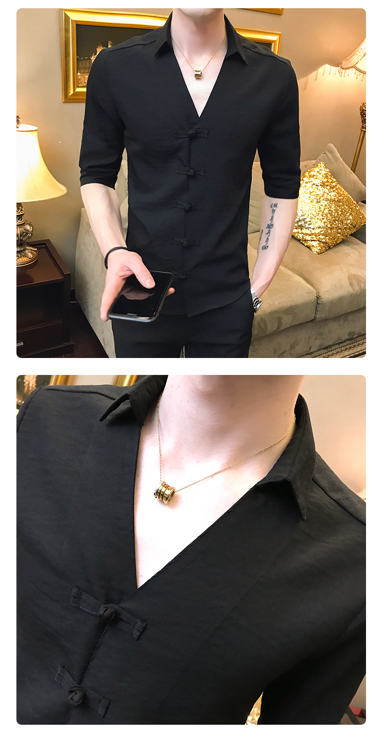 2019夏季新款心機襯衣男士很仙的洋氣韓版修身布扣休閑短袖襯衫男