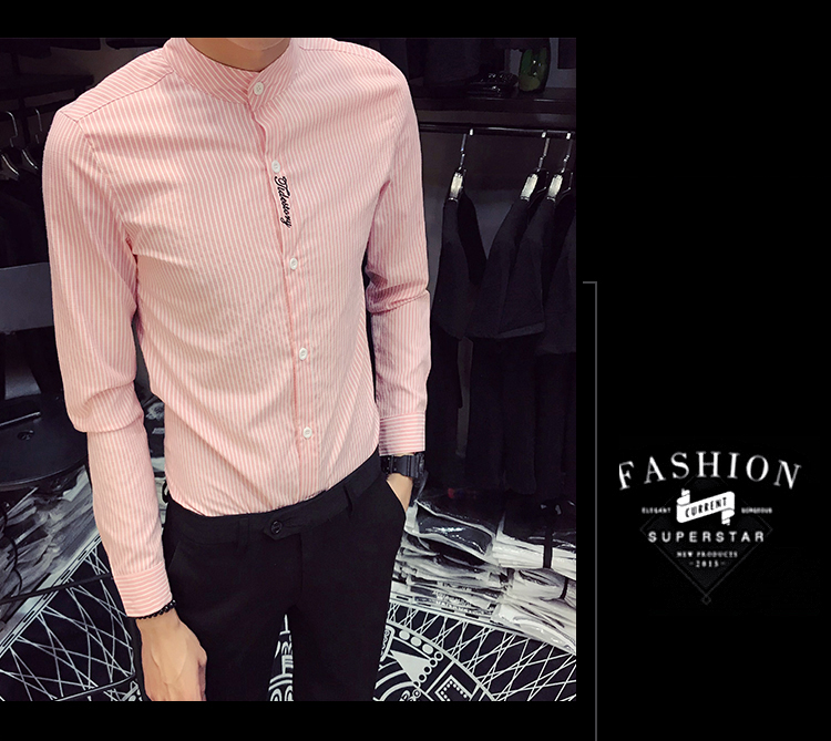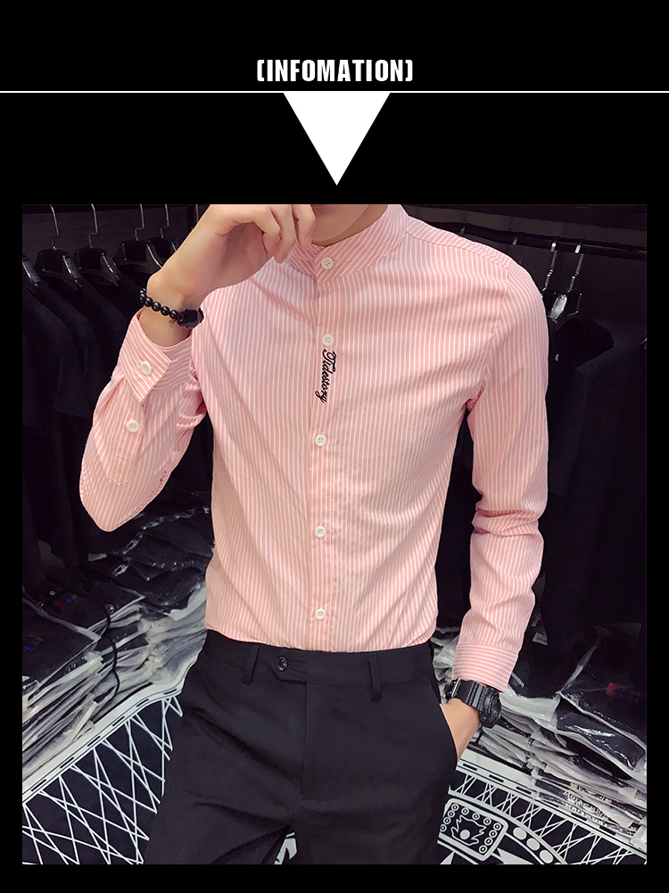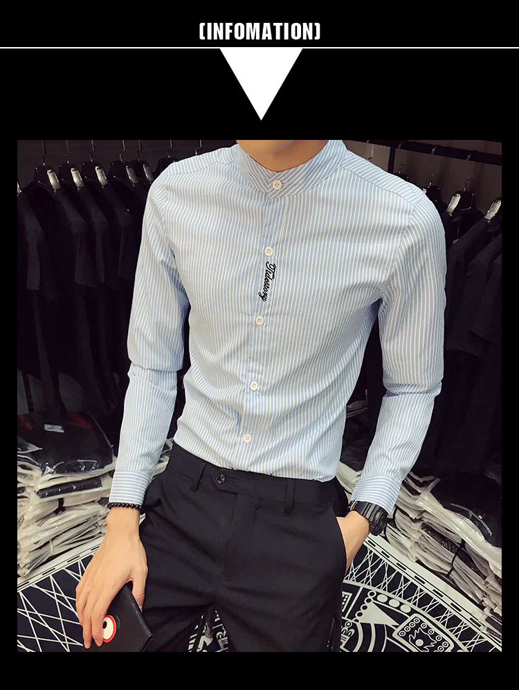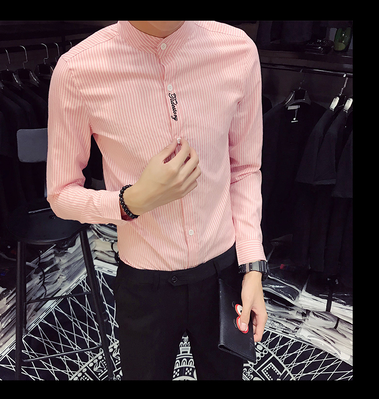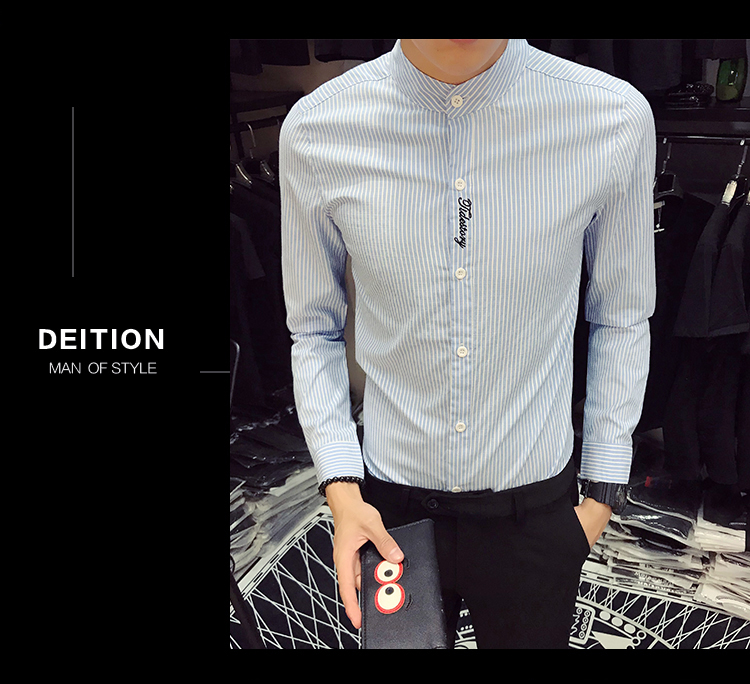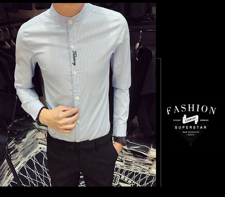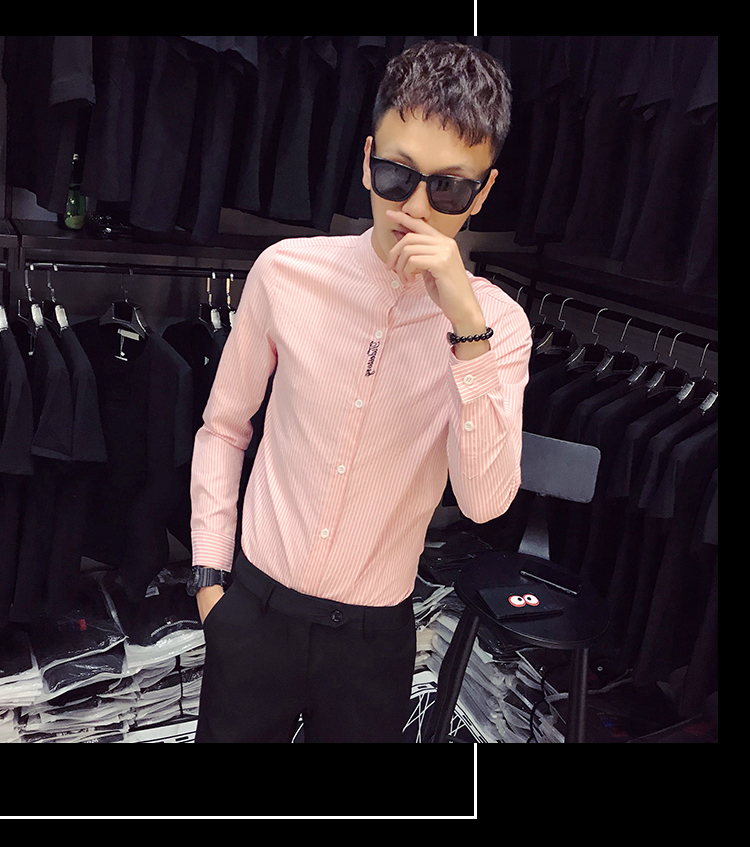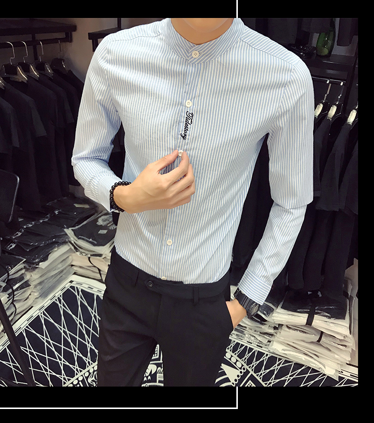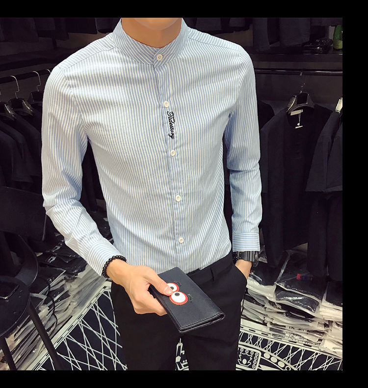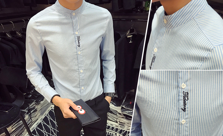 2019早春韓版男孩學生斯文條紋襯衫潮流修身小衫立領帥氣襯衣上衣