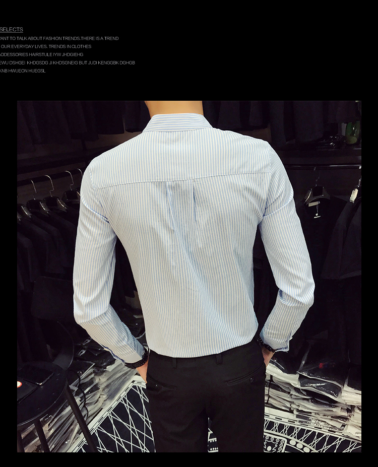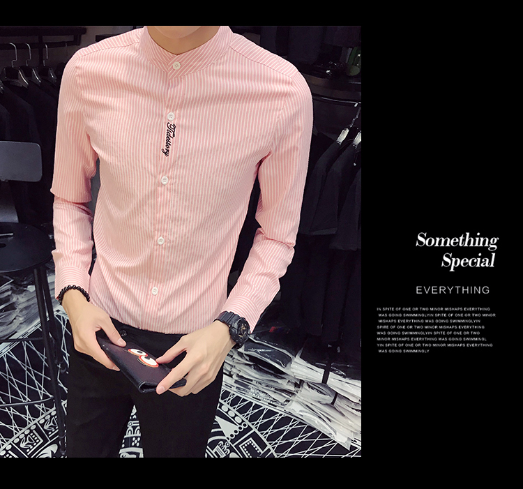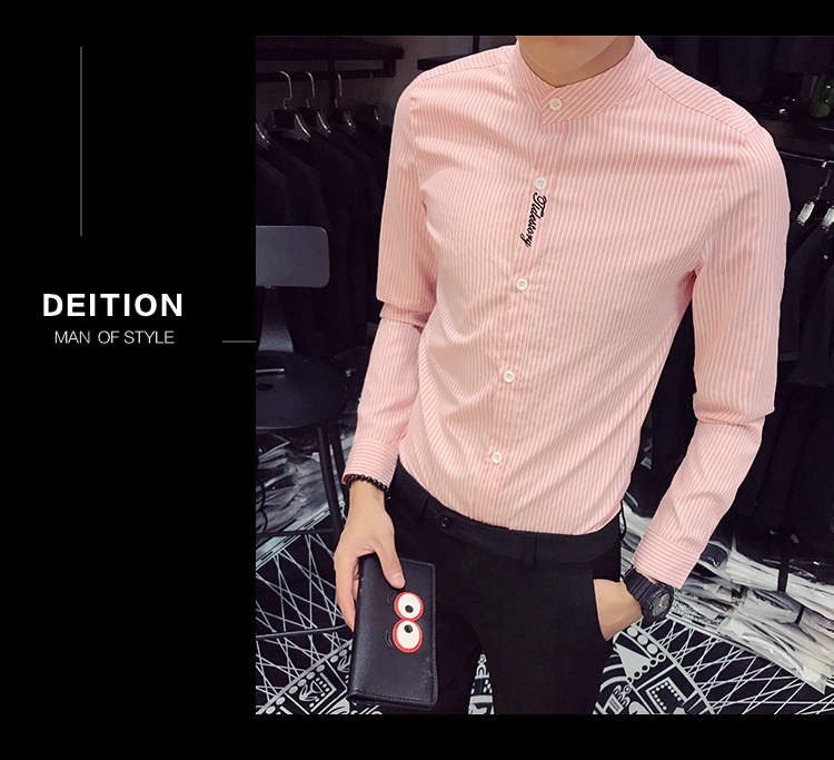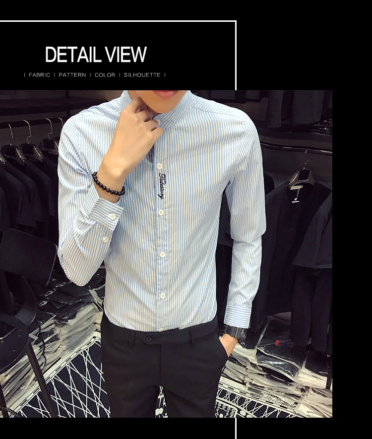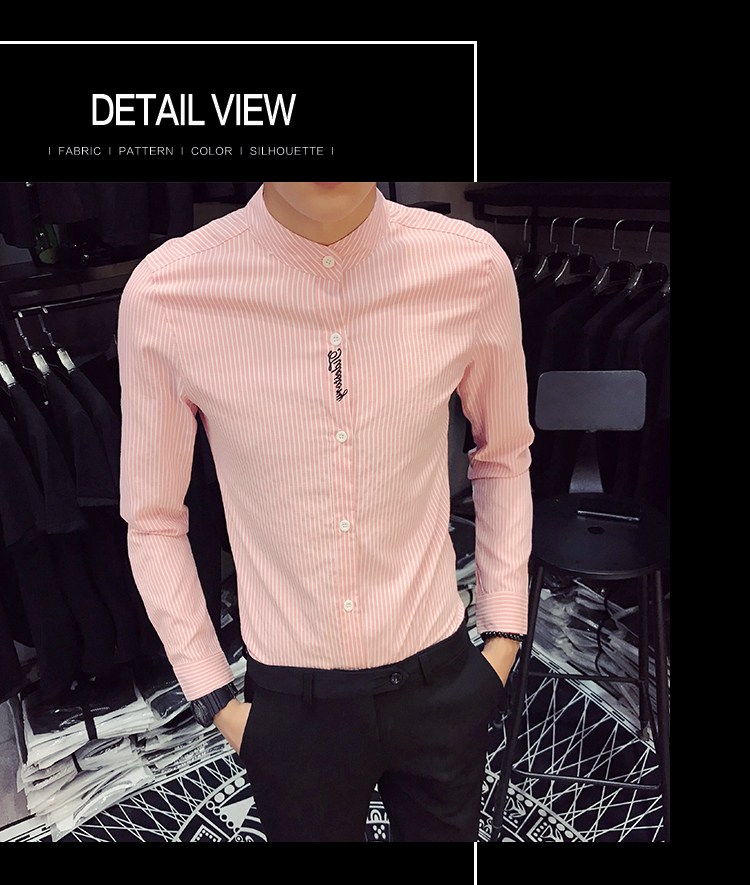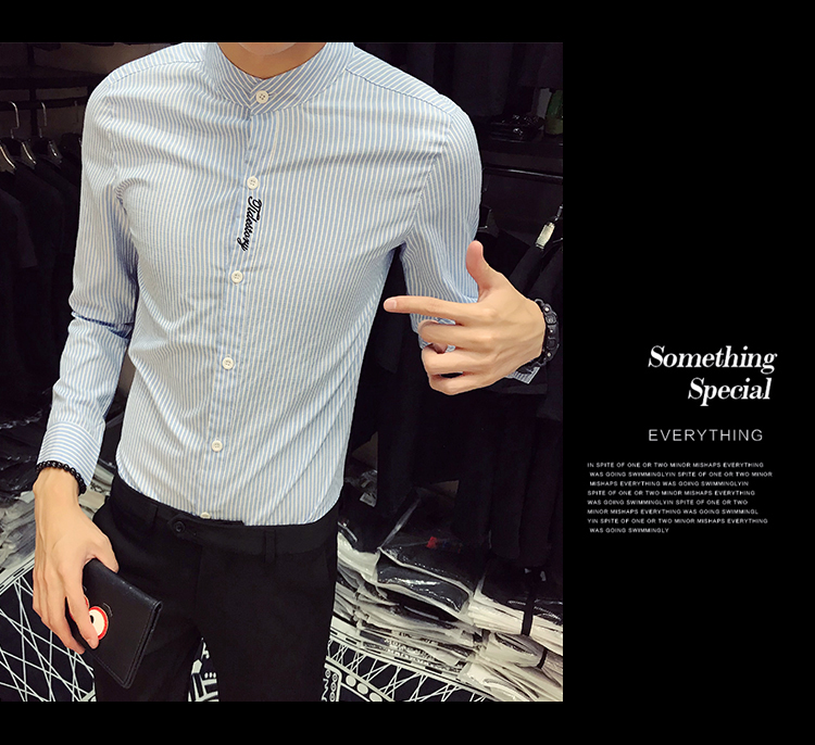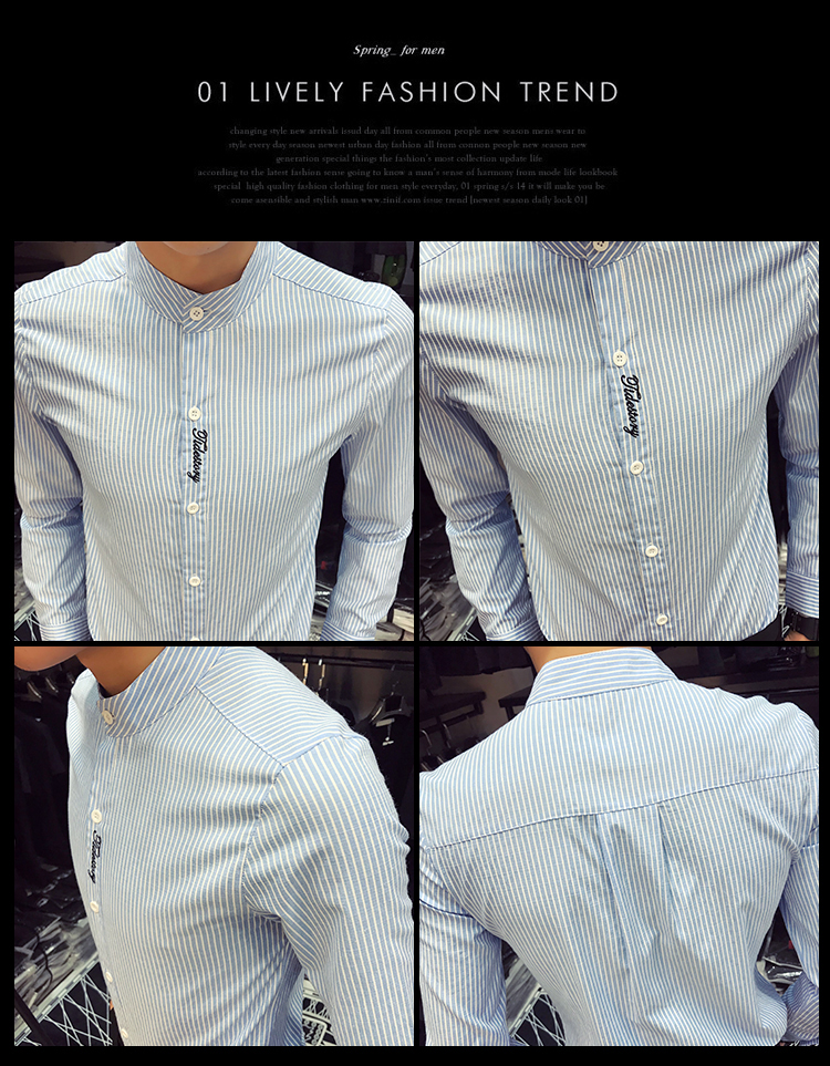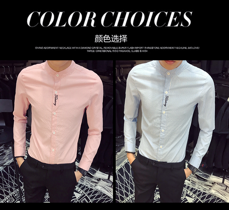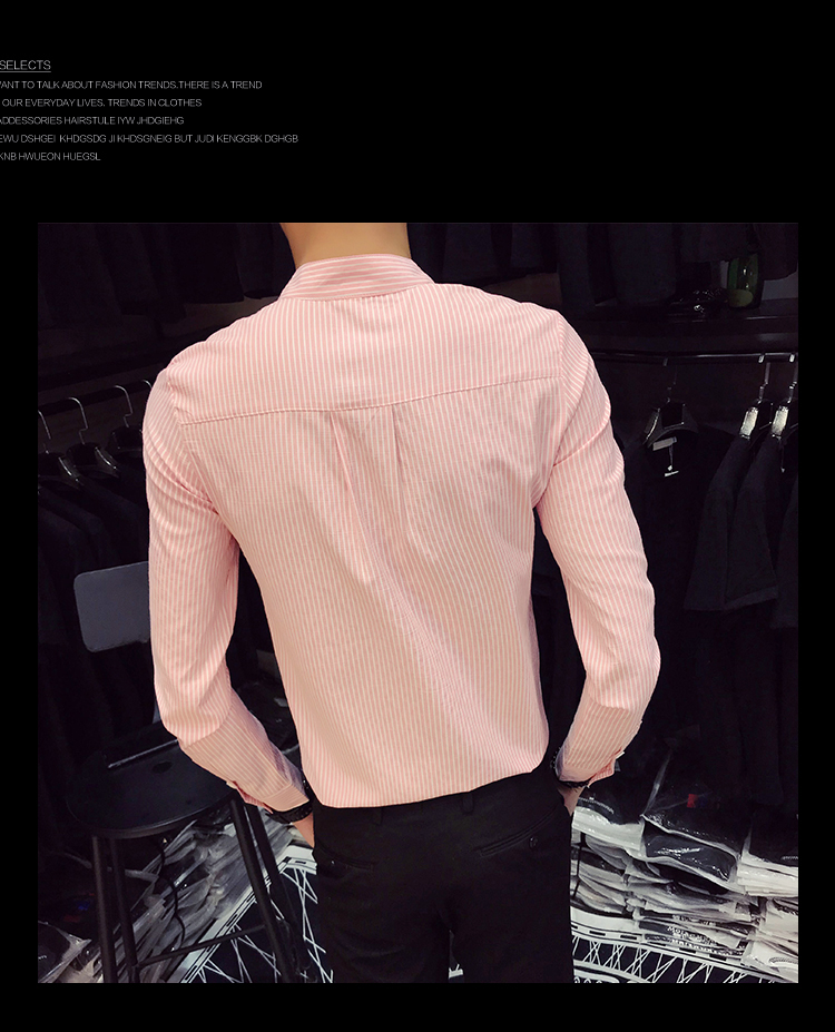 2019早春韓版男孩學生斯文條紋襯衫潮流修身小衫立領帥氣襯衣上衣