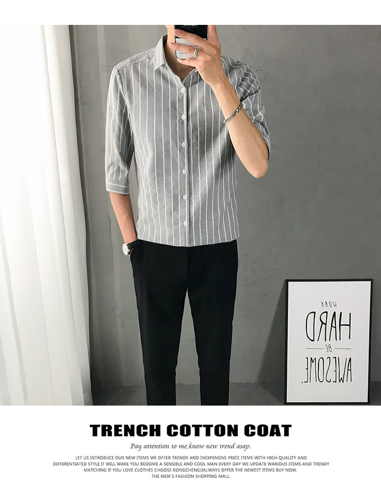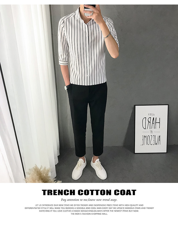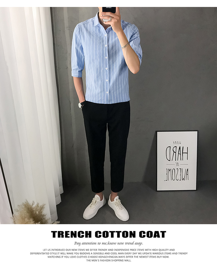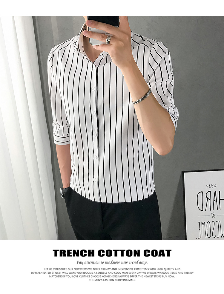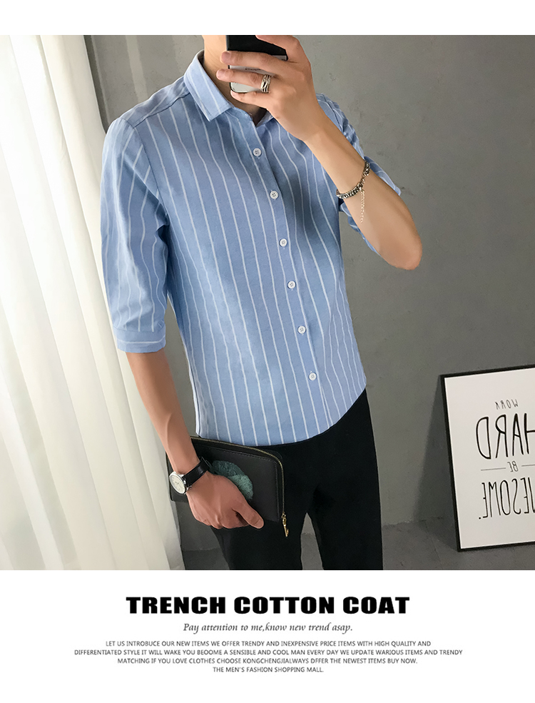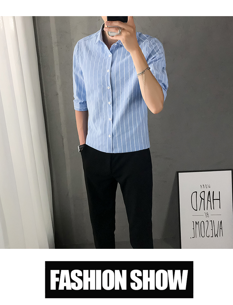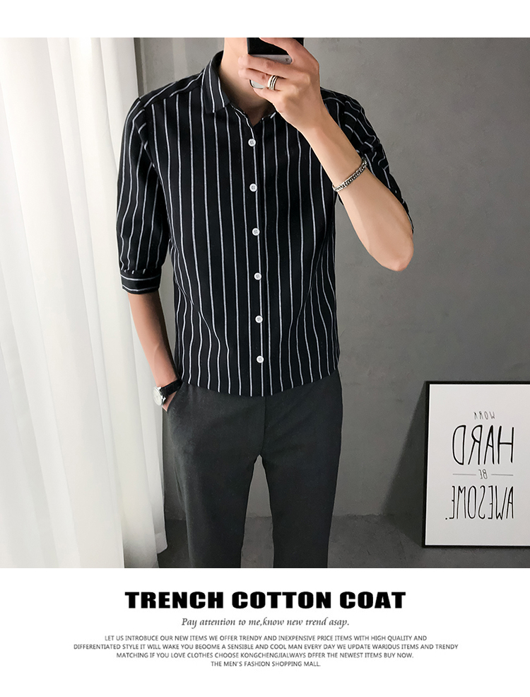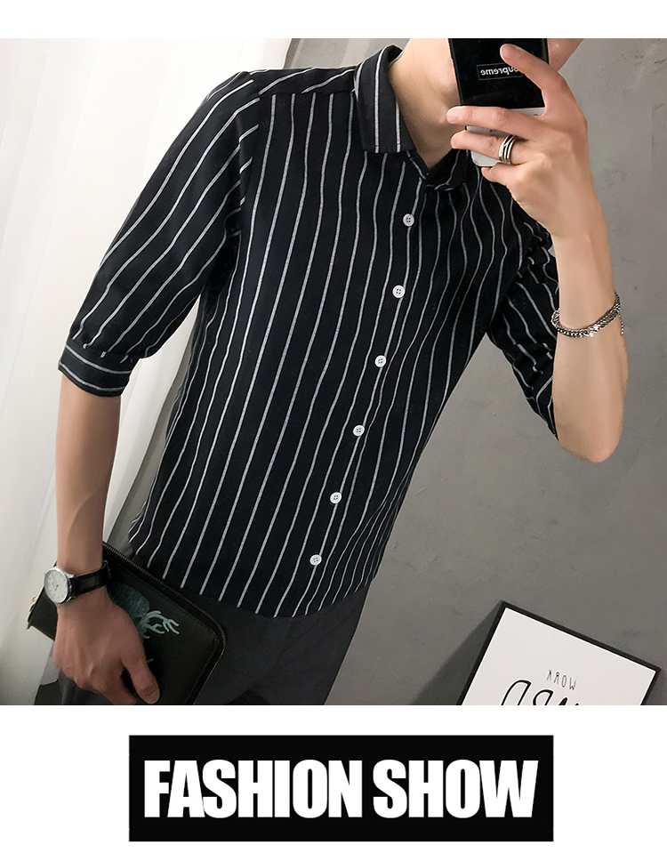 2019夏季新款男士條紋5五分中袖襯衫男韓版潮流網紅百搭襯衣上衣