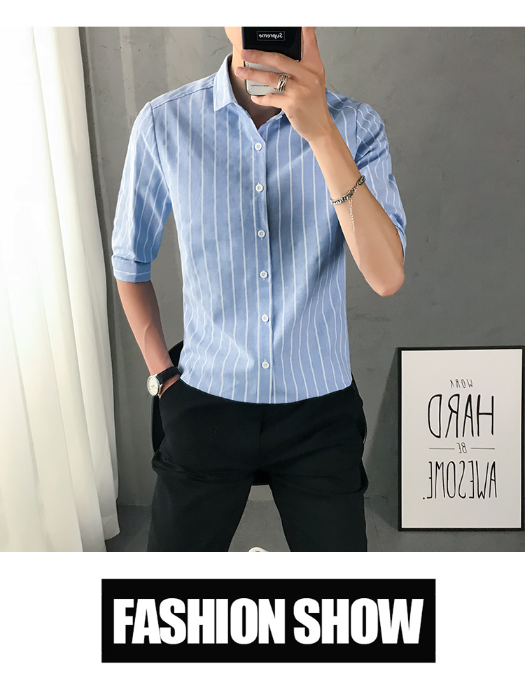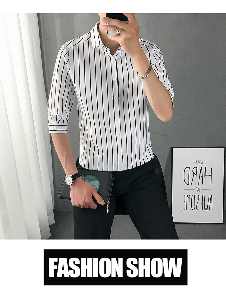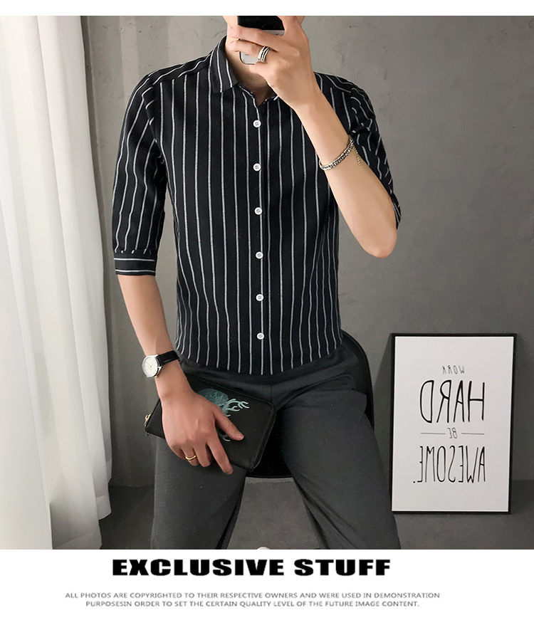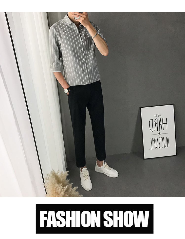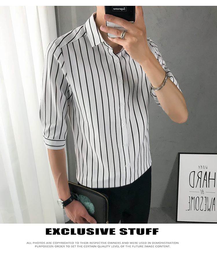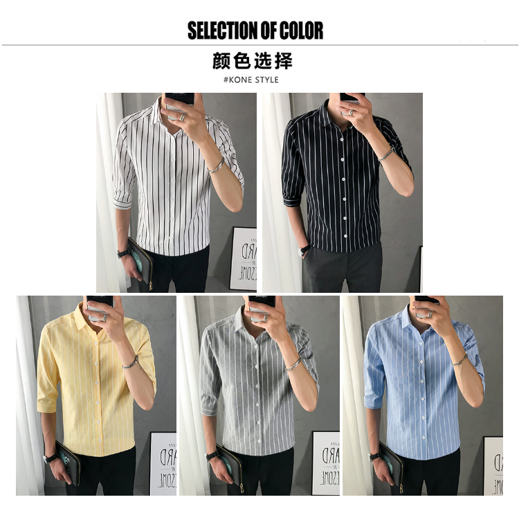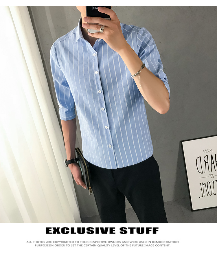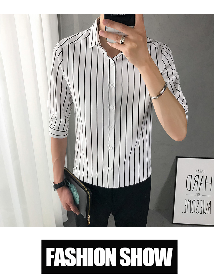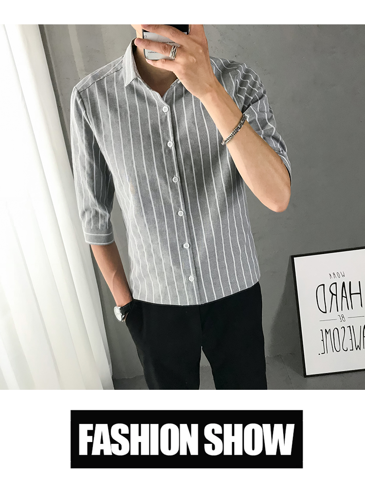 2019夏季新款男士條紋5五分中袖襯衫男韓版潮流網紅百搭襯衣上衣