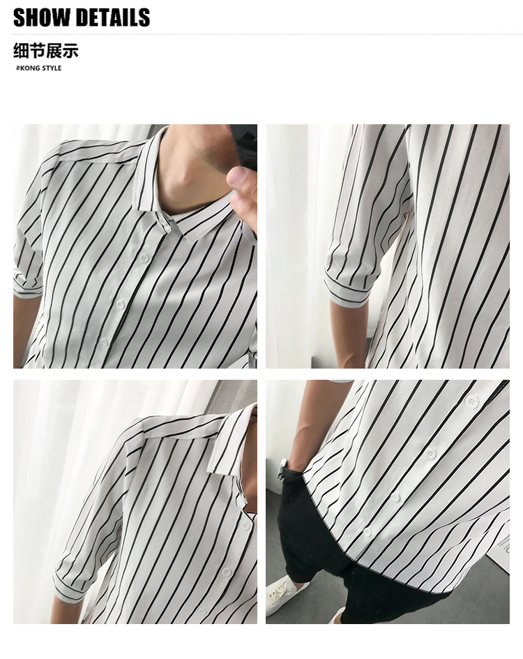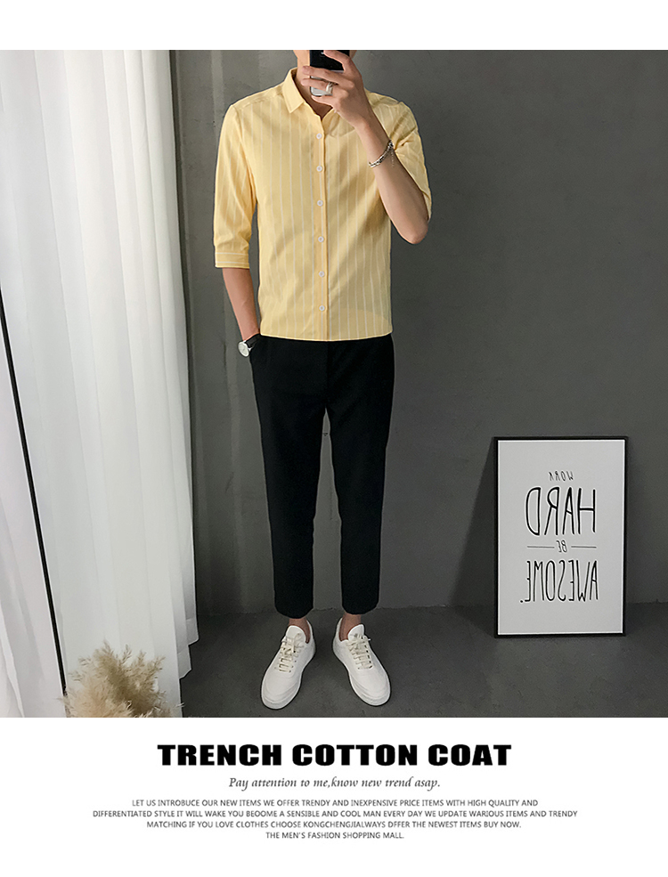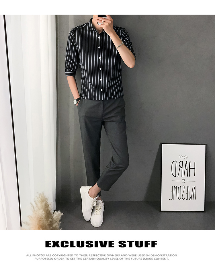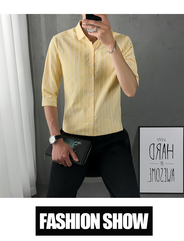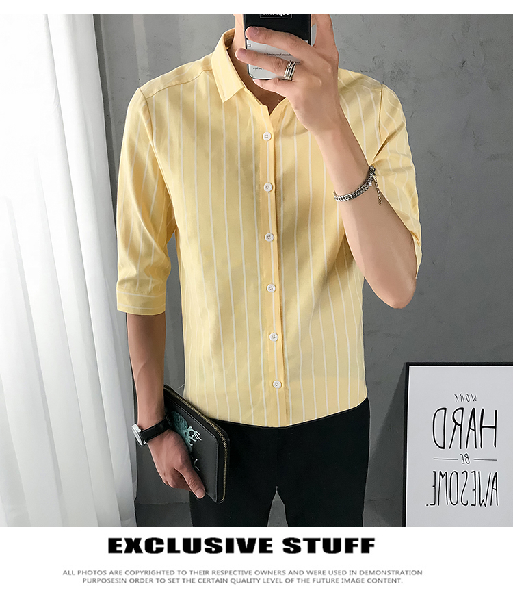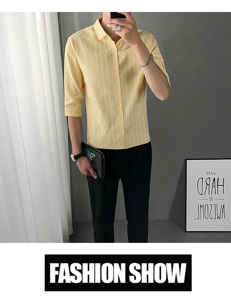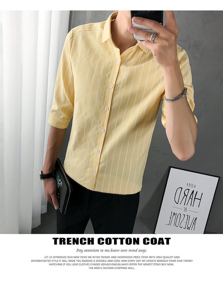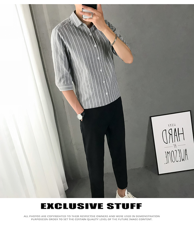 2019夏季新款男士條紋5五分中袖襯衫男韓版潮流網紅百搭襯衣上衣
