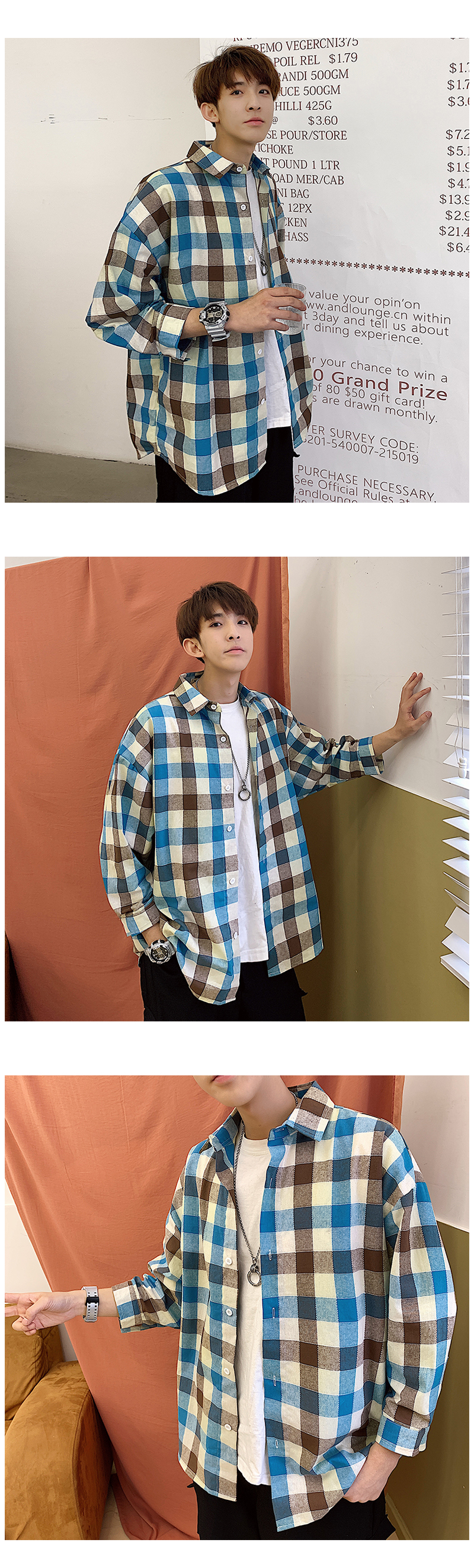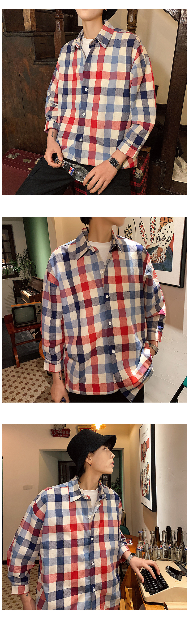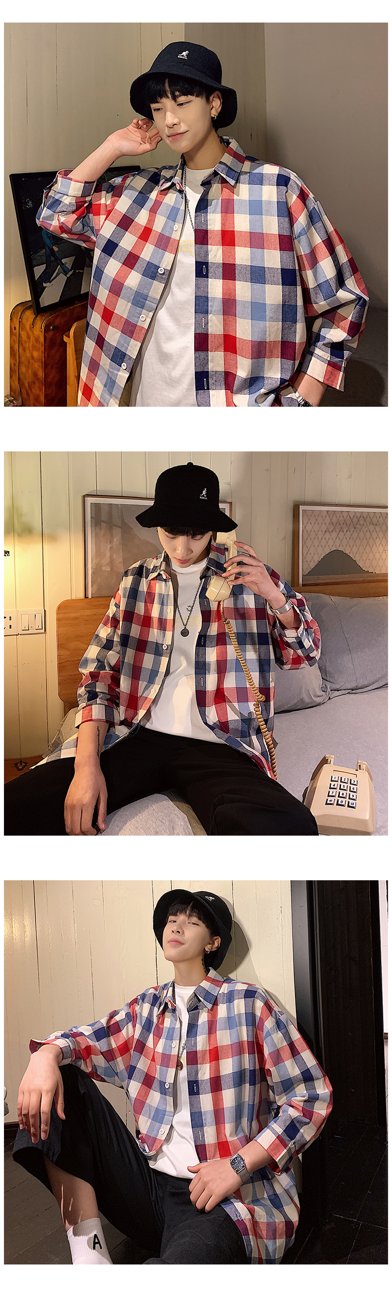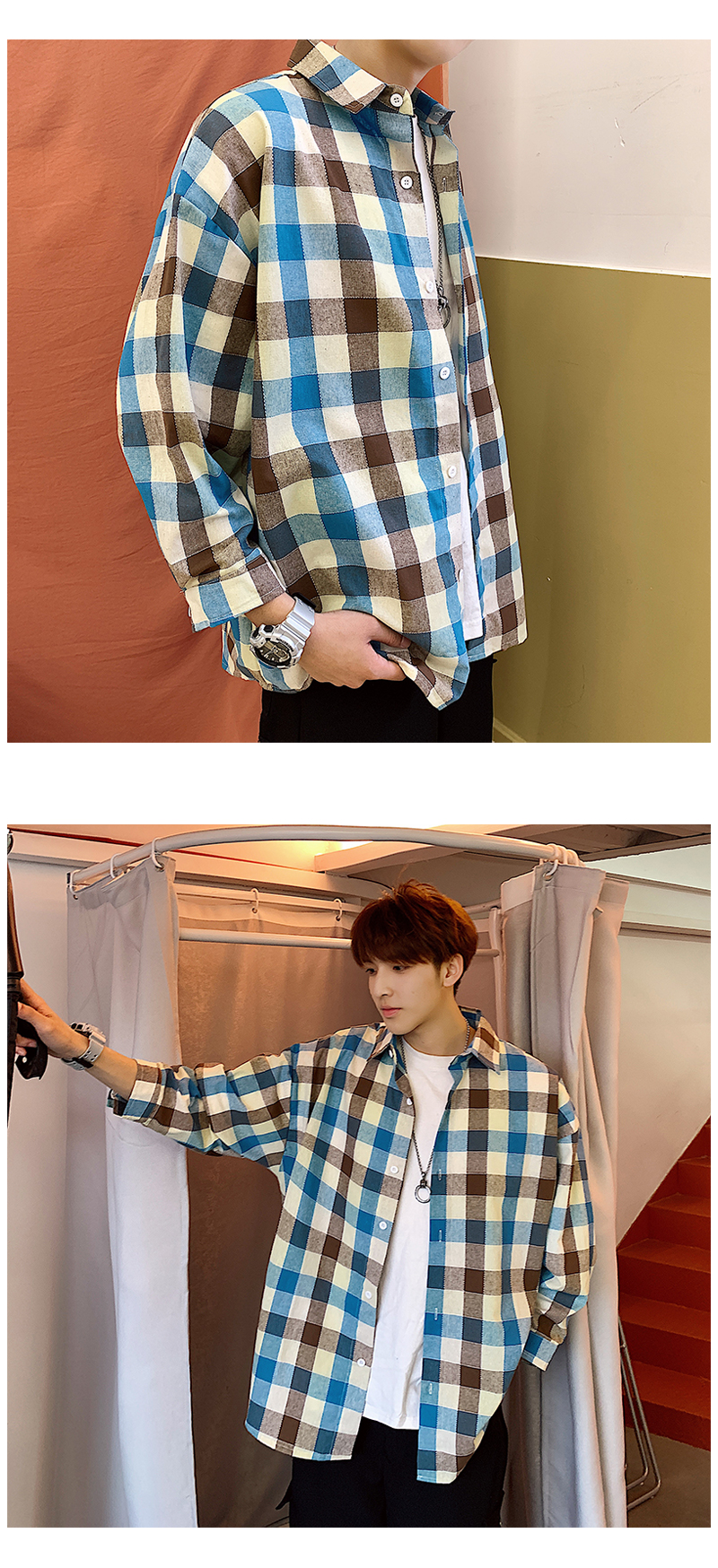 2019港風春秋季新款ins潮牌格子七分袖7分袖襯衫韓版寬松襯衣男裝