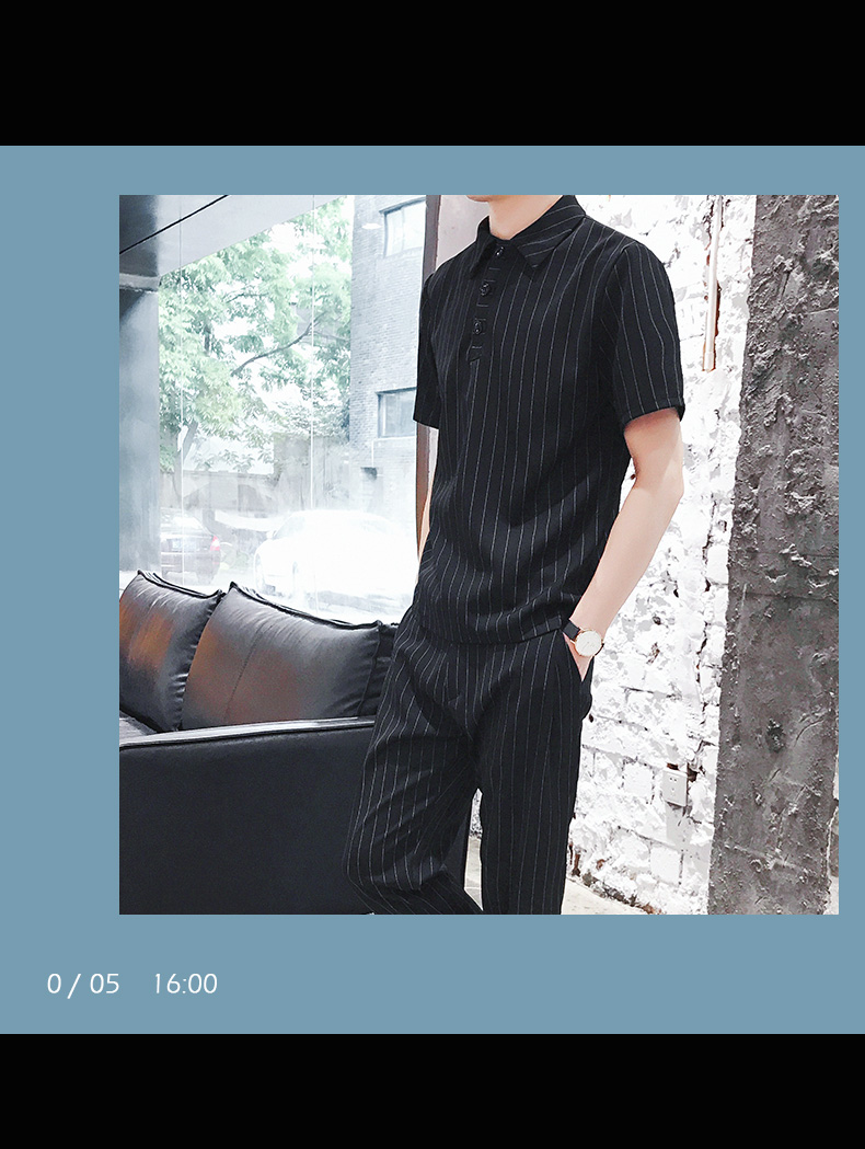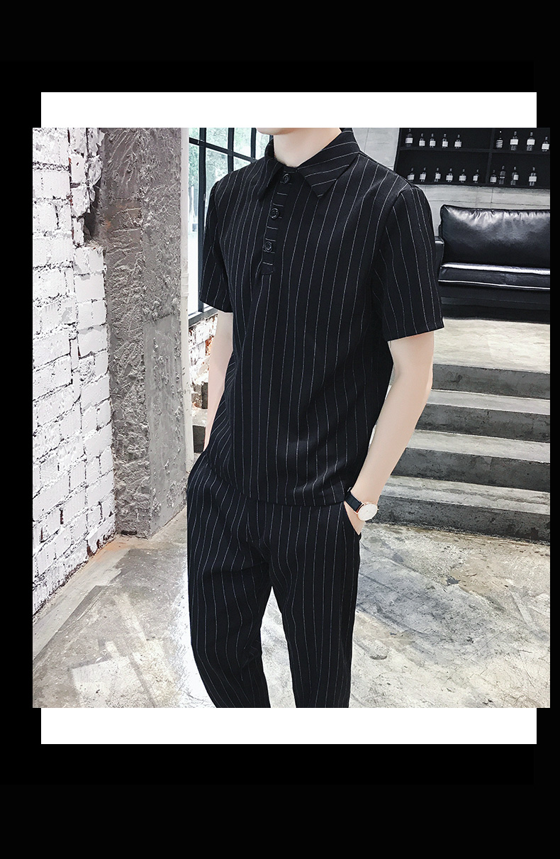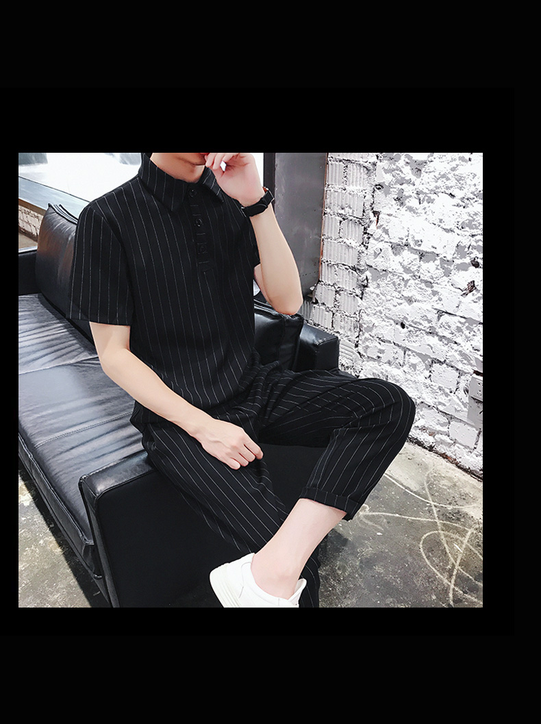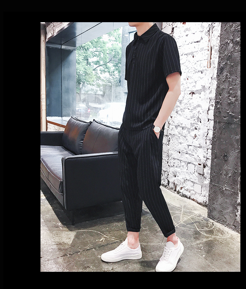 2019夏季新款條紋九分褲男一套裝大碼兩件套休閑短袖POLO上衣服潮