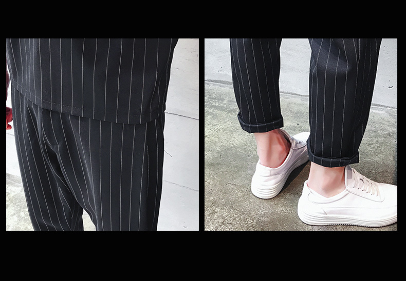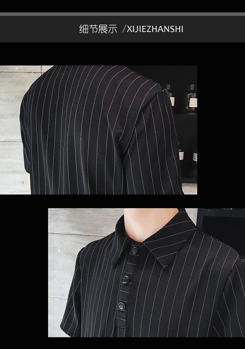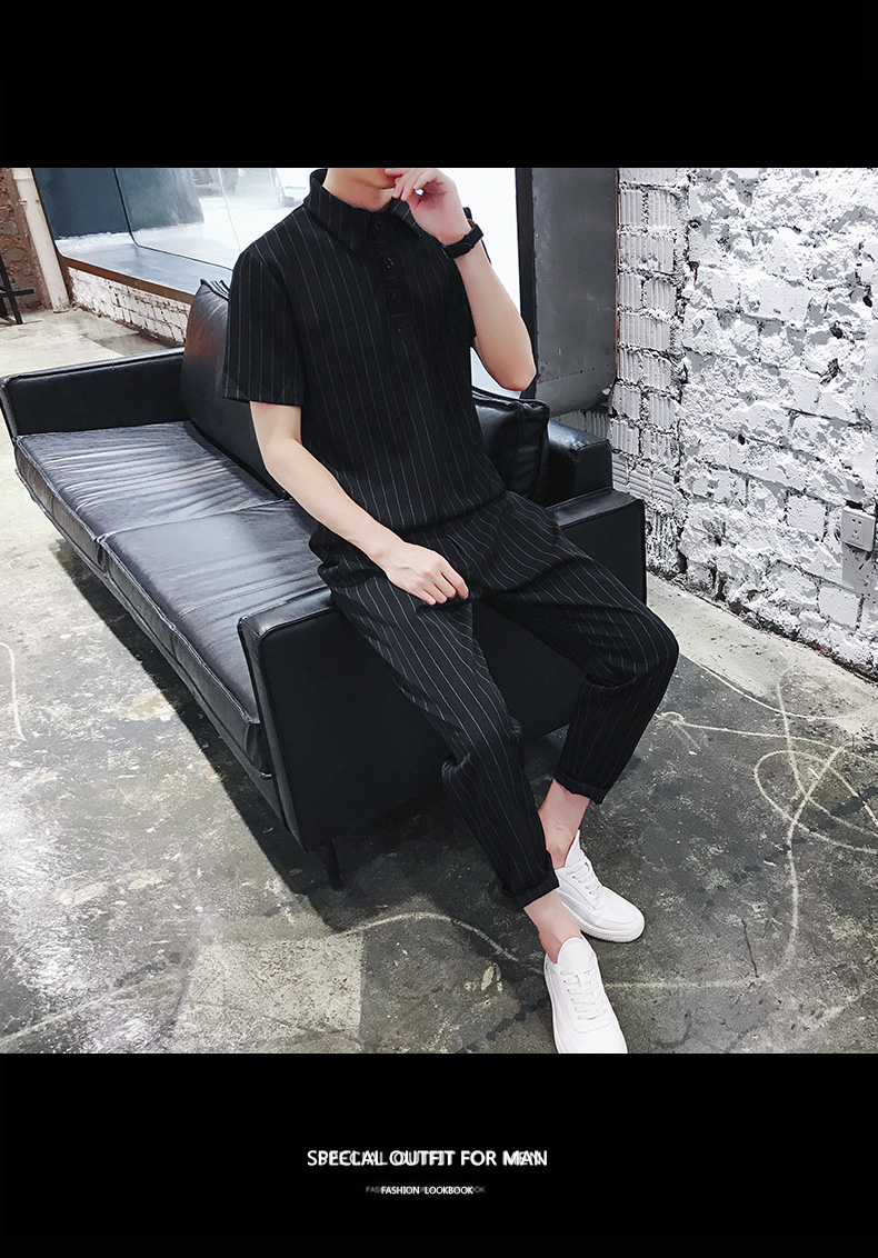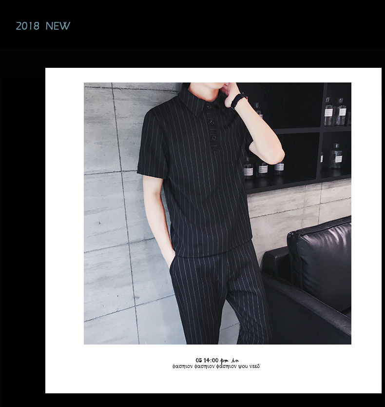 2019夏季新款條紋九分褲男一套裝大碼兩件套休閑短袖POLO上衣服潮