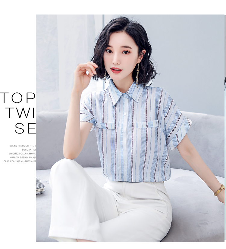 2019春裝上新女士雪紡衫洋氣短袖時尚潮流女裝氣質條紋襯衫上衣女