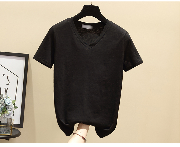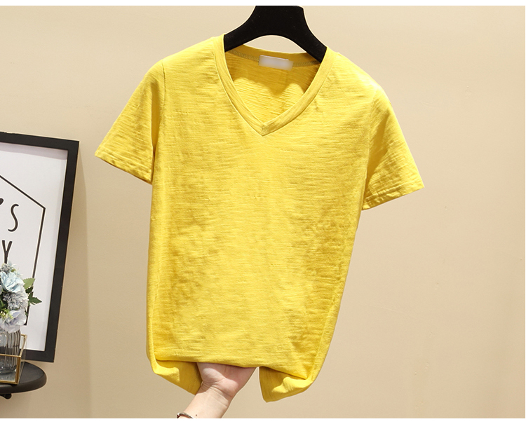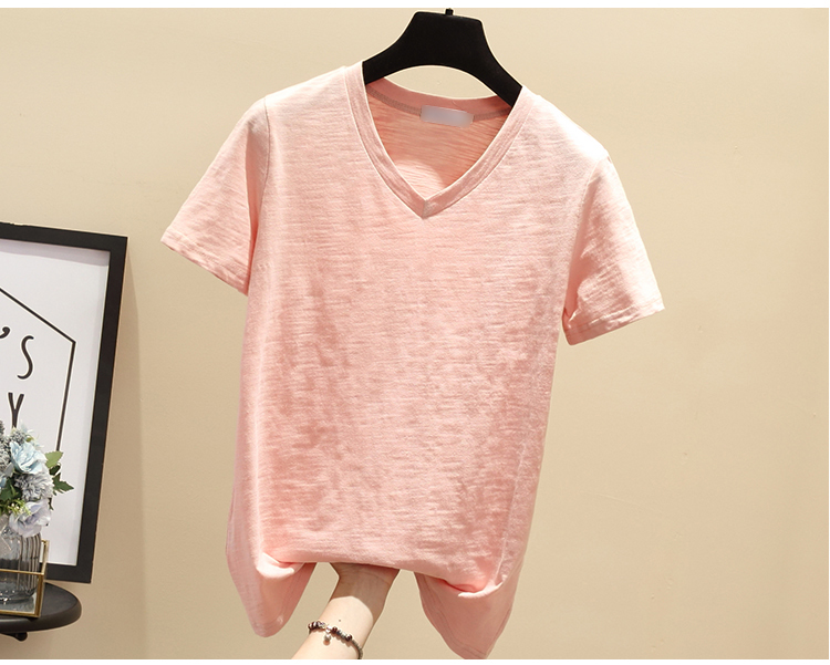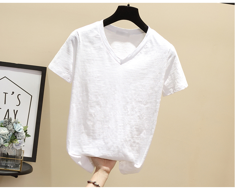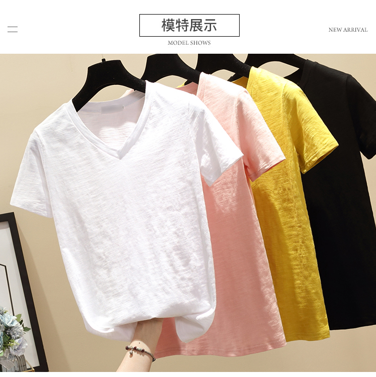 2019韓版簡約學生夏季白色短袖T恤女V領寬松竹節純棉百搭體恤上衣