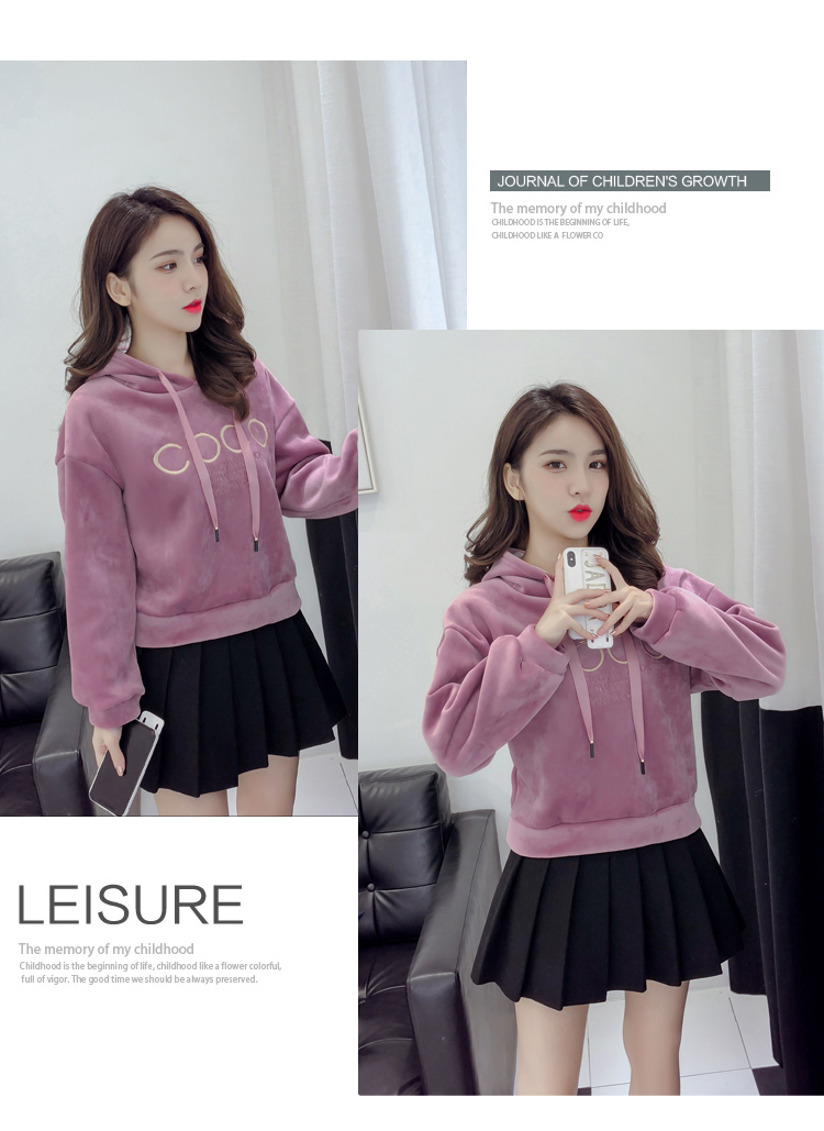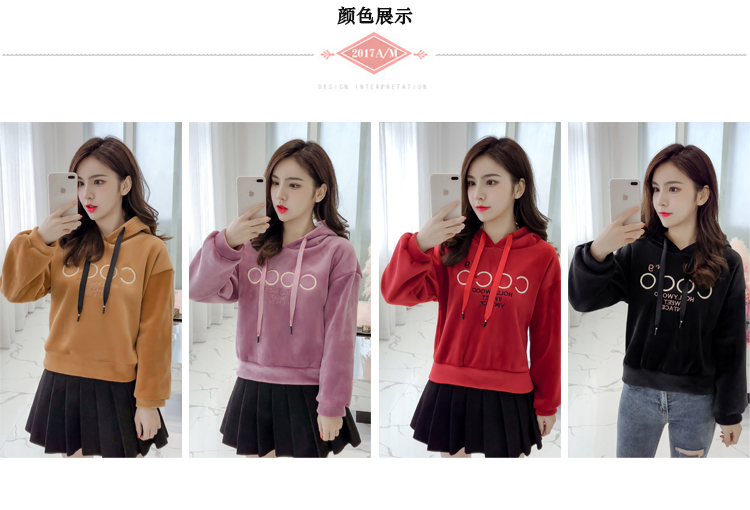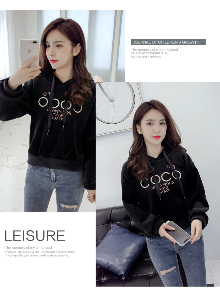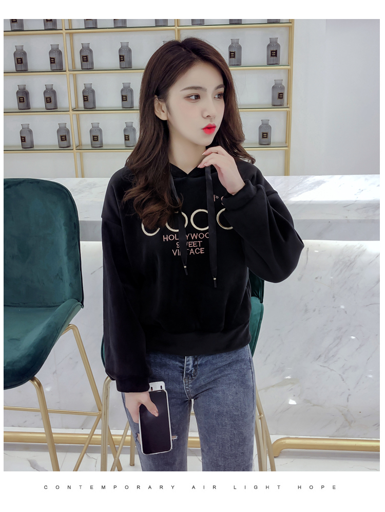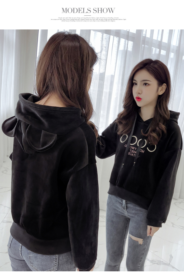 金絲絨短款衛衣女加絨加厚秋冬季新款寬松韓版慵懶風連帽刺繡上衣