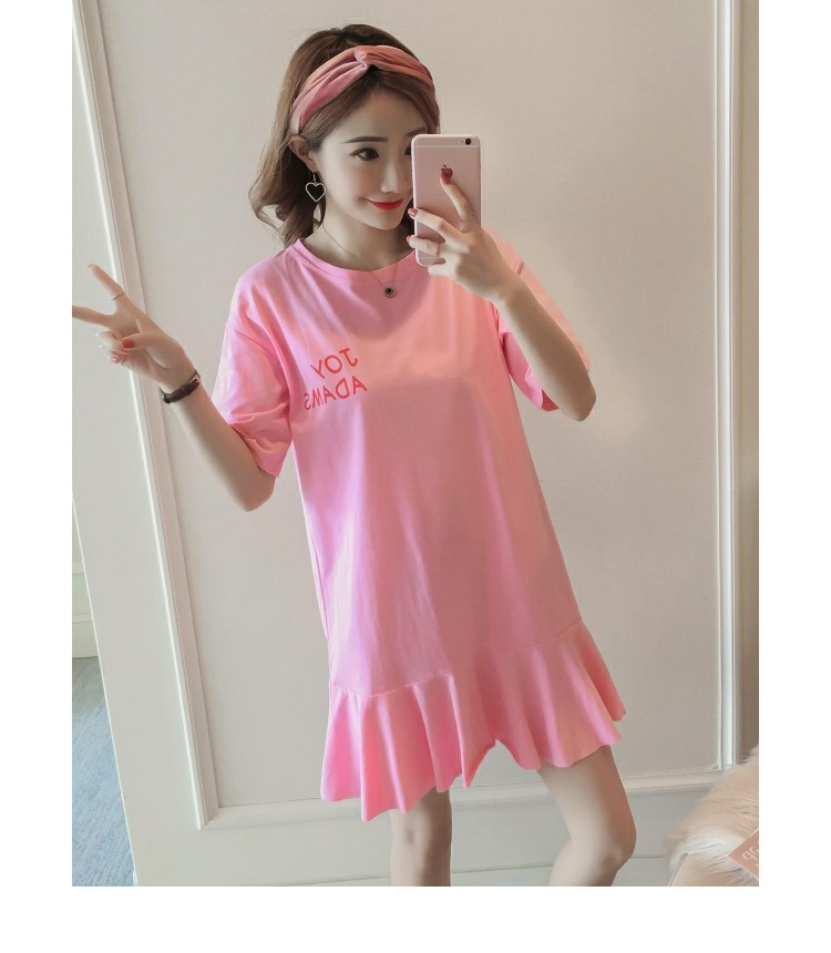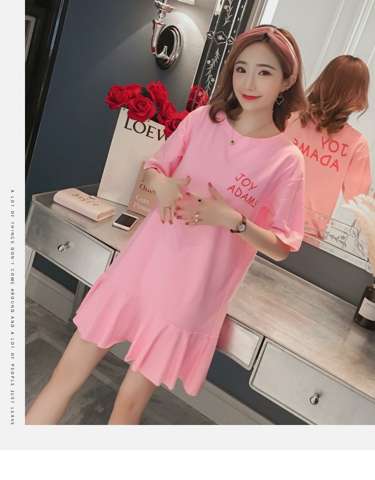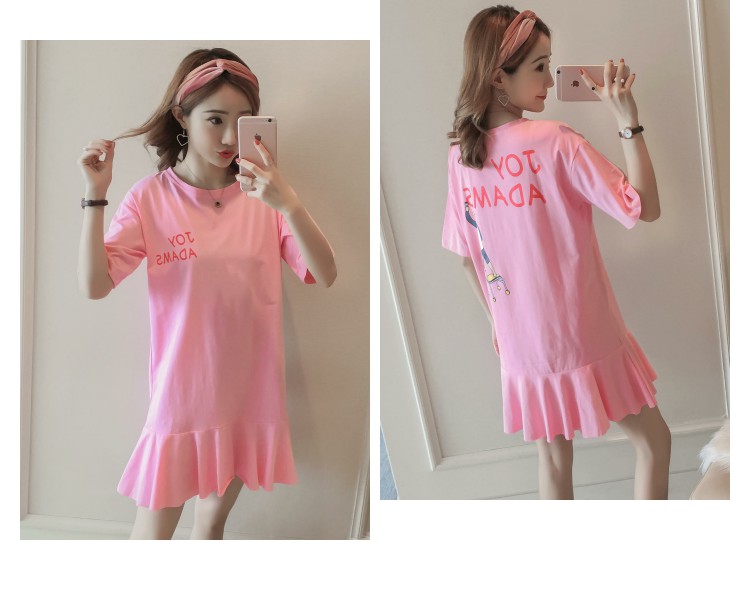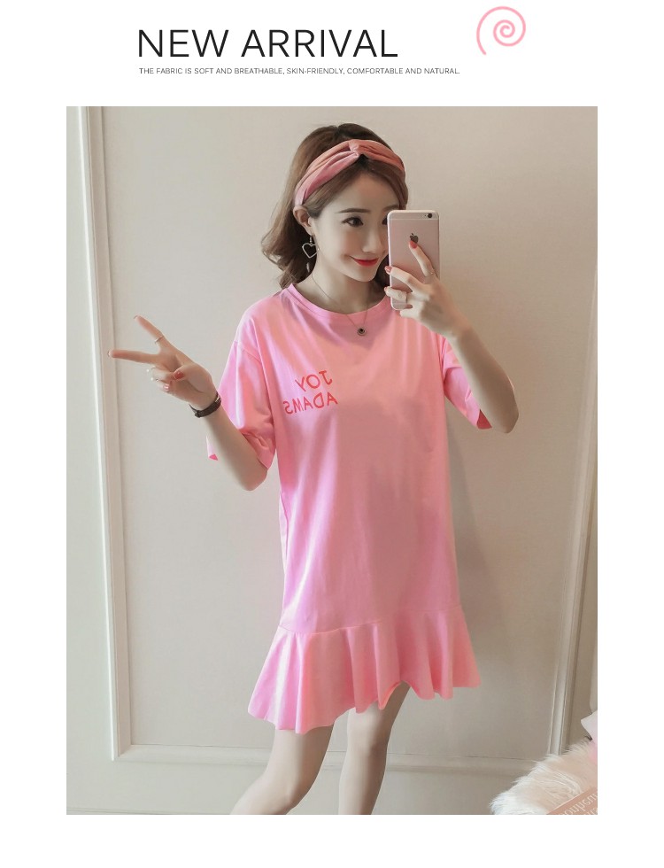韓范夏裝寬松印花魚尾中長款短袖T恤裙純棉荷葉邊大碼連衣裙女秋
