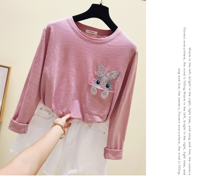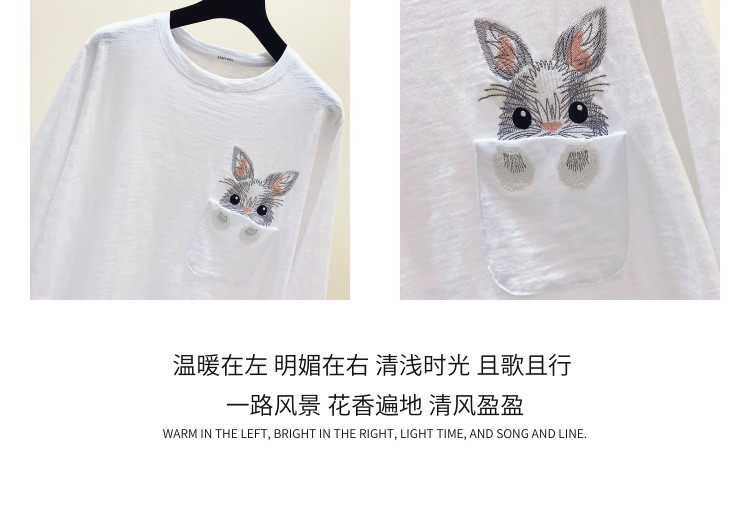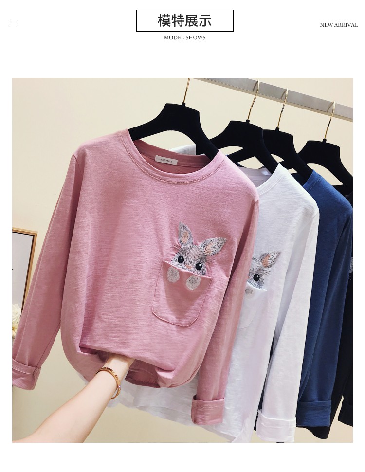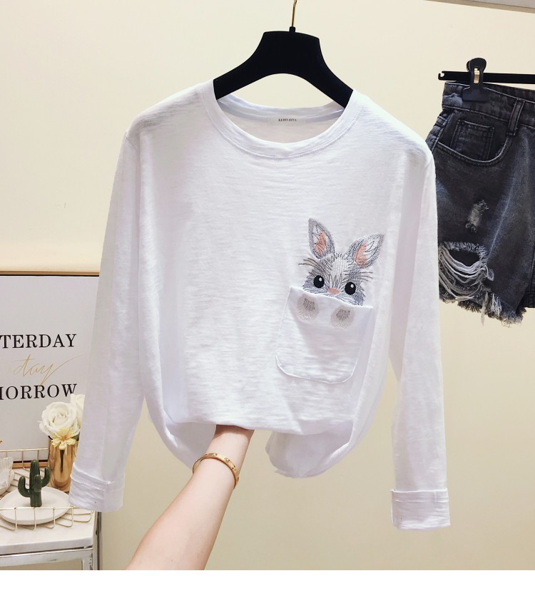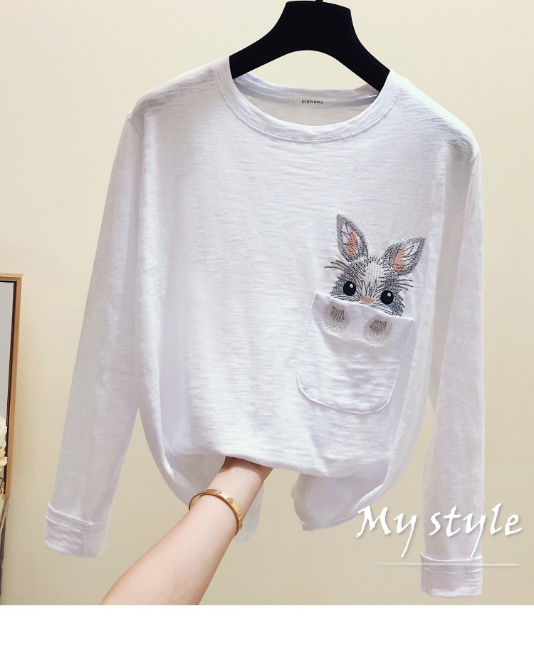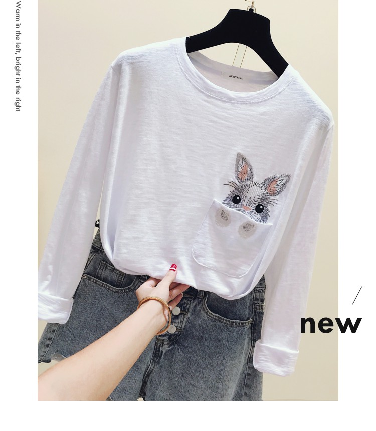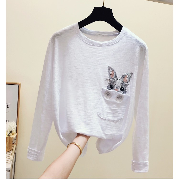2019春裝新款韓版大碼夏季寬松竹節棉長袖白色T恤女兔子刺繡上衣