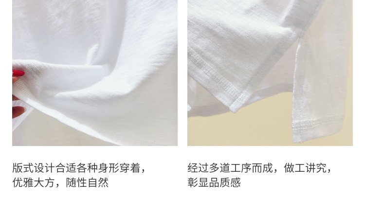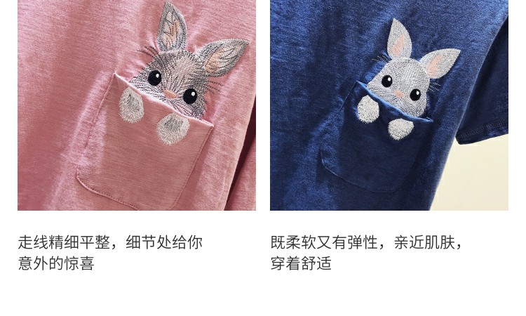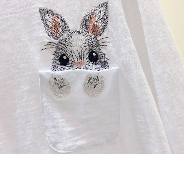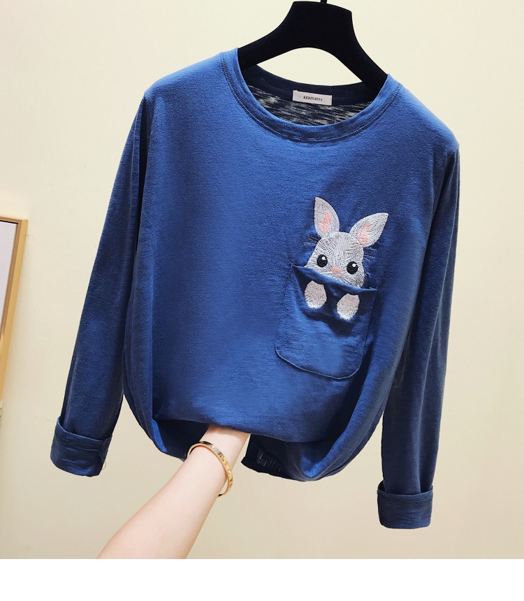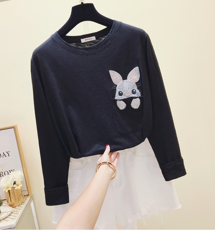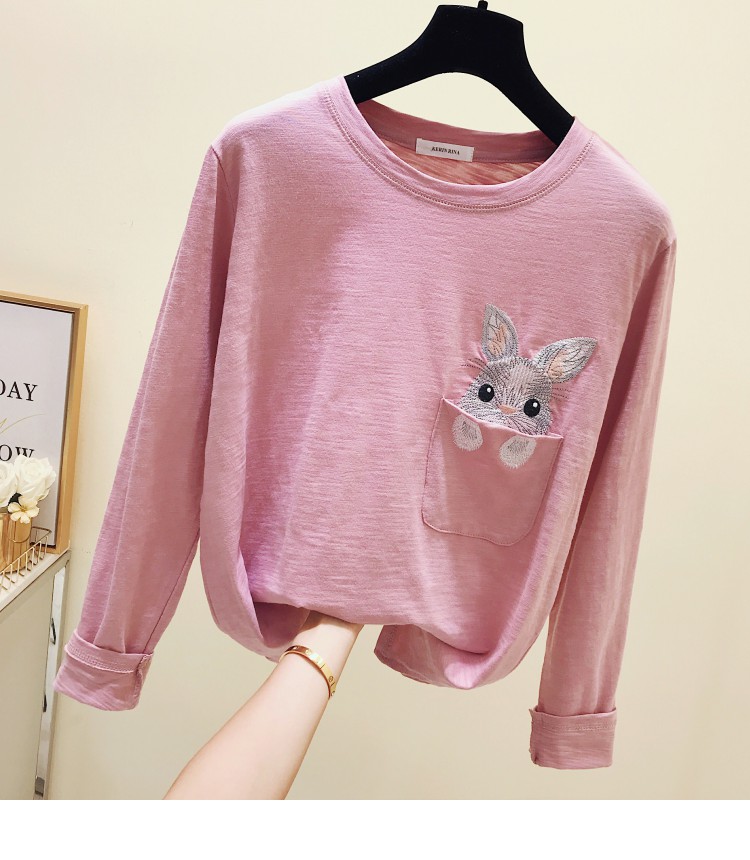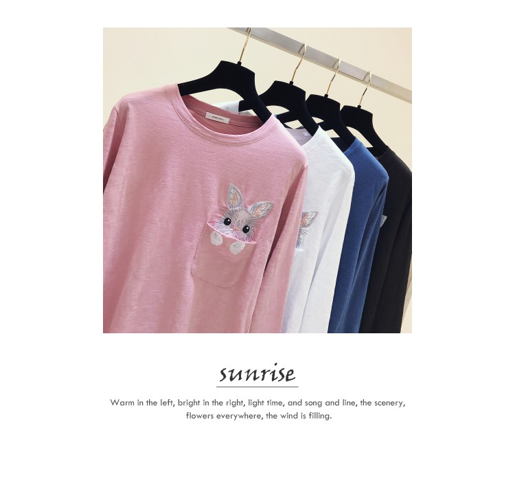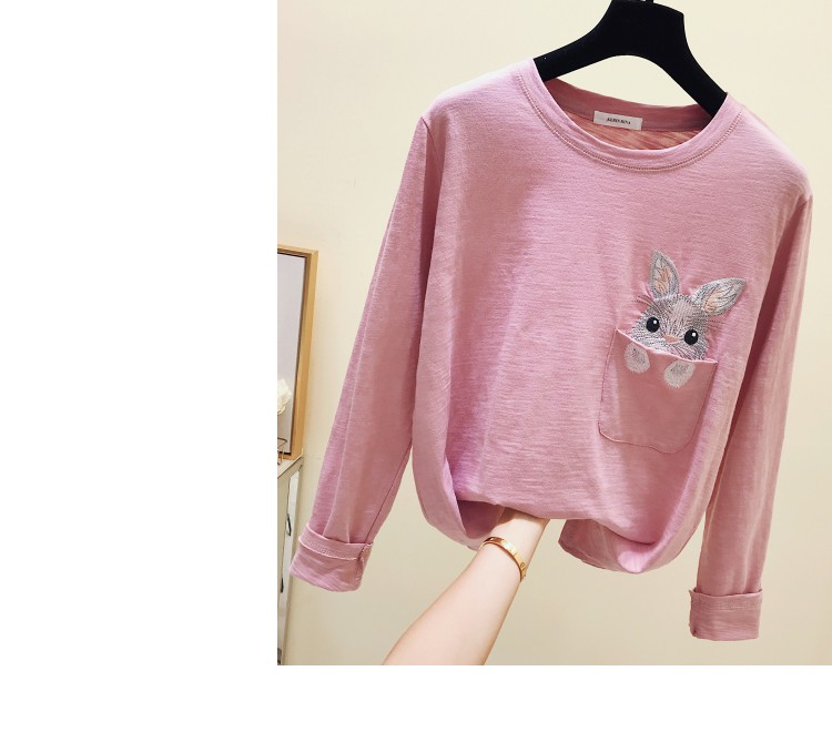 2019春裝新款韓版大碼夏季寬松竹節棉長袖白色T恤女兔子刺繡上衣