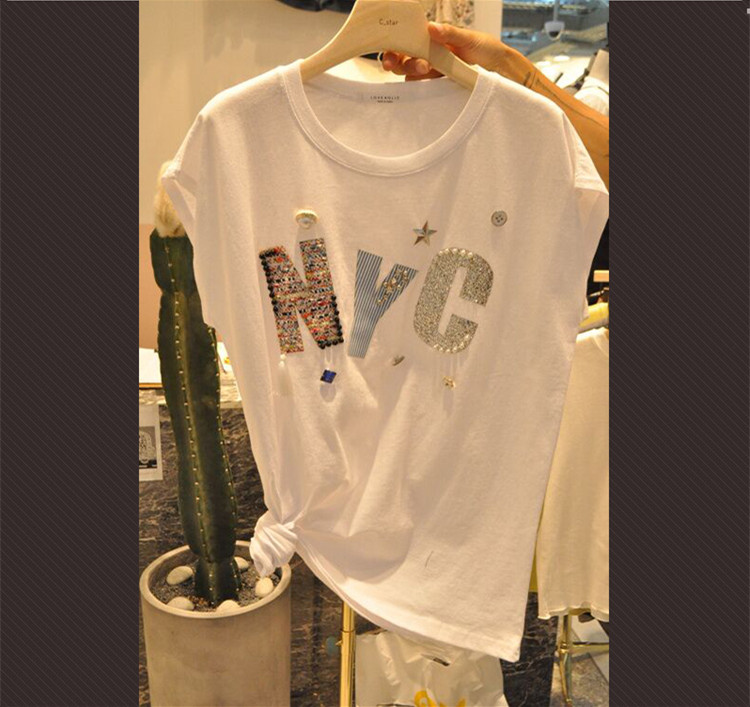 2019春夏裝新款韓版夏季新款寬松白色短袖T恤女字母釘珠簡約上衣