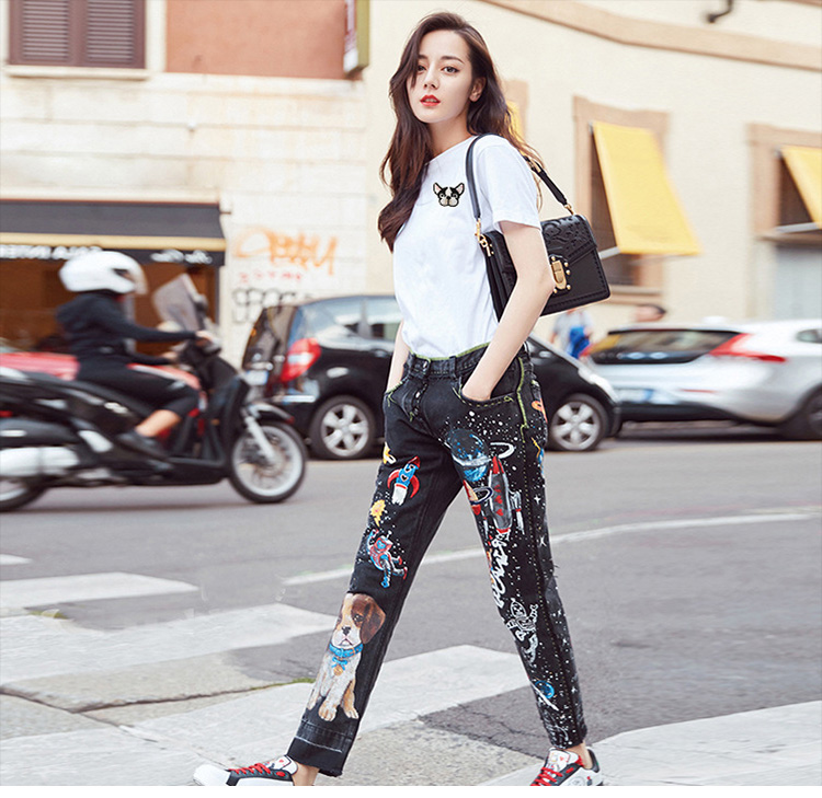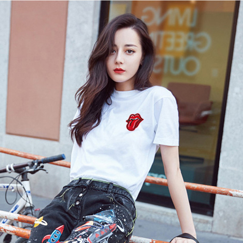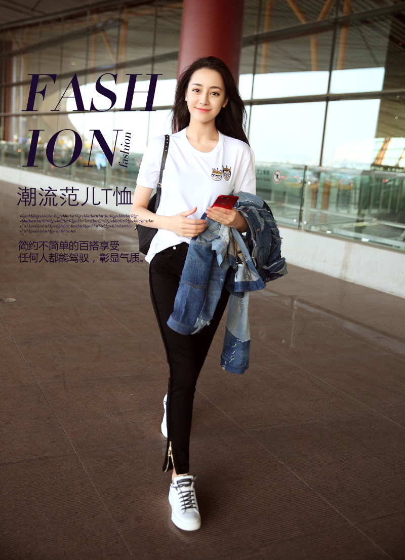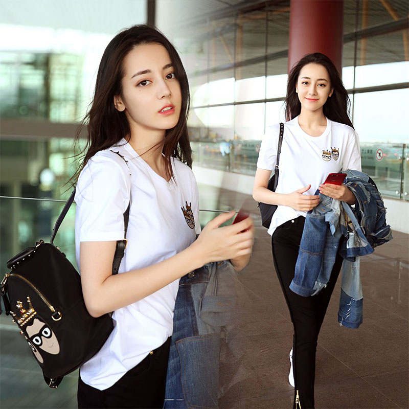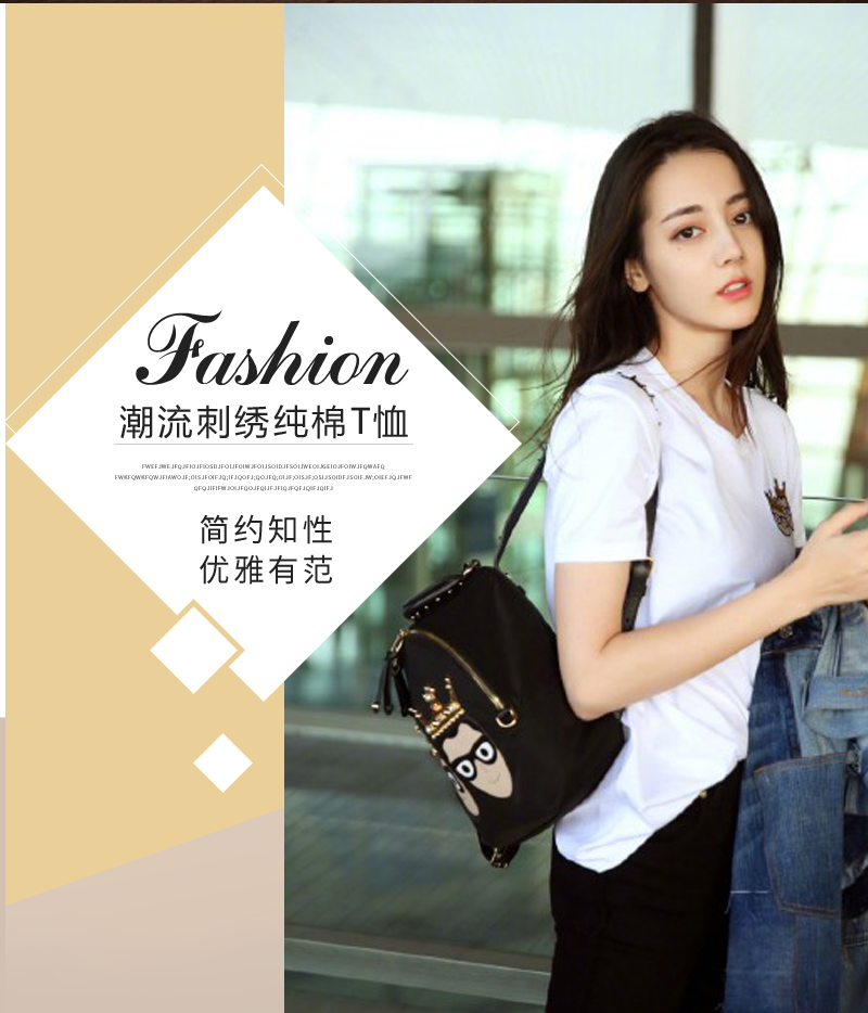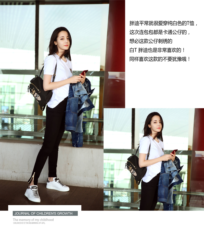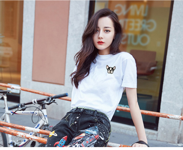 迪麗熱巴明星同款2019夏裝公仔刺繡純棉圓領短袖T恤女白色上衣潮