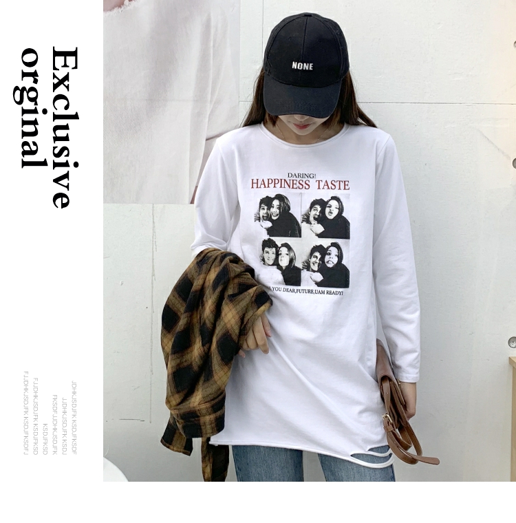 2019春裝新款初春秋上衣服韓版中長款T恤女下擺破洞白色打底衫潮