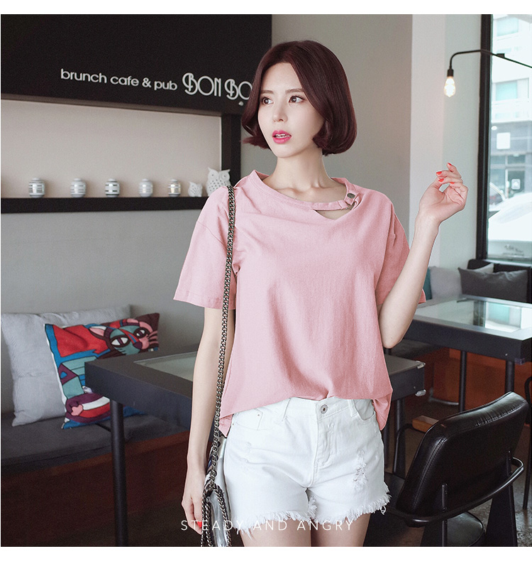 韓國短袖女2019夏裝新款純棉個性v領t恤女士寬松百搭韓范純色上衣